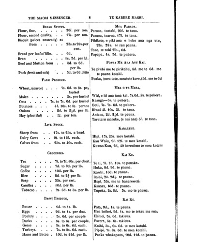 THE MA0RI MESSENGER. 8 TE KARERE MAORI BREAD STUFFS. Flour, fine, ..... 201. per ton. Flour, second quality, 171. per ton. Biscuit (prices unsteady) at from ..... 23s.to28s.per cwt. Bread per loafof2lbs. . . 6d. Bran ...... ls.3d.perbl. Beef and Mutton from . . 5d. to 6d. per Ib. Pork (fresh and salt) . . 5d.to 6d.ditto FARM PRODUCE. Wheat, (scarce) . . . 7s. 6d. to 8s. per. bushel Maize ....... 5s. per bushel Oats . . . . 7s. to 7s. 6d. per bushel Potatoes . . . 4110s.to 51. per ton Onions .... 2d. to 2d. per Ib. Hay (plentiful) . . 51. per ton. LIVE STOCK.] Sheep from . . 17s. to 25s. a head. Dairy Cows . . 92. to 121. each. Calves from . . 25s. to 40s. each. GROCERIES. Tea .... 71. to 71, 10s. per chest. Sugar . . . . 7d. to 8d. per Ib. Coffee . . . . 10d. per Ib. Rice . . . . 2d. to 2 per Ib. Soap . . . . 35s. per cwt. Candles . . . .10 per Ib. Tobacco . . . . 2s. 6d. to 3s. per Ib. DAIRY PRODUCE, Butter . . . . 9d. to Is. Ib. Eggs . ., . 9d. to Is. per doz. Poultry . . . . 3s. 6d. per couple Ducks . . . . 5s. to 6s. per couple. Geese . . . . 5s. to 6s. 6d. each. Turkeys. ... 7s. to 8s. 6d. each. Hams and Bacon .10 to 11d. per Ib. MEA PARAOA. Paraoa, tuatahi, 201 te tana. Paraoa, tuarua, 171 te tana. Pihikete, e piki ana e heke ana nga utu, 23s. 28s. te rau pauna. Taro, te rohi 21b., 6d. Papapa, Is. 3d. te puhera. POAKA ME ARA ATU KAI. Te piwhi me te pirikahu, 5d. me te 6d. mo te pauna kotahi. Poaka, (mea tote, mea tote kore,) 5d. me te 6d MEA o TE MARA, Witi, e iti ana taua kai, 7s.6d., 8s.te puhera. Kaanga—5s. te puhera. Ooti, 7s. 7s. 6d. te puhera. Riwai 41 10s. 51 te tana. Aniana, 2d. 2d. te pauna. Tarutaru maroke, (e nui ana) 51. te tana. KARAREHE. Hipi, 17s. 25s. mea kotahi. Kau Waiu, 91 121. te mea kotahi. Kuwao Kau, 25, 40 hereni mo te mea kotahi i KAI KE. Te ti, 11.11. 10s. te pouaka. Huka, 8d. 9d. te pauna. Kawhi, 10d. te pauna. Raihi, 2d. 2d. te pauna. Hopi, 35s. mo te hanareweti. Kanara, 10d. te pauna. Tupeka, 2s. 6d. 3s. mo te pauna. KAI KE. Pata, 9d., 1s. te pauna. Hua heihei. 9d. Is. mo te tekau ma rua . Heihei, 5s. 6d. takirua. Parera, 5s. 6s. takirua. Kuihi, 5s., 6s. 6d. te mea kotahi. Pipipi, 7s. 8s. 6d. te mea kotahi. Poaka whakapaoa, 10d. 11d. te pauna.
