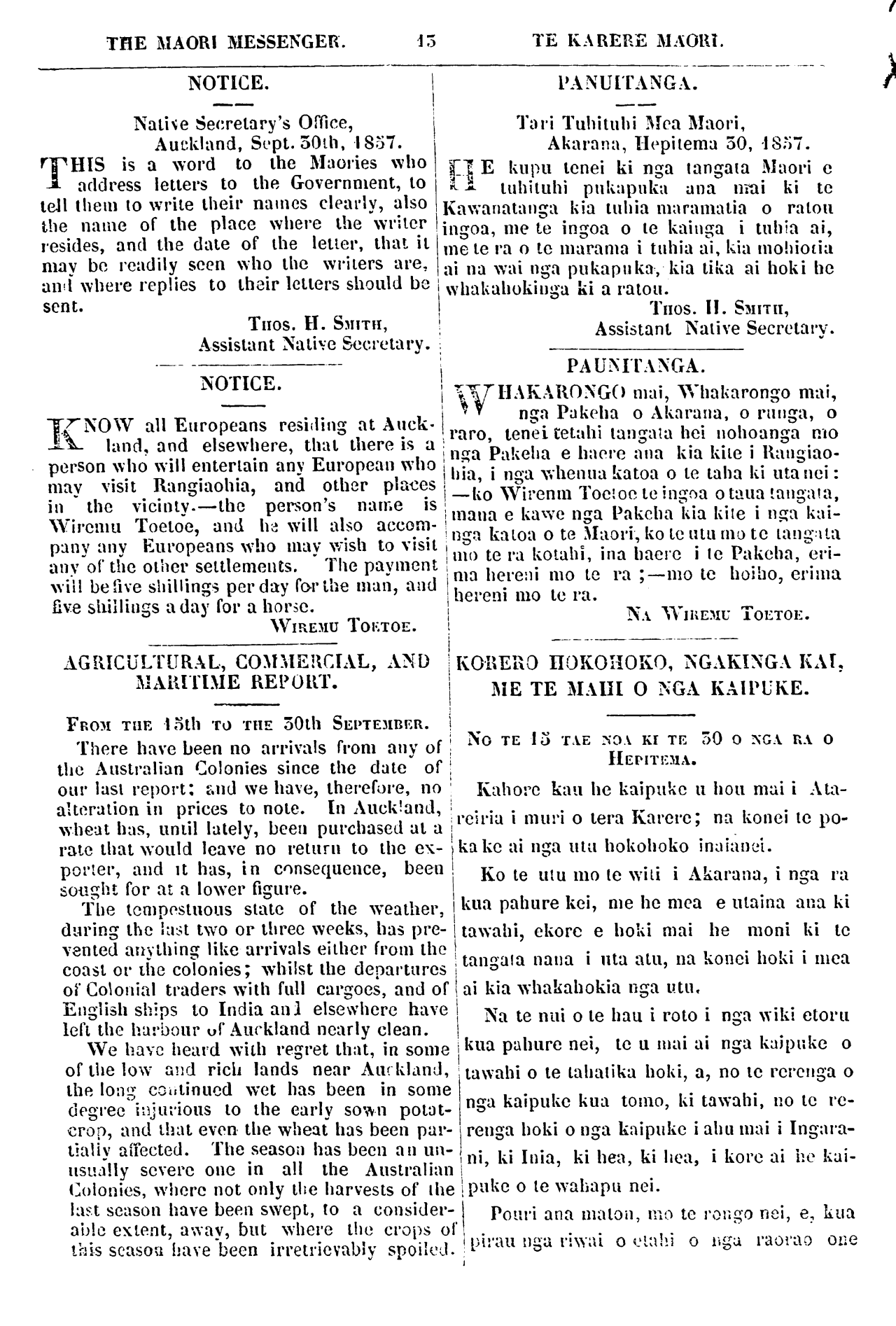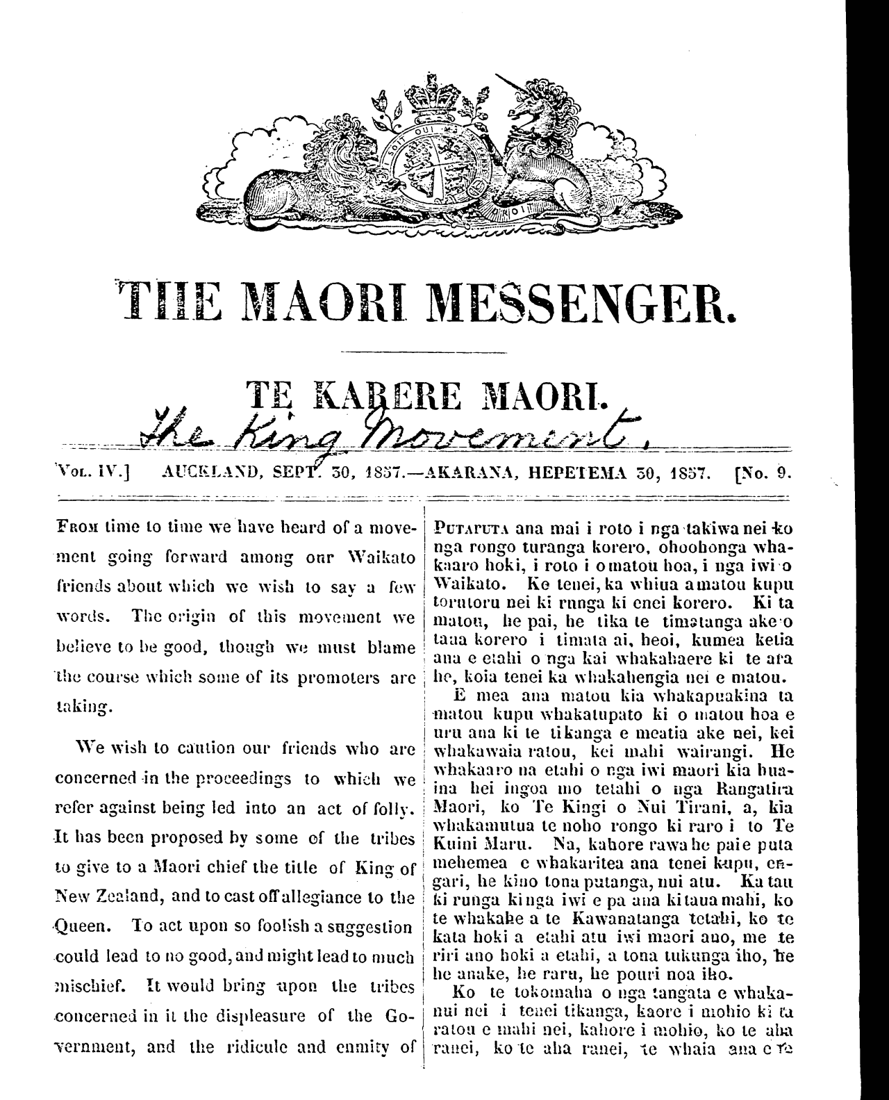 The Maori Messenger - Ko te Karere Maori 1855-1860: Volume 4, Number 9. 30 September 1857 |