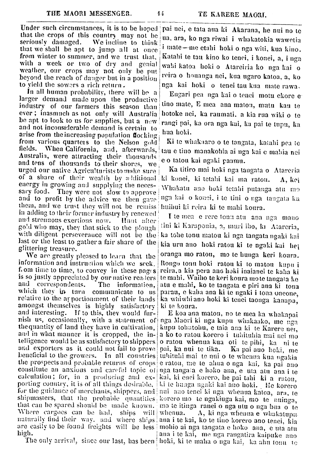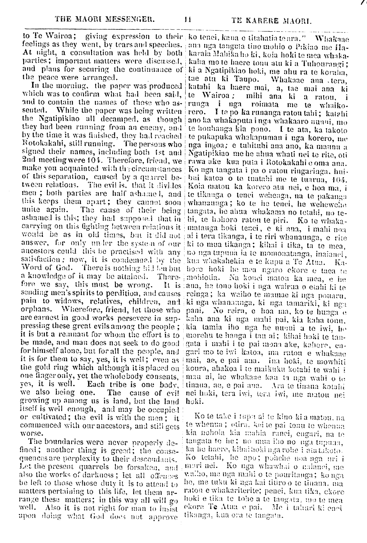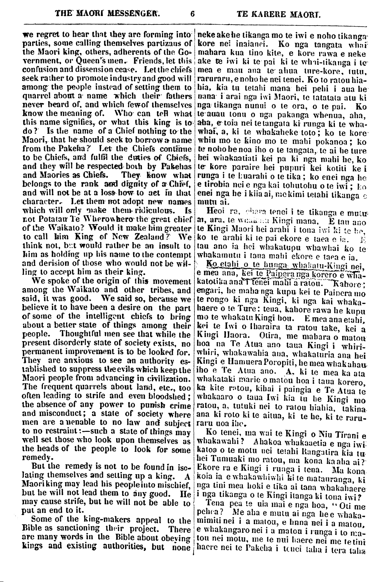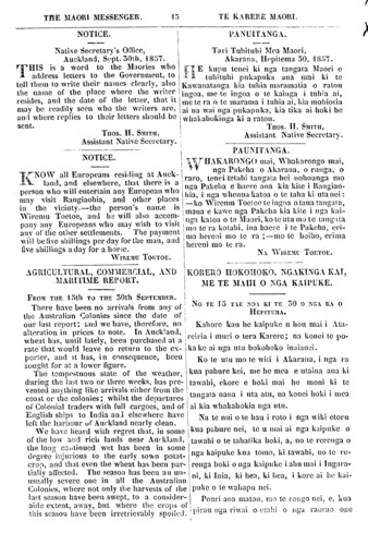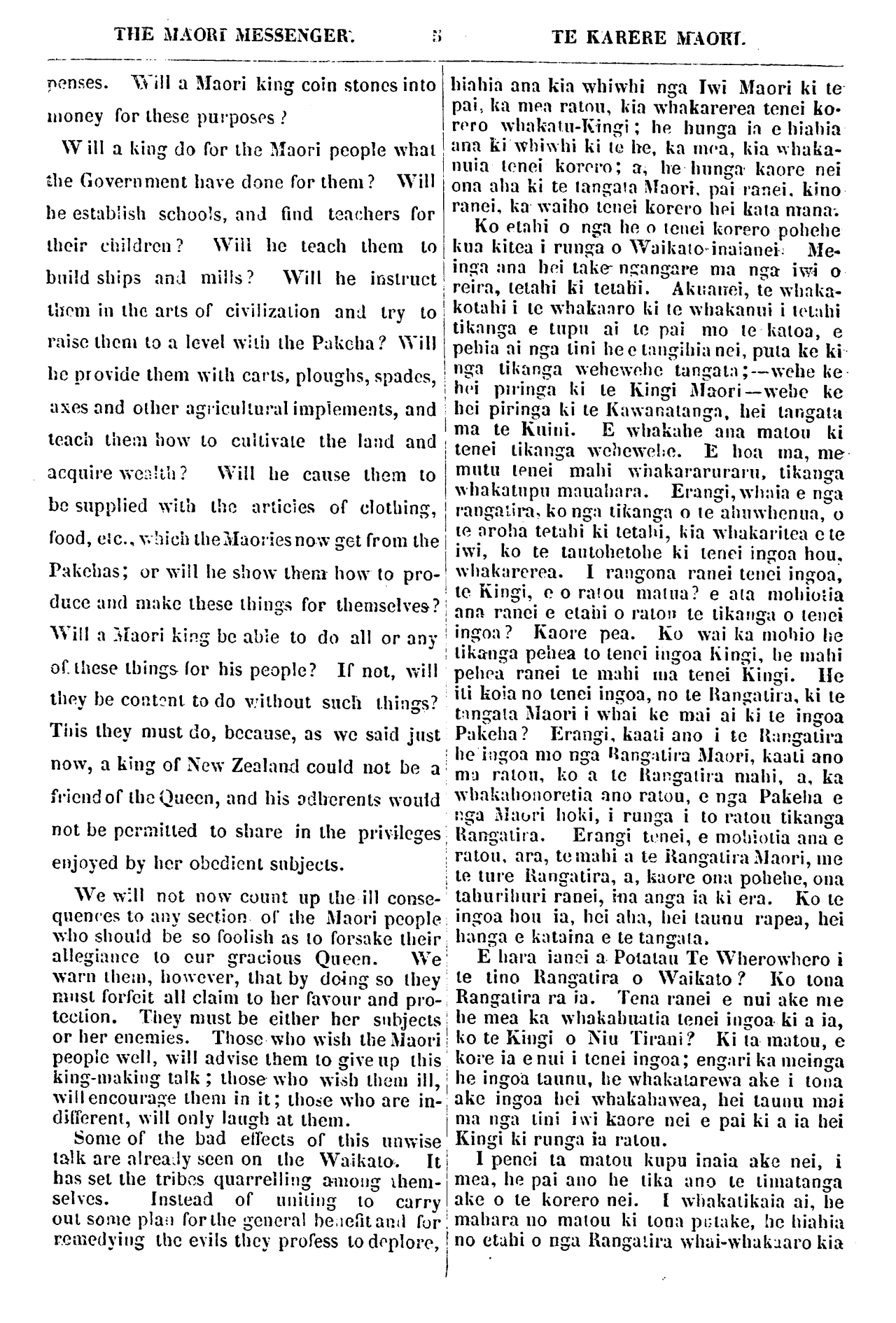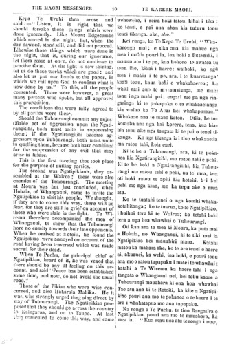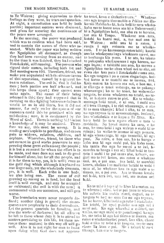 THE MAORI MESSENGER. TE KARERE MAORI. VOL. IV.] AUCKLAND, SEPT 30, 1857. AKARANA, HEPETEMA 30, 1857. [No. 9. FROM time to time we have heard of a move- ment going forward among our Waikato friends about which we wish to say a few words. The origin of this movement we believe to be good, though we must blame the course which some of its promoters are taking. We wish to caution our friends who are concerned in the proceedings to which we refer against being led into an act of folly. It has been proposed by some of the tribes to give to a Maori chief the title of King of ? sew Zealand, and to cast off allegiance to the Queen. To act upon so foolish a suggestion could lead to no good, and might lead to much mischief. It would bring upon the tribes concerned in it the displeasure of the Go- vernment, and the ridicule and enmity of PUTAPUTA ana mai i roto i nga takiwa nei ko nga rongo turanga korero, ohoohonga wha- kaaro hoki, i roto i o matou hoa, i nga iwi o Waikato. Ke tenei, ka whiua a matou kupu torutoru nei ki runga ki enei korero. Ki ta matou, he pai, he tika te timatanga ake o taua korero i timata ai, heoi, kumea ketia ana e etahi o nga kai whakahaere ki te ara he, koia tenei ka whakahengia nei e matou. E mea ana matou kia whakapuakina ta i matou kupu whakatupato ki o matou hoa e uru ana ki te tikanga e meatia ake nei, kei whakawaia ratou, kei mahi wairangi. He whakaaro na etahi o nga iwi maori kia hua- ina hei ingoa mo tetahi o nga Rangatira Maori, ko Te Kingi o Nui Tirani, a, kia whakamutua te noho rongo ki raro i to Te Kuini Maru. Na, kahore rawa he pai e puta mehemea e whakaritea ana tenei kupu, en- gari, he kino tona putanga, nui atu. Ka tau ki runga ki nga iwi e pa aua ki taua mahi, ko te whakahe a te Kawanatanga tetahi, ko te kata hoki a etahi atu iwi maori ano, me te riri ano hoki a etahi, a tona tukunga iho, he he anake, he raru, he pouri noa iho. Ko te tokomaha o nga tangata e whaka- nui nei i tenei tikanga, kaore i mohio ki ta ratou e mahi nei, kahore i mohio, ko te aha ranei, ko te aha ranei, te whaia ana e te