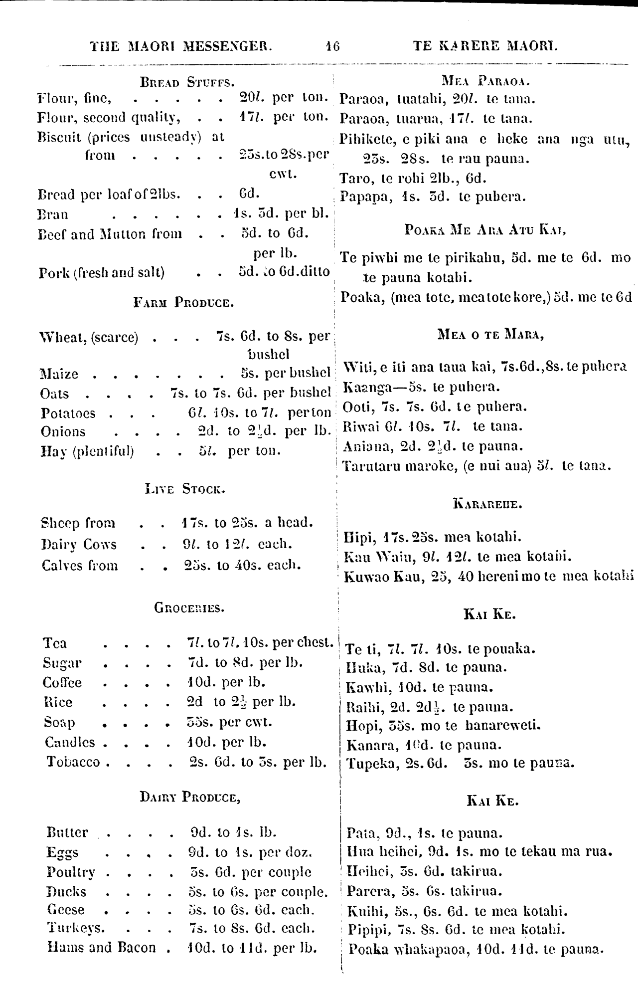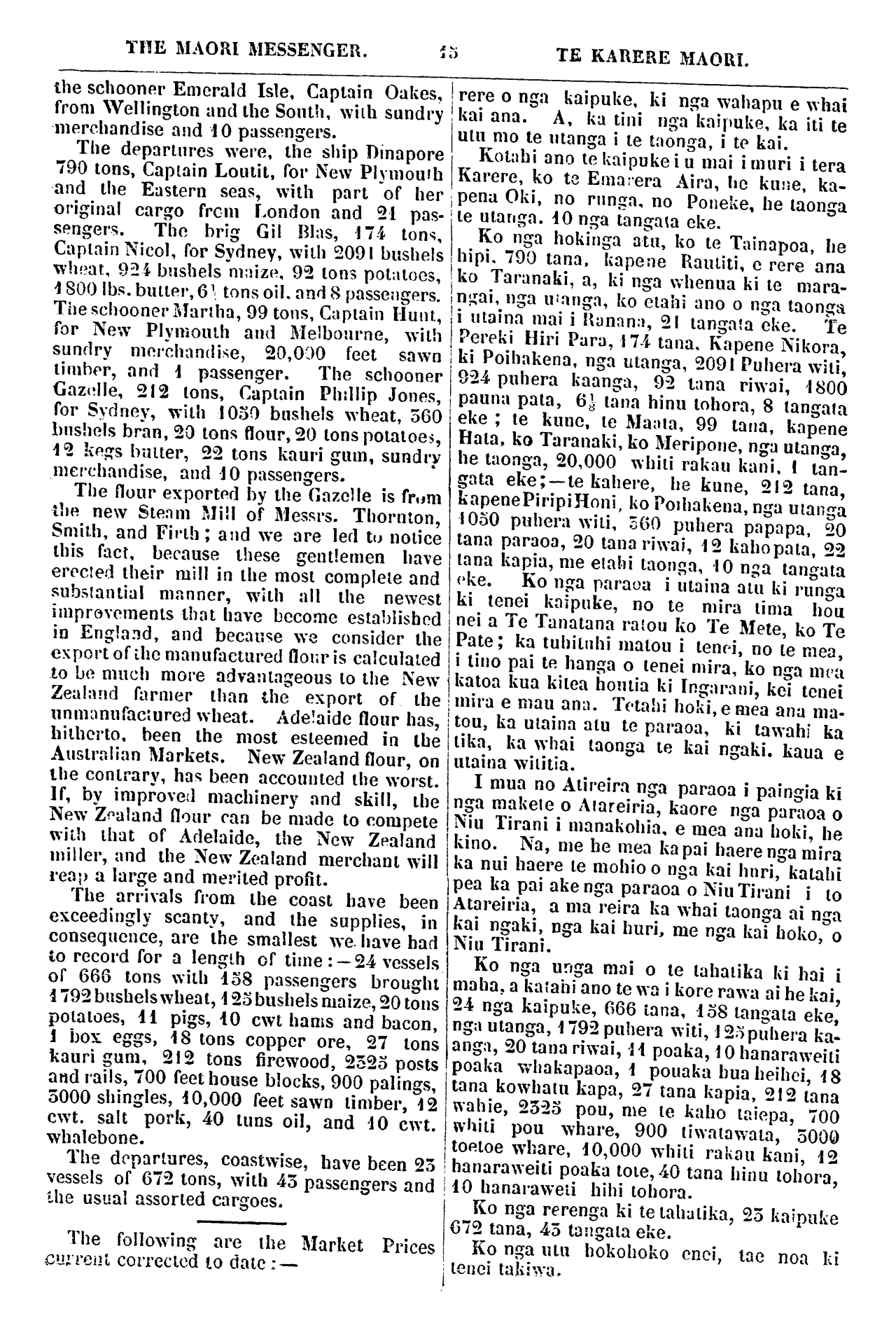 THE MAORI MESSENGER 15 TE KARERE MAORI. the schooner Emerald Isle, Captain Oakes, from Wellington and the South, with sundry merchandise and 10 passengers. The departures were, the ship Dinapore 790 tons, Captain Loutit, for New Plymouth and the Eastern seas, with part of her original cargo from London and 21 pas- sengers. The brig Gil Blas, 174 tons, Captain Nicol, for Sydney, with 2091 bushels wheat, 924 bushels maize 92 tons potatoes 1800 lbs. butter, 6 tons oil. and 8 passengers. The schooner Martha, 99 tons, Captain Hunt, for New Plymouth and Melbourne, with sundry merchandise, 20, 090 feet sawn timber, and 1 passenger. The schooner Gazelle, 212 tons, Captain Philip Jones, for Sydney, with 1050 bushels wheat, 560 bushels bran, 20 tons flour, 20 tons potatoes, 12 kegs butter, 22 tons kauri gum, sundry merchandise, and 40 passengers. The flour exported by the Gazelle is from the new Steam Mill of Messrs. Thornton, Smith, and Firth; and we are led to notice this fact, because these gentlemen have erected their mill in the most complete and substantial manner, with all the newest improvements that have become established in England, and because we consider the export of the manufactured flour is calculated to be much more advantageous to the New Zealand farmer than the export of the unmanufactured wheat. Adelaide flour has, hitherto. been the most esteemed in the Australian Markets. New Zealand flour, on the contrary, has been accounted the worst. If, by improved machinery and skill, the New Zealand flour can be made to compete with that of Adelaide, the New Zealand miller, and the New Zealand merchant will reap a large and merited profit. The arrivals from the coast have been exceedingly scanty, and the supplies, in consequence, are the smallest we have had to record for a length of time: 24 vessels of 666 tons with 158 passengers brought 1 792 bushels wheat, 125 bushels maize, 20 tons potatoes, 11 pigs, 10 cwt hams and bacon, 1 box eggs, 18 tons copper ore, 27 tons kauri gum, 212 tons firewood, 2523 posts and rails, 700 feet house blocks, 900 palings, 5000 shingles, 10, 000 feet sawn timber, 12 cwt. salt pork, 40 tuns oil, and 10 cwt. whalebone. The departures, coastwise, have been 25 vessels of 672 tons, with 43 passengers and ihe usual assorted cargoes. The following are the Market Prices current corrected to date: rere o nga kaipuke, ki nga wahapu e whai kai ana. A, ka tini nga kaipuke, ka iti te utu mo te utanga i te taonga, i te kai. Kotahi ano te kaipuke i u mai i muri i tera Karere, ko te Emarera Aira, he kune, ka- pena Oki, no runga, no Poneke, he taonga te utanga. 10 nga tangata eke. Ko nga hokinga atu, ko te Tainapoa, he hipi, 790 tana, kapene Rautiti, e rere ana ko Taranaki, a, ki nga whenua ki te mara- ngai, nga utangaanga, ko etahi ano o nga taonga i utaina mai i Ranana, 21 tangata eke. Te Pereki Hiri Para, 174 tana. Kapene Nikora, ki Poihakena, nga utanga, 2091 Puhera witi, 924 puhera kaanga, 92 tana riwai, 1800 pauna pata, 6 tana hinu tohora, 8 tangata eke; te kune, te Maata, 99 tana, kapene Hata, ko Taranaki, ko Meripone, nga utanga, he taonga, 20, 000 whiti rakau kani. 1 tan- gata eke; te kahere, he kune, 212 tana. kapene Piripi Honi, ko Poihakena, nga utanga 1050 puhera witi, 500 puhera papapa, 20 tana paraoa, 20 tana riwa, 12 kaho pata, 22 tana kapia, me etahi taonga, IO nga tangata eke. Ko nga paraoa i utaina atu ki runga ki tenei kaipuke, no te mira tima hou nei a Te Tanatana ratou ko Te Mete, ko Te Pate; ka tuhituhi matou i tenei, no te mea, i tino pai te hanga o tenei mira, ko nga mea katoa kua kitea houtia ki Ingarani, kei tenei mira e mau ana. Tetahi hoki, e mea ana ma- tou, ka utaina atu te paraoa, ki tawahi ka tika, ka whai taonga te kai ngaki, kaua e utaina wititia. I mua no Atireira nga paraoa i paingia ki nga makete o Atareiria, kaore nga paraoa o Niu Tirani i manakohia, e mea ana hoki, he kino. Na, me he mea ka pai haere nga mira ka nui haere te mohio o nga kai huri, katahi pea ka pai ake nga paraoa o Niu Tirani i to Atareiria, a ma reira ka whai taonga ai nga kai ngaki, nga kai huri, me nga kai hoko, o Niu Tirani. Ko nga unga mai o te tahatika ki hai i maha, a katahi ano te vva i kore rawa ai he kai, 24 nga kaipuke 666 tana, 158 tangata eke, nga utanga, 1792 puhera witi, 1 25 puhera ka- anga, 20 tana riwai, 11 poaka, 10 hanaraweiti poaka whakapaoa, 1 pouaka hua heihei, 18 tana kowhatu kapa, 27 tana kapia, 212 tana wahie, 2325 pou, me te kaho taiepa, 700 whiti pou whare, 900 tiwatawata, 5000 toetoe whare, 10, 000 whiti rakau kani, 12 1 hanaraweiti poaka tote, 40 tana hinu tohora, 10 hanaraweti hihi tohora. Ko nga rerenga ki te tahatika, 23 kaipuke 672 tana, 43 tangata eke. Ko nga utu hokohoko enei, tae noa Li I tenei takiwa,