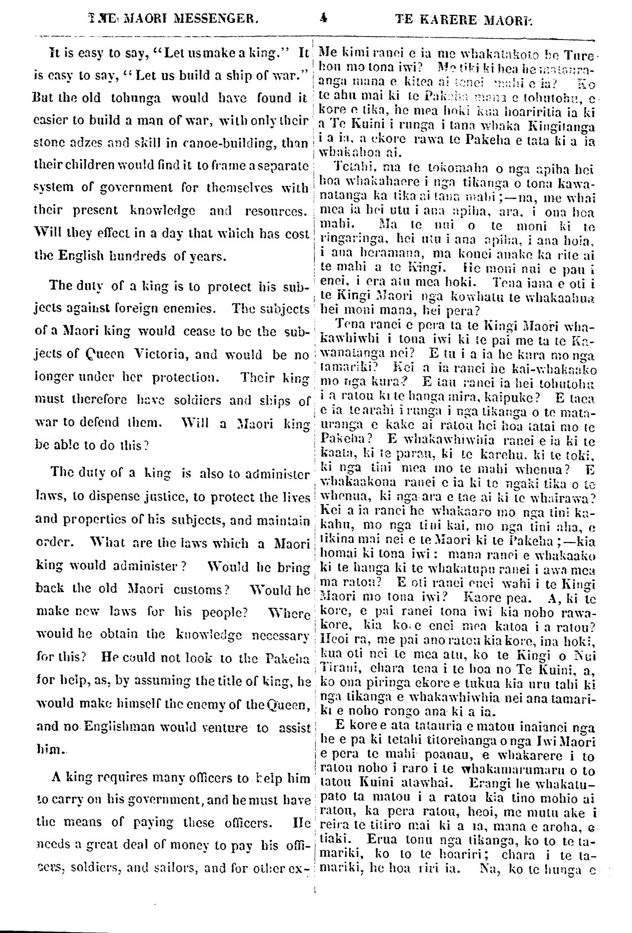 THE MAORI MESSENGER. 4 TE KARERE MAORI It is easy to say, ""Let us make a king." It is easy to say, " Let us build a ship of war." But the old tohunga would have found it easier to build a man of war, with only their stone adzes and skill in canoe-building, than their children would find it to frame a separate system of government for themselves with their present knowledge and resources. Will they effect in a day that which has cost the English hundreds of years. The duly of a king is to protect bis sub- jects against foreign enemies. The subjects of a Maori king would cease to be the sub- jects of Queen Victoria, and would be no longer under her protection. Their king must therefore have soldiers and ships of war to defend them. Will a Maori king be able to do this? The duty of a king is also to administer laws, to dispense justice, to protect the lives and properties of his subjects, and maintain order. What are the laws which a Maori king would administer? Would he bring back the old Maori customs? Would he make new laws for his people? Where would he obtain the knowledge necessary for this? He could not look to the Pakeha for help, as, by assuming the title of king, he would make himself the enemy of the Queen, and no Englishman would venture to assist him. A king requires many officers to help him to carry on his government, and he must have the means of paying these officers. He needs a great deal of money to pay his offi- cers, soldiers, and sailors, and for other ex- Me kimi ranei e ia me whakatakoto he Ture hou mo tona iwi? M? 'U-'i id hea he ^•:'^.;;n- anga mana e kitea n1 h;;ie: '?:;;Iii c ia Ko te ahu mai ki [e P;ik ••;. •'; '-p.pi:j e lohnto'rs;'., c kore o tika, ho nipa hoki Lf,a lioaririlia ia ki a Te Kuini i runga i tanu whaka Kingitanga i i a i:i, a ^kore rawa te Pakeha e iaia ki a ia i vvliakribon ai. Tei,aSii. eia te tokomaha o nga apiha hoi ; hoa wSiakahaere i nga tikanga o tona kawa- natanga ka (ika ai (a!;r. ;'l'.;il'i;—na, me whai mea ia hoi utu i ana apiha, ara, i ona hoa mahi. Ma te nni o le moni ki ro rangaranga, hei nui 3 ana opii;a, i ana hoia, i i ana heramana, ma konei anake !<a rile ai , te mahi a lc K-ingL ne moni nui e pau i enei, i era ani mea hoki. Tena iana e oti i , te Kingi .Maori nga kowSialii te whakaahu;? hei moni mana, hei pera? Tona ranei e pera ia te Kingi iMaori wha- kawhiwlii i tona iwi ki [e pai me ta lc Ka- ,wanalanga nei? E lu i a ia he kura mo nga tarariki? Kei a ia ranei he kai-v,-haknako mo rrea kura? E laii ranei ia hei lolnilo!m i a ralou ki le hanga mira, kaipuke? E (.aea e ia learah'i i runga i Rea tikanga o te matri- uranga e kake ai ralo«.i hei hoa iaia! mo (e Pakeha? E whakawhiwhia ranei e ia ki te kaata, ki !e par?n, ki lc korehu, ki to toki", ki nga tini mea mo te mulii whenua? E v.whakaakona ranei e ia ki io ngaki tika o lc whenua, ki nga ara c tae ai ki le wha;irawa? Kei a ia ranei he whakaaro ino nga lin; ka- kahu, mo nga tini kai, mo nga lini aha, o likinanins nei e leMaori ki te Pakeha ;—kia homai ki tona iwi: mana ranei e whakaako ki te hanga ki te whakatu??! ranei i aw.t mea ma raio;'.? E oti ranei enei wahi i te Kingi Maori mo tona iwi? Kaorc pea. A, ki te kore, e p:n ranei tona iwi kia noho rawa- kore, kia ko.e enei moa katoa i a ralou? Heoi ra, me pai ano raio;! kia kore, ina hoki, kua oti nei lc mea atu, ko te Kingi o "Nui Tiiani, chara tena i te hoa no Te Kuini, a, ko ona piunga ekorc e tukua kia nril tahi ki nga tikanga e whakawhiwhia nei ana tamari- ki e noho rongo ana ki a ia. E kore e ata la!.auria e matou inaianei nga he e pa ki tetahi tilorebang'aonga IwiMaori e pera te main poauau, e whakarera i to raion nolio i raro i te whakamariimarn o to tatou Kuini atawhai. Erangi lie whakatu- pato ta matou i a ratou kia tino mohio ai ralou, ka pera ral.on, heoi, me nunu ake i reira te tiliro mai ki a ia, mana c aroha, e tiaki. Erua tonu nga tikanga, ko to te ia- mariki, ko io te hoariri; chara i te ia- mariki, he hoa uri ia. Na, ko te Siunga c