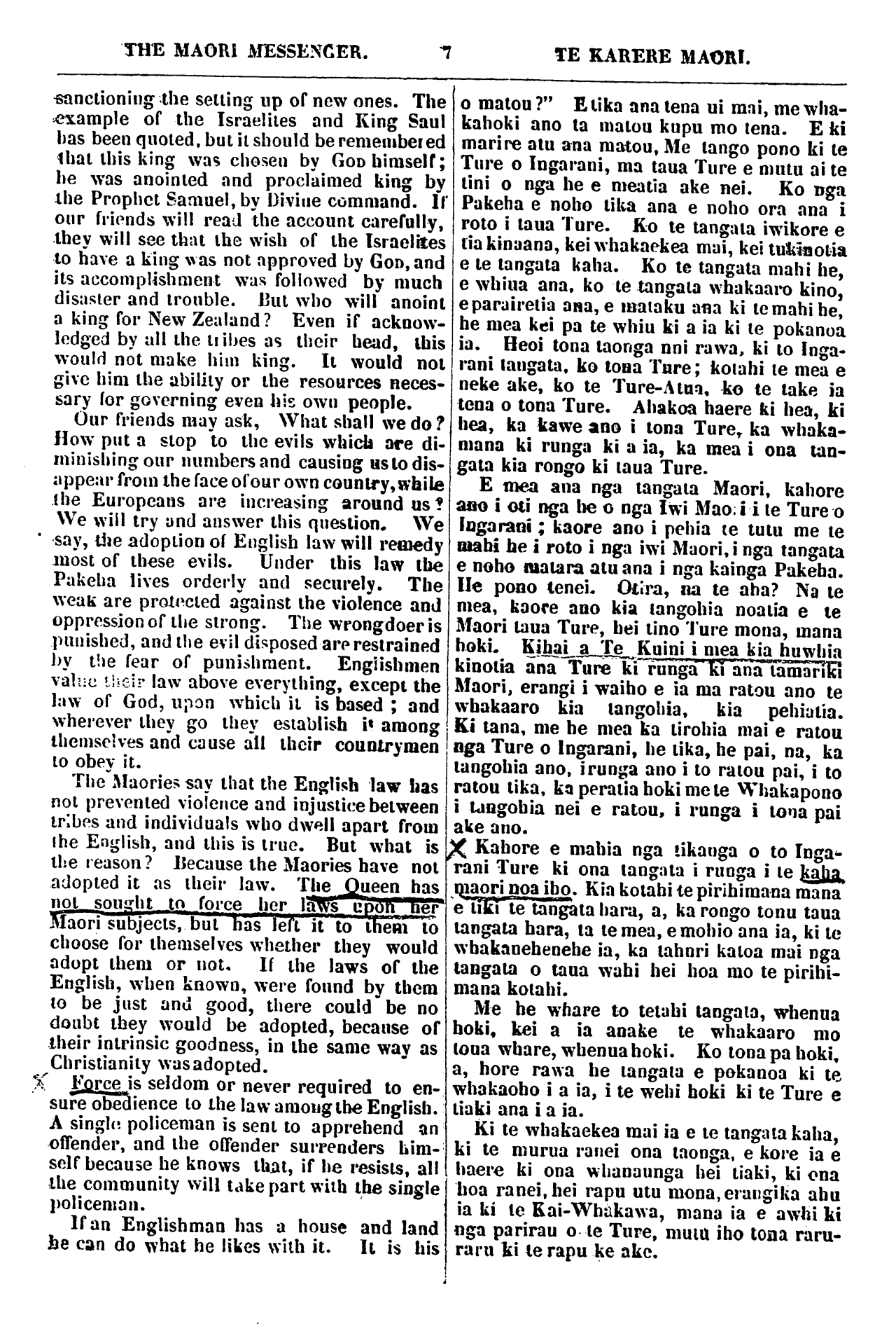 THE MAORI MESSENGER. 7 TE KARERE MAORI. sanctioning the selling up of new ones. The example of the Israelites and King Saul | has been quoted, but it should be remembered that this king was chosen by GOD himself; he was anointed and proclaimed king by the Prophet Samuel, by Divine command. If our friends will read the account carefully, they will see that the wish of the Israelites to have a king was not approved by GOD, and its accomplishment was followed by much disaster and trouble. But who will anoint a king for New Zealand? Even if acknow- ledged by all the tribes as their bead, this would not make him king. It would not give him the ability or the resources neces- sary for governing even his own people. Our friends may ask, What shall we do? How put a slop to the evils which are di- minishing our numbers and causing us to dis- appear from the face of our own country, while Ihe Europeans are increasing around us? We will try and answer this question. We say, the adoption of English law will remedy most of these evils. Under this law the Pakeha lives orderly and securely. The weak are protected against the violence and oppression of the strong. The wrongdoer is punished, and the evil disposed are restrained by the fear of punishment. Englishmen value their law above everything, except the law of God, upon which it is based; and wherever they go they establish it among themselves and cause all their countrymen to obey it. The Maories say that the English law has not prevented violence and injustice between tribes and individuals who dwell apart from the English, and this is true. But what is the reason? Because the Maories have not adopted it as their law. The Queen has not sought to force her laws upon her Maori subjects, but has left it to them to choose for themselves whether they would adopt them or not. If the laws of the English, when known, were found by them to be just and good, there could be no doubt they would be adopted, because of their intrinsic goodness, in the same way as Christianity was adopted. Force is seldom or never required to en- sure obedience to the law among the English. A single policeman is sent to apprehend an offender. and the offender surrenders him- self because he knows that, if he resists, all the community will take part with the single policeman. If an Englishman has a house and land fee can do what he likes with it. It is his o matou?" E tika ana tena ui mai, me wha- kahoki ano ta matou kupu mo tena. E ki mari re atu ana matou, Me tango pono ki te Ture o Ingarani, ma taua Ture e mutu ai te tini o nga he e meatia ake nei. Ko nga Pakeha e noho tika ana e noho ora ana i roto i taua Ture. Ko te tangata iwikore e tia kinaana, kei whakaekea mai, kei tukinotia e te tangata kaha. Ko te tangata mahi he, e whiua ana, ko te tangata whakaaro kino, e parairetia ana, e mataku ana ki te mahi he, he mea kei pa te whiu ki a ia ki te pokanoa ia. Heoi tona taonga uui rawa, ki to Inga- rani tangata, ko tona Ture; kotahi te mea e neke ake, ko te Ture-Atua, ko te take ia tena o tona Tu re. Ahakoa haere ki hea, ki hea, ka kawe ano i tona Ture ka whaka- mana ki runga ki a ia, ka mea i ona tan- gata kia rongo ki taua Ture. E mea aua nga tangata Maori, kahore ano i oti nga he o nga Iwi Mao; i i te Ture o Ingarani; kaore ano i pehia te tutu me te mahi he i roto i nga iwi Maori, i nga tangata e noho matara atu ana i nga kainga Pakeha. He pono tenei- Otira, na te aha? Na te mea, kaore ano kia tangohia noatia e te Maori taua Ture, hei tino Ture mona, mana hoki. Kihai a Te Kuini i mea kia huwhia kinotia ana Ture ki runga ki ana tamariki Maori, erangi i waiho e ia ma ratou ano te whakaaro kia tangohia, kia pehiatia. Ki tana, me he mea ka tirohia mai e ratou nga Ture o Ingarani, he tika, he pai, na, ka tangohia ano, i runga ano i to ratou pai, i to ratou tika, ka peratia hoki me te Whakapono i tangohia nei e ratou, i runga i tona pai ake ano. Kahore e mahia nga tikanga o to Inga- rani Ture ki ona tangata i runga i te kaha maori noa iho. Kia kotahi te pirihimana mana e tiki te tanga ta hara, a, ka rongo tonu taua tangata hara, ta te mea, e mohio ana ia, ki te whakanehenehe ia, ka tahuri katoa mai nga tangata o taua wahi hei hoa mo te pirihi- mana kotahi. Me he whare to tetahi tangata, whenua hoki « kei a ia anake te whakaaro mo toua whare, whenua hoki. Ko tona pa hoki, a, hore rawa he tangata e pokanoa ki te whakaoho i a ia, i te wehi hoki ki te Ture e tiaki ana i a ia. Ki te whakaekea mai ia e te tangata kaha, ki te murua ranei ona taonga, e kore ia e haere ki ona whanaunga hei tiaki, ki ona hoa ranei, hei rapu utu mona, erangi ka ahu ia ki te Kai-Whakawa, mana ia e awhi hi nga parirau o te Ture, mutu iho tona raru- raru ki te rapu ke ake.