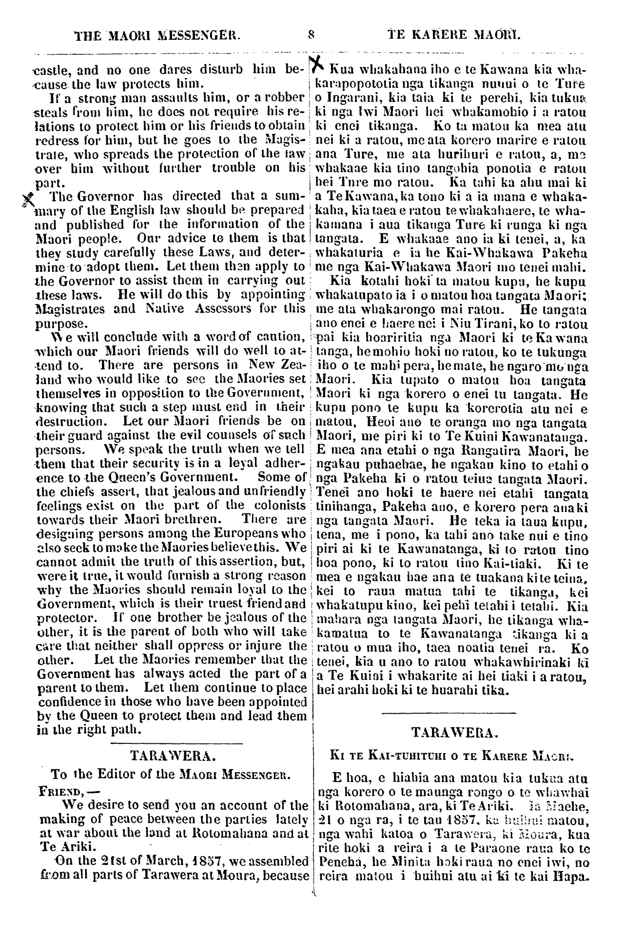 THE MAORI MESSENGER. 8 TE KARERE MAORI. castle, and no one dares disturb him be- cause the law protects him. i If a strong man assaults him, or a robber steals from him,he does not require his re- lations to protect him or his friends to obtain redress for him, but he goes to the Magis- trate, who spreads the protection of the law over him without further trouble on his part. The Governor has directed that a sum- mary of the English law should be prepared and published for the information of the Maori people. Oar advice to them is that they study carefully these Laws, and deter- mine to adopt them. Let them then apply to the Governor to assist them in carrying out these laws. He will do this by appointing Magistrates and Native Assessors for this purpose. We will conclude with a word of caution, which our Maori friends will do well to at- tend to. There are persons in New Zea- land who would like to see the Maories set themselves in opposition to the Government, knowing that such a step must end in their deestruction. Let our Maori friends be on their guard against the evil counsels of such persons. We speak the truth when we tell them that their security is in a leval adher- ence to the Queen's Government. Some of the chiefs assert, that jealous and unfriendly feelings exist on the part of the colonists towards their Maori brethren. There are designing persons among the Europeans who also seek to make the Maories believe this. We cannot admit the truth of this assertion, but, were it true, it would furnish a strong reason why the Maories should remain loyal to the Government, which is their truest friend and protector. If one brother be jealous of the other, it is the parent of both who will lake care that neither shall oppress or injure the other. Let the Maories remember that the Government has always acted the part of a parent to them. Let them continue to place confidence in those who have been appointed by the Queen to pro led them and lead them in the right path. . TARAWERA. To the Editor of the MAORI MESSENGER. FRIEND,— We desire to send you an account of the making of peace between the panics lately at war about the land at Rotomahana and at Te Ariki. On the 2lst of March, 1857, we assembled from all parts of Tarawera at Moura, because Kua whakahana iho e te Kawana kia wha- karapopototia nga tikanga nunui o te Ture o Ingarani, kia taia ki te perehi, kia tukua ki nga Iwi Maori hei whakamohio i a ratou ki enei tikanga. Ko ta matou ka mea atu nei ki a ratou, me ata korero marire e ratou ana Ture, me ata hurihuri e ratou, a, me whakaae kia tino tangohia ponotia e ratou hei Ture mo ratou. Ka tahi ka ahu mai ki a Te Kawana, ka tono ki a ia mana e whaka- kaha, kia taea e ratou te whakahaere, te wha- kamana i aua tikanga Ture ki runga ki nga tangata. E whakaae ano ia ki tenei, a, ka whakaturia e ia he Kai-Whakawa Pakeha me nga Kai-Whakawa Maori mo tenei mahi. Kia kotahi hoki ta matou kupu, he kupu whakatupato ia i o matou hoa tangata Maori; me ata whakarongo mai ratou. He tangata ano enei e haere nei i Niu Tirani, ko to ratou pai kia hoariritia nga Maori ki te Ka wana tanga, he mohio hoki no ratou, ko te tukunga iho o te mahi pera, he mate, he ngaro mo nga Maori. Kia tupato o matou hoa tangata Maori ki nga korero o enei tu tangata. He kupu pono te kupu ka korerotia atu nei e matou, Heoi ano te oranga mo nga tangata Maori, me piri ki to Te Kuini Kawanatanga. E mea ana etahi o nga Rangatira Maori, he ngakau puhaehae, he ngakau kino to etahi o nga Pakeha ki o ratou teina tangata Maori. Tenei ano hoki te haere nei etahi tangata tinihanga, Pakeha ano, e korero pera ana ki nga tangata Maori. He teka ia taua kupu, tena, me i pono, ka tahi ano take nui e tino piri ai ki te Kawanatanga, ki to ratou tino hoa pono, ki to ratou tino Kai-tiaki. Ki te mea e ngakau hae ana te tuakana ki te teina. kei to raua matua tahi te tikanga, kei whakatupu kino, kei pehi tetahi i tetahi. Kia mahara nga tangata Maori, he tikanga wha- kamatua to te Kawanatanga tikanga ki a ratou o mua iho, taea noatia tenei ra. Ko tenei, kia u ano to ratou whakawhirinaki ki a Te Kuini i whakarite ai hei tiaki i a ratou, hei arahi hoki ki te huarahi tika. TARAWERA. Ki TE KAITUHITUHI O TE KARERE MAORI E hoa, e hiahia ana matou kia tukua ata nga korero o te maunga rongo o te whawhai ki Rotomahana, ara, ki Te Ariki ia -Maehe, 21 o nga ra, i te tau 1857, ka huihui matou, nga wahi katoa o Tarawera, ki Moura, kua rite hoki a reira i a te Paraone raua ko te Peneha, he Minita hoki raua no enei iwi, no reira matou i huihui atu ai ki te kai Hapa-