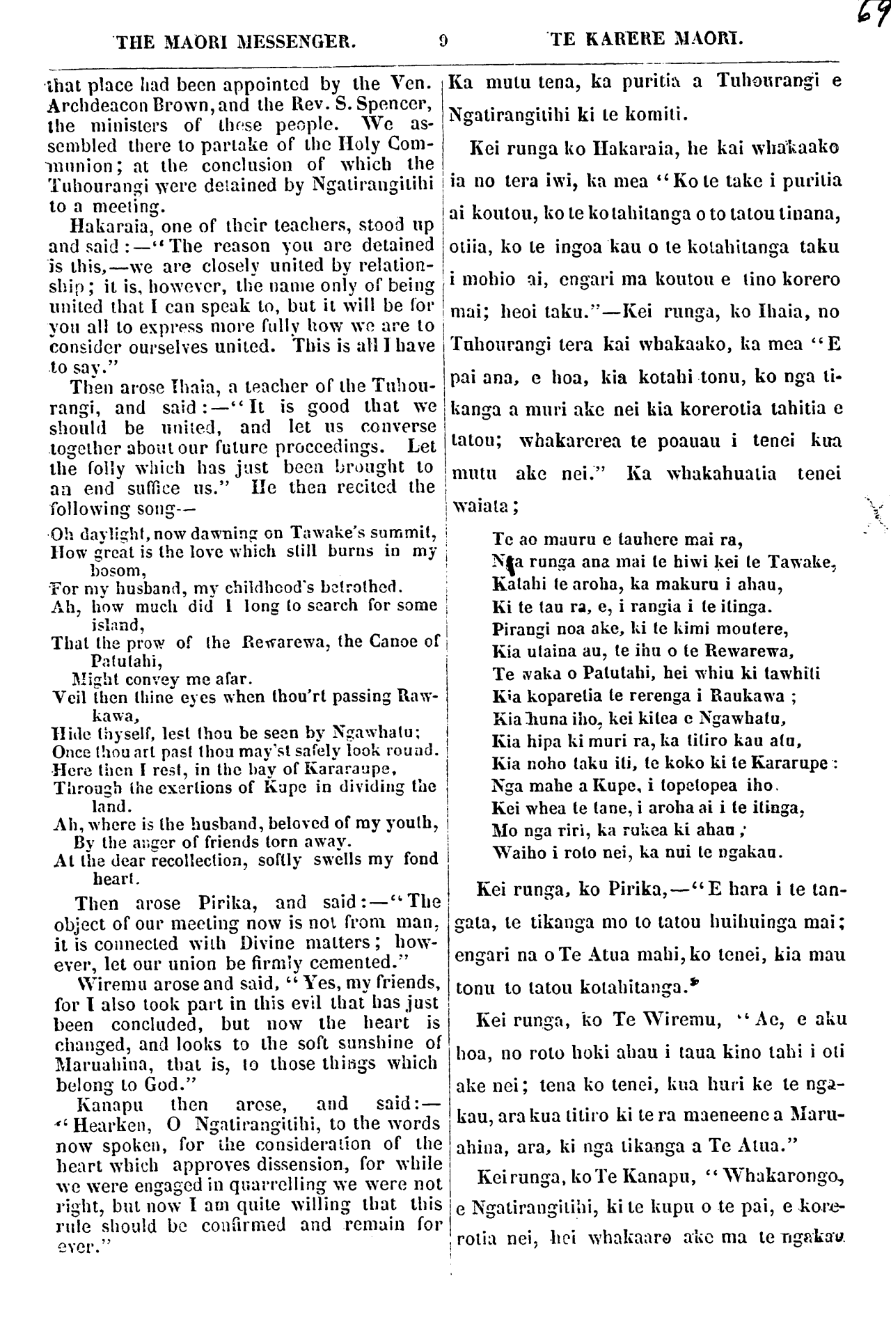 THE MAORI MESSENGER. 9 TE KARERE MAORI that place had been appointed by the Ven. Archdeacon Brown, and the Rev. S.Spencer, the ministers of these people. We as- sembled there to panake of the Holy Com- munion; at the conclusion of which the Tuhourangi were detained by Ngatirangitihi to a meeting. Hakaraia, one of their teachers, stood up and said:—" The reason you are detained is this,—we are closely united by relation- ship; it is, however, the name only of being united that I can speak to, but it will be for you all to express more fully how wo are to consider ourselves united. This is all I have to say." Then arose Ihaia, a teacher of the Tuhou- rangi, and said:—"It is good that we should be united, and let us converse together about our future proccedings. Let the folly which has just been brought to an end suffice us." Ue then recited the following song Oh daylight, now dawning on Tawake's summit, How great is the love which still burns in my bosom, Tor my husband, my childhood's betrothed. Ah, how much did 1 long to search for some island, That Ihe prow of the Rewarewa, the Canoe of Patutahi, Might convey me afar. Veil then thine eyes when thou'rt passing Rau- kawa, Hide thyself, lest thou be seen by Ngawhatu; Once thou art past thou may'st safely look round. Here then I rest, in the hay of Kararaupe, Through the exertions of Kape in dividing the land. Ah, where is Ihe husband, beloved of my youth, By the anger of friends torn away. At the dear recollection, softly swells my fond heart. Then arose Pirika, and said:—"The object of our meeting now is not from man; it is connected with Divine matters; how- ever, let our union be firmly cemented.'' Wiremu arose and said, " Yes, my friends, for I also took part in this evil that has just been concluded, but now the heart is changed, and looks to the soft sunshine of Maruahina, that is, to those things which belong to God." Kanapu then arose, and said:— " Hearken, O Ngatirangitihi, to the words now spoken, for the consideration of the heart which approves dissension, for while we were engaged in quarrelling we were not right, but now I am quite willing that this rule should be confirmed and remain for ever." Ka mutu tena, ka puritia a Tuhourangi e Ngatirangitihi ki te komiti. Kei runga ko Hakaraia, he kai whakaako ia no tera iwi, ka mea "Ko te take i puritia ai koutou, ko te kotahitanga o to tatou tinana, otiia, ko te ingoa kau o te kotahitanga taku i mohio ai, engari ma koutou e tino korero mai; heoi taku." Kei runga, ko Ihaia, no Tuhourangi tera kai whakaako, ka mea "E pai ana, e hoa, kia kotahi tonu, ko nga ti- kanga a muri ake nei kia korerotia tahitia e tatou; whakarerea te poauau i tenei kua mutu ake nei." Ka whakahuatia tenei waiata; Te ao mauru e tauhere mai ra, Nga runga ana mai te hiwi kei Ie Tawake, Katahi te aroha, ka makuru i ahau, Ki te tau ra, e, i rangia i te itinga. Pirangi noa ake, ki te kimi moutere, Kia utaina au, te ihu o Ie Rewarewa, Te waka o Patutahi, hei whiu ki tawhiti Kia koparetia te rerenga i Raukawa; Kia huna iho, kei kitea e Ngawhatu, Kia hipa ki muri ra, ka titiro kau atu, Kia noho taku iti, te koko ki te Kararupe: Nga mahe a Kupe, i topetope iho. I Kei whea te tane, i aroha ai i te itinga. I Mo nga riri, ka rukea ki ahau; i Waiho i roto nei, ka nui te ngakau. Kei runga, ko Pirika,—"E hara i te tan- gata, te tikanga mo to tatou huihuinga mai; engari na o Te Atua mahi, ko tenei, kia mau tonu to tatou kotahitanga. Kei runga, ko Te Wiremu, "Ae, e aku hoa, no roto hoki ahau i taua kino tahi i oti ake nei; tena ko tenei, kua huri ke te nga- kau, ara kua titiro ki te ra maeneene a Maru- ahina, ara, ki nga tikanga a Te Atua." Kei runga, ko Te Kanapu, "Whakarongo e Ngatirangitihi, ki te kupu o te pai, e kore rotia nei, hei whakaaro ake ma te ngakau.