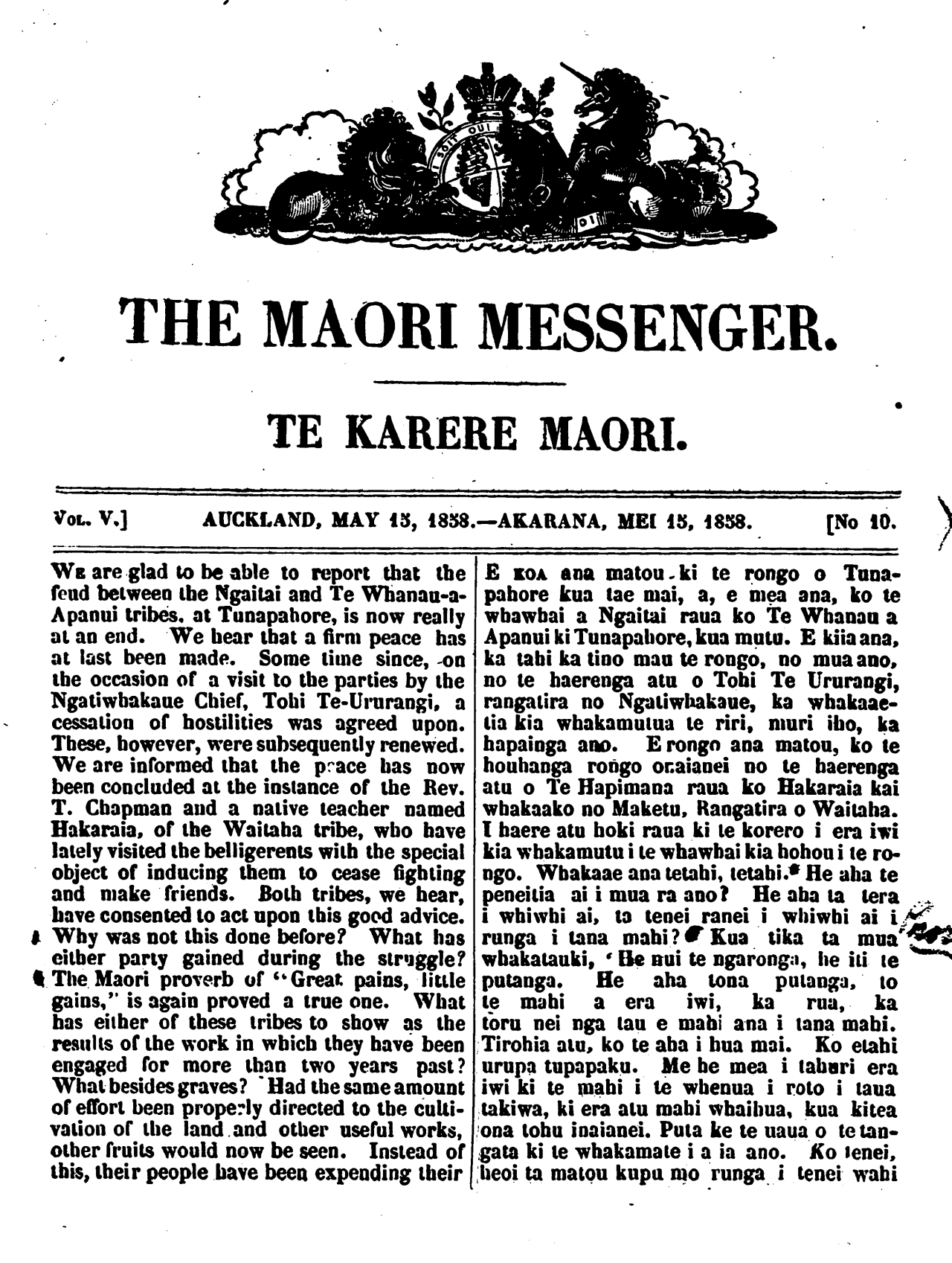 The Maori Messenger - Ko te Karere Maori 1855-1860: Volume 5, Number 10. 15 May 1858 |