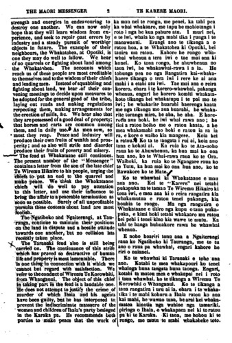 THE MAORI MESSENGER 2 TE KARERE MAORI. strength and energies in endeavouring to destroy one another. We can now only hope that they will learn wisdom from ex- perience. and seek to repair past errors by industry and a steady pursuit of worthier objects in future. The example of their neigbbours, the Whakatohea, at Opotiki. is one they may do well to follow. We hear of no quarrels or fighting about land among the Whakatohea. The accounts which reach us of these people are most creditable to themselves and to the wisdom of their chiefs and leading men. Instead of squabbling and fighting about land, we hear of their con- vening meetings to decide upon measures to be adopted for the general good of the tribe, laying out roads and making regulations respecting them, making arrangements for the erection of mills, &c. We hear also that they are possessed of a good deal of property; that horses and carts are common among them, and in daily use. As men sow, so must they reap. Peace and industry will produce their own fruits of wealth and pros- perity; and so also will strife and disorder produce their fruits of poverty and misery. The feud at Whakataane still continues. The present number of the "Messenger" contains a letter from the son of the late chief Te Wiremu Hikairo to his people, urging the chiefs to put an end to the quarrel and make peace. We think the Whakataane chiefs, will do well to pay attention to this letter. and use their influence to bring the affair to a peaceable termination as soon as possible. Surely of all unprofitable pursuits these contests about land are most foolish. The Ngatihoko and Ngaiterangi, at Tau- ranga, continue to maintain their positions on the land in dispute and a hostile attitude towards one another, but no collision has recently taken place. The Taranaki feud also is still being carried on. The continuance of this strife which has proved so destructive of human life and property is most lamentable. There is one thing In connection with it Which we cannot but regard with satisfaction. We refer to the conduct of Wiremu Te Korowhiti, from Whanganui. The object of this chief in taking part in the fend is a laudable one. Be does not attempt to Justify The crime of murder of which Ihaia and his agents have been guilty, but he has interposed to prevent the indiscriminate massacre of the women and children of Ihaia's party besieged in The Karaka pa. He recommends both parties to make peace that the work of ka mau nei te rongo, me penei, ka tahi pea ka whai whakaaro, me tupu he mohiotanga i roto i nga he kua pahure atu. 1 muri nei, e te iwi, whaia ko nga mahi tika i runga i te manawanui. Erangi ano te tikanga a o ratou hoa, a te Whakatohea ki Opotiki, hei tauira ma ratou. Kahore be rongo wha- whai whenua a tera iwi e tae mai ana ki konei. Ko tona rongo, he ahuwhenua no taua iwi, he whakawhai-rawa i a ia. He tohunga pea no nga Rangatira kai-whaka- haere tikanga o tera iwi i rere ke ai ana mahi i a etahi atu iwi. Tae mai ana o reira korero, ehara i te korero-whawhai, pakanga whenua, engari be korero komiti whakata- koto tikanga hei whakatupu i te pai mo te iwi; be whakarite huarahi haerenga kaata me nga tikanga mo aua huarahi, be whaka- rite turanga mira, he aha, he aha. E kore- roria ana hoki he iwi whai rawa ano; he tini a ratou hoiho me o ratou kaata, a be mea whakamahi ano hoki e ra tou ia ra ia ra, e kore e waiho kia mangere. Koia kei a ratou Ko ta te tangata i rui ai, koia ano tana e kokoti ai. Ka ruia ko te Ata-noho raua ko te Ahuwhenua, ka hua mai ko ona hua ano, ko te Whai-rawa raua ko te Ora. Waihoki, ka raia ko te Ngangare raua ko te Tutu, ka hua mai ko ona hua ano, ko te Rawakore ko te Mate. Ko te whawhai ki Whakataane e mau ana ano,. Kei te "Karere" nei tetahi pukapuka na te tama a Te Wiremu Hikairo ki tona iwi, e mea ana ki o reira rangatira kia whakamutua e ratou tenei pakanga, kia houhia te rongo. Ma nga rangatira o Whakataane e titiro nga kupu o taua puka- puka, e kimi hoki. tetahi whakaaro ma ratou hei pehi i tenei kino kia wawe te mutu. Ka tahi te hanga huhuakore rawa he whawhai whenua. E noho hoariri tonu ana a Ngaiterangi raua ko Ngatihoko ki Tauranga, me te tu ano o raua pa whawhai, engari kahore he riri o naianei. Ko te whawhai ki Taranaki e tohe ana ano. Katahi te mea whakapouri ko tenei whainga huna tangata huna taonga. Engari. kotahi ta matou mea e whakapai nei i roto i taua whawhai, ko te tikanga a Wiremu Te Korowhiti o Whanganui. Ko te tikanga a taua rangatira i uru ai ia, ehara i te whaka- tika i te mahi kohuru a Ihaia ratou ko ana kai mahi, he wawao tana, he arai kei whaka- matea kinotia nga wahine nga tamariki, piringa o Ihaia, e whakapaea nei ki to ratou pa ki te Karaka. Ki tana, me hohou ki te rongo, me mutu te mahi whakaheke toto.