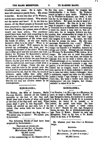 THE MAORI MESSENGER. TE KARERE MAORI. bloodshed may cease. He is right. No man will attempt to justify Ihaia. His crime is murder. So also was that of Te Waitere, and he met a murderer's death. Why should not the matter end here? If, in the first in- stance, all the Maori people at Taranaki had been prepared to support and carry out the law of The Pakeha, the present state of affairs would not have arisen. The murderer would have been dealt with according to the Queen's law, instead of being left to bring down the consequences of bis crime upon the heads of others. As the case stands, however, what is to be done? What is to be the end of this? Will matters be im- proved by prolonging the feud, and in- creasing the number of the slain? We do not see to what good end the war-path can lead. Rather let Wiremu Te Korowhiti's advice be followed. Let peace be made; let a barrier be set up to divide The past from The future; let the past with its mistakes and its evils be obliterated, and begin afresh with a new order of things. Cause the sun to shine, and the calm to be spread over the sea, and let it be resolved by the chiefs, and understood by all, that he who, by an act of violence, again ruffles that calm shall be given up to be tried and punished for his offence according to the Just laws of England, that his act may not involve others in its consequences. KORORAKEKA. ON Friday, the 29th of January, Maihi Paraone Kawiti, desired all the Chiefs to assemble at the foot of, the flag staff. Maihi then took a bottle of wine, and stood at the foot of the flag staff, arid said. What name shall I give to this flag-staff? The Chiefs all started up and said, Let it be called, Our union with the Laws of the Queen. The Chiefs then saluted The flag thus: We salute you, 0 Queen! We salute you, 0 Governor. The following Blocks of land have been acquired by Government PROVINCE OF AUCKLAND. DISTRICT OF THE BAY OF ISLANDS. Muriwhenua Block (South.) 86, 885 Acres. BOUNDARIES. A line commencing on the Eastern side at Ka tika tana. Kahore be tangata hei whakatikatika i ta Ihaia. He Kohuru marie te ingoa o tana mahi. Waihoki ko ta Te Waitere he Kohuru ano hoki, a riro ana ko ia, na runga ano i te ora o te tan- gata kohuru. Ko tenei, he aha te kaati ai i konei, kia mutu. He tika ra ia me i tino mau te pupuru o nga tangata Maori katoa o Taranaki ki to te Pakeha ture i te timatanga o tenei he, ekore e taea enei ra, kua oti i reira ano, ko te tangata kohuru ano kua unuhia kua whakawakia ki runga ki to Te Kuini Ture, kaore e waiho hei taki i nga tini tangata ki te mate. Ko tenei, me kimi ki hea he otinga mo tenei. He aha tona mutunga, Kumea kia roa, e pai? Whaka- tinia atu nga tupapaku, e pai? Whaia i runga i te huarahi o te whawhai, kahore he otinga pai e kitea. Erangi pea me whakaae ta Wiremu Te Korowhiti. Me hohou ki te rongo. Me rohe atu te wahi kua pahure atu, me ona he me ona kino, me timata he tiikanga hou mo te wahi e takoto ake nei. Whakawhitingia te ra; horahia te marino ki te moana, a whakaaetia ponotia e nga ran- gatira, e te iwi katoa ano hoki, hei tikanga takoto mo te tangata mana e pokarekare taua marino ki te mahi pokanoa a muri nei, ko ia tonu me tuku; kaua e tohungia; kaua e awhinatia, engari me tuku atu kia whaka- wakia i runga i nga tikanga o to Ingarani Ture tika, kia kaua e waiho tona kino hei whakataute i era atu tangata, hei whaka- whiwhi i a ratou ki te he. KORORAREKA. I TE Paraire. i te 29 o nga ra o Hanuere, ka puta te kupu a Maihi Paraone Kawiti ki nga Rangatira katoa, kia huihui ki te putake o te Kara, ka mau a Maihi ki te pounamu waina, ka haere ki te putake o te rakau, ka puaki tana kupu. Ka "ua- ina e ahau te ingoa o tenei rakau ki a wai? Katahi ka oho nga Rangatira katoa, ka mea, Ko te whakakotahitanga ki nga Ture O Kuini. Katahi ka mea nga Rangatira, Tena ra ko koe, e Te Kuini. Tena ra ko koe, e Te Kawana. He whenua enei kua riro i te Kawana - (anga. AKARANA. TE TAKIWA KI PEOWHAIRANGI. Muriwhenua, (te pito ki te tonga.) 86, 885 Acres.