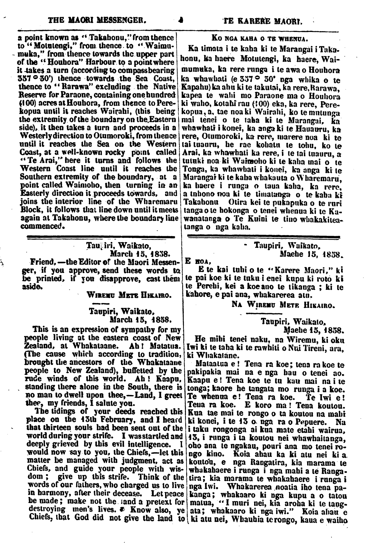 THE MAORI MESSENGER. TE KARERE MAORI. a point known as " Takahonu," from thence to " Motutengi," from thence to " Waimu- muka," from thence towards The upper part of the "Houhora" Harbour to a point where it takes a turn (according to compass bearing 357° 30) thence towards the Sea Coast, thence to " Rarawa" excluding the Native Reserve for Paraone, containing one hundred (100) acres at Houhora, from thence to Pere- kopua until it reaches Wairahi, (this being the extremity of the boundary on the Eastern side), it then takes a turn and proceeds in a Westerly direction to Otumoroki, from thence until it reaches The Sea on the Western Coast, at a well-known rocky point called " Te Arai," here it turns and follows the Western Coast line until it reaches the Southern extremity of the boundary, at a point called Waimoho, then turning in an Easterly direction it proceeds towards, and joins The interior line of The Wharemaru Block, it follows that line down until it meets again at Takahonu, where the boundary line commenced . Taupiri. Waikato, March 15, 1858. Friend,—the Editor of The Maori Messen- ger, if you approve, send these words to be printed, if you disapprove, east them aside. WIREMU METE HIKAlRO. Taupiri, Waikato, March 15, 1858. This is an expression or sympathy for my people living at The eastern coast of New Zealand, at Whakataane. Ah! Matatua. (The cause which according to tradition, brought the ancestors of the Whakataane people to New Zealand), buffetted by the rude winds of this world. Ah ! Kaapu, standing there alone in the South, there is no man to dwell upon thee, Land, I greet thee, my friends, 1 salute you. The tidings of your deeds reached this place on the 13th February. and I heard that thirteen souls had been sent out of the world during your strife. I was startled and deeply grieved by this evil intelligence. I would now say to you, the Chiefs,—let this matter be managed with judgment, act as Chiefs, and guide your people with wis- dom; give up this strife. Think of the words of our fathers, who charged us to live in harmony, after their decease. Let peace be made; make not the land a pretext for destroying men's lives. Know also, ye Chiefs, that God did not give the land to KO NGA KAHA O TE WHENUA. Ka timata i te kaha ki te Marangai i Taka- honu, ka haere Motutengi, ka haere, Wai- mumuka, ka rere runga i te awa o Houhora ka whawhati (e 357 30 nga whika o te Kapahu) ka ahu ki te takutai, ka rere Rarawa, kapea te wahi mo Paraone ma o Houhora ki waho, kotahi rau (100) eka, ka rere. Pere- kopua, a, tae noa ki Wairahi, ko te mutunga mai tenei o te taha ki te Marangai, ka whawhati i konei, ka anga ki te Hauauru, ka rere, Otumoroki, ka rere, marere noa ki te tai tuauru, he rae kohatu te tohu, ko te Arai, ka whawhati ka rere, i te tai tuauru, a tutuki noa ki Waimoho ki te kaha mai o te Tonga, ka whawhati i konei, ka anga ki te Marangai ki te kaha whakauta o Wharemaru, ka haere i runga o taua kaha, ka rere, a tuhono noa ki te timatanga o te kaha ki Takahonu Otira kei te pukapuka o te ruri tanga o te hokonga o tenei whenua ki te Ka- wanatanga o Te Kuini te tino whakakitea- tanga o nga kaha. - Taupiri, Waikato, Maehe 15. 1858. E HOA, E te kai tuhi o te "Karere Maori," ki te pai koe ki te tuku i enei kupu ki roto ki te Perehi, kei a koe ano te tikanga; ki te kahore, e pai ana, whakarerea atu. NA WIREMU METE HIKAlRO. Taupiri. Waikato, Maehe 15, 1858. He mihi tenei naku, na Wiremu, ki oku Iwi ki te taha ki te rawhiti o Nui Tireni, ara, ki Whakatane. Mataatua e! Tena ra koe; tena ra koe te pakipakia mai oa e nga hau o tenei ao. Kaapu e! Tena koe te tu kau mai na i te tonga; kaore he tangata mo runga i a koe. Te whenua e! Tena ra koe. Te Iwi e! Tena ra koe. E koro ma! Tena koutou. Kua tae mai te rongo o ta koutou na mahi ki konei, i te 15 a nga ra o Pepuere. Na i taku rongonga ai kua mate etahi wairua, 15, i runga i ta koutou nei whawhaitanga, oho ana te ngakau, pouri ana mo tenei ro- ngo kino. Koia ahau ka ki atu nei ki a koutou, e nga Rangatira, kia marama te whakahaere i runga i nga mahi a te Ranga- tira; kia marama te whakahaere i runga i nga Iwi. Whakarerea noatia iho tena pa- kanga; whakaaro ki nga kupu a o tatou matua, "I muri nei, kia aroha ki te tang- ata; whakaaro ki nga iwi." Koia ahau e ki atu nei, Whauhia te rongo, kaua e waiho
