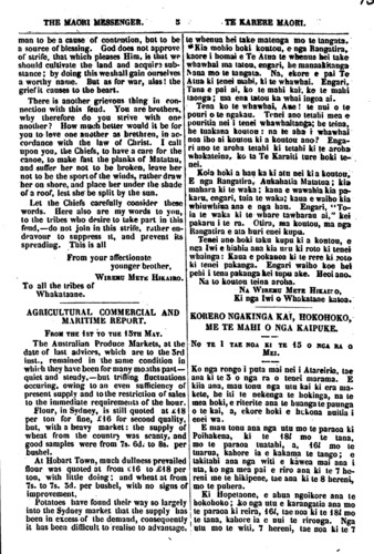 THE MAORI MESSENGER. TE KARERE MAORI. man to be a cause of contention, but to be a source of blessing. God does not approve of strife, that which pleases Him, is that we should cultivate the land and acquire sub- stance; by doing this we shall gain ourselves a worthy name. But as for war, alas! The grief it causes to the heart. There is another grievous thing in con- nection with this feud. You are brothers, why therefore do you strive with one another ? How much better would it be for you to love one another as brethren, in ac- cordance with the law of Christ. I call upon you, the Chiefs, to have a care for the canoe, to make fast the planks of Matatau, and suffer her not to be broken, leave her not to be the sport of the winds, rather draw her on shore, and place her under the shade of a roof, lest she be split by the sun. Let the Chiefs carefully consider these words. Here also are my words to you, to the tribes who desire to lake part in this fend, do not join in this strife, rather en- deavour to suppress it, and prevent its spreading. This is all From your affectionate younger brother, WIREMU METE HIKAIRO. To all the tribes of Whakatane. AGRICULTURAL COMMERCIAL AND MARITIME REPORT. FROM THE 1ST TO THE 15TH MAY. The Australian Produce Markets, at the date of last advices, which are to the 3rd inst., remained in the same condition in which they have been for many months past- quiet and steady, but trifling fluctuations occuring owing to an even sufficiency of present supply and to the restriction of sales to the immediate requirements of the hour. Flour, in Sydney, is still quoted at £18 per ton for fine, £16 for second quality, but, with a heavy market: the supply of wheat from the country was scanty, and good samples were from 7s. 6d. to 8s. per bushel. At Hobart Town, much dullness prevailed flour was quoted at from £1 6 to £18 per ton, with little doing; and wheat at from 7s. to 7s. 3d. per bushel, with no signs of improvement, Potatoes have found their way so largely into the Sydney market that the supply has been in excess of the demand, consequently it has been difficult to realise to advantage te whenua hei take matenga mo te tangata Kia mohio hoki koutou, enga Rangatira, kaore i homai e Te Atua te whenua hei take whawhai ma tatou, engari, be manaakitanga Nana mo te tangata. Na, ekore e pai Te Atua ki tenei mahi, ki te whawhai. Engari Tana e pai ai, ko te mahi kai, ko te mahi taonga; ma ena tatou ka whai ingoa ai. Tena ko te whawhai, Aue! te nui o te pouri o te ngakau. Tenei ano tetahi mea e pouritia nei i tenei whawhaitanga; he teina, he tuakana koutou: na te aha i whawhai noa iho ai koutou ki a koutou ano? Enga- ri ano te aroha tetahi ki tetahi ki te aroha whakateina, ko ta Te Karaiti ture hoki te- nei. Koia hoki a hau ka ki atu nei ki a koutou, E nga Rangatira, Aukahatia Matatua; kia mahara ki te waka; kaua e wawahia kia pa- karu, engari, tuia te waka; kaua e waiho kia whiuwhiua ana e nga hau. Engari, "To- ia te waka ki te whare tawharau ai," kei pakaru i te ra. Otira, ma koutou, ma nga Rangatira e ata huri enei kupu. Tenei ano hoki taku kupu ki a koutou, e nga Iwi e hiahia ana kia uru ki roto ki tenei whainga: Kaua e pokanoa ki te rere ki roto ki tenei pakanga. Engari waiho koe hei pehi i tena pakanga kei tupu ake. Heoi ano. Na to koutou teina aroha. NA WIREMU METE HIKAIRO. Ki nga Iwi o Whakatane katoa. KORERO NGAKINGA KAI, HOKOHOKO, ME TE MAHI O NGA KAIPUKE. NO TE 1 TAE NOA KI TE 15 O NGA RA O MEI. Ko nga rongo i puta mai nei i Atareiria, tae ana ki te 5 o nga ra o tenei marama. E kiia ana, mau tonu nga utu kai ki era ma- kete, he iti te nekenga te hokinga, na te mea hoki, e riterite ana te huanga te paunga o te kai, a, ekore hoki e hokona nuitia i enei wa. E mau tonu ana nga utu mo te paraoa ki Poihakena, ki te 181 mo te tana, mo te paraoa tuatahi, a, 161 mo te tuarua, kahore ia e kakama te tango; e takitahi ana nga witi e kawea mai ana i uta, ko nga mea pai e riro ana ki te 7 he- reni me te hikipene, tae ana ki te 8 hereni, mo te puhera. Ki Hopetaone, e ahua ngoikore ana te hokohoko; ko nga utu e karangatia ana mo te paraoa ki reira, 161, tae noa ki te 181 mo te tana, kahore ia e nui te rironga. Nga utu mo te witi, 7 hereni, tae noa ki te 7
