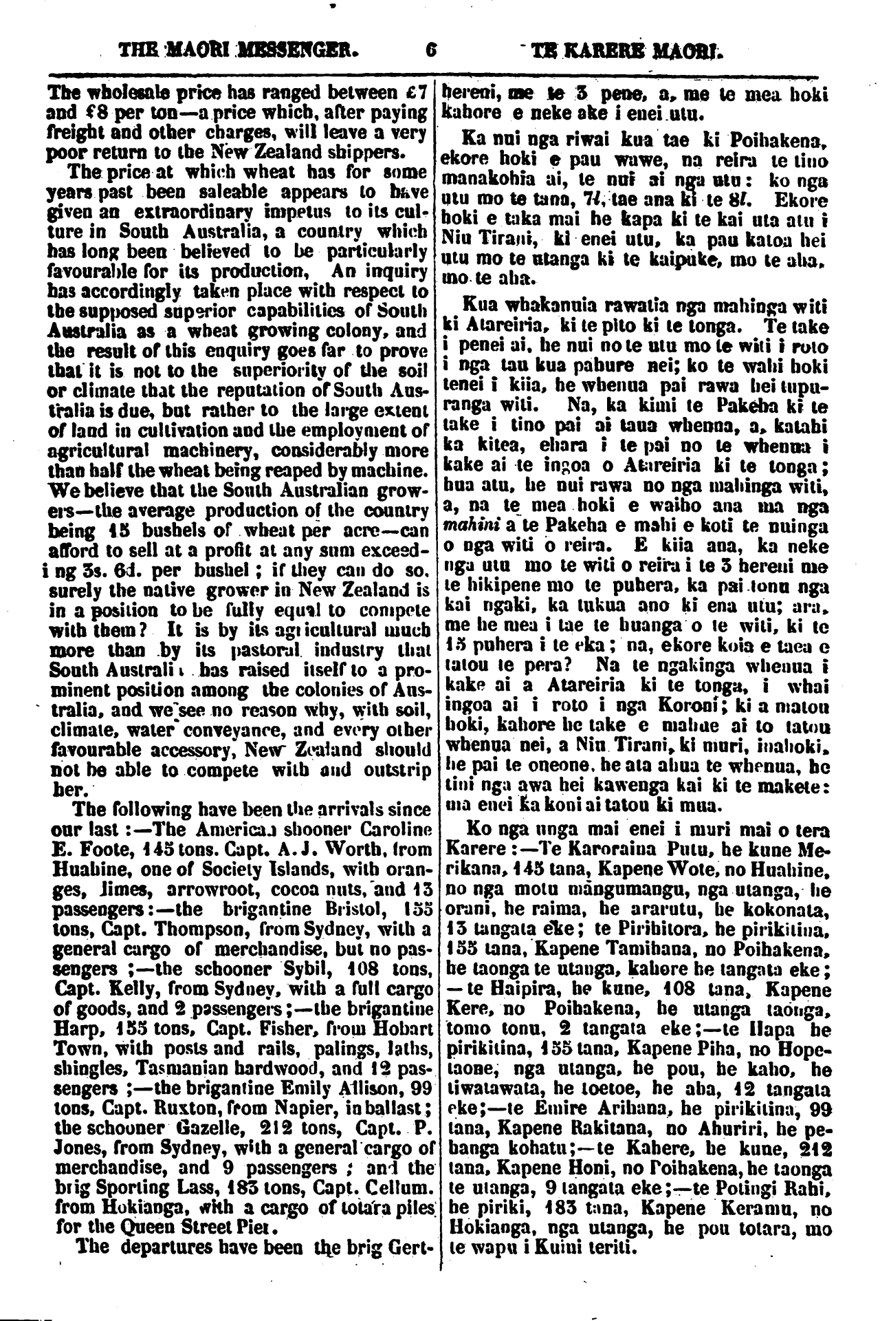 THE MAORI MESSENGER. 6 TE KARERE MAORI. The wholesale price has ranged between £7 and £8 per ton—a price which, after paying freight and other charges, will leave a very poor return to the New Zealand shippers. The price at which wheat has for some years past been saleable appears to have given an extraordinary impetus to its cul- ture in South Australia, a country which has long been believed to be particularly favourable for its production, An inquiry has accordingly taken place with respect to the supposed superior capabilities of South Australia as a wheat growing colony, and the result of this enquiry goes far to prove that it is not to the superiority of the soil or climate that the reputation of South Aus- tralia is due, but rather to the large extent of land in cultivation and the employment of agricultural machinery, considerably more than half the wheat being reaped by machine. We believe that the South Australian grow- er's the average production of the country being i 5 bushels of wheat per acre—can afford to sell at a profit at any sum exceed- ing 5s. 6d. per bushel; if they can do so surely the native grower in New Zealand is in a position to be fully equal to compete with them? It is by its agricultural much more than by its pastoral industry that South Australia has raised itself to a pro- minent position among the colonies of Aus- tralia, and we see no reason Why, with soil, climate, water conveyance, and every other favourable accessory. New Zealand should not be able to compete with and outstrip her. The following have been the arrivals since oar last:—The American schooner Caroline E. Foote, 145 tons. Capt, A.J. Worth. from Huahine, one of Society Islands, with oran- ges, limes, arrowroot, cocoa nuts, and 13 passengers:—the brigantine Bristol, 155 tons, Capt. Thompson, from Sydney, with a general cargo of merchandise, but no pas- sengers; the schooner Sybil, 108 tons, Capt. Kelly, from Sydney, with a full cargo of goods, and 2 passengers; the brigantine Harp, 155 tons, Capt. Fisher, from Hobart Town, with posts and rails, palings, laths, shingles, Tasmanian hardwood, and 12 pas- sengers;—the brigantine Emily Allison, 99 tons, Capt. Ruxton, from Napier, in ballast; the schooner Gazelle, 212 tons, Capt. P. Jones, from Sydney, with a general cargo of merchandise, and 9 passengers; and the brig Sporting Lass, 185 tons, Capt. Cellum. from Hokianga, with a cargo of totara piles: for the Queen Street Pier. The departures have been the brig Gert- hereni, me te 3 pene, a, me ie mea hoki kahore e neke ake i enei utu . Ka nui nga riwai kua tae ki Poihakena, ekore hoki e pau wawe, na reira te tino manakohia ai, te nui ai nga uta: ko nga utu mo te tana, 71, tae ana ki te 81. Ekore hoki e taka mai he kapa ki te kai uta atu i Niu Tirani, ki enei utu, ka pau katoa hei utu mo te utanga ki te kaipuke, mo te aha, mo te aha. Kua whakanuia rawatia nga mahinga witi ki Atareiria, ki te pito ki te tonga. Te take i penei ai he nui note utu mo te witi i roto i nga tau kua pahure nei; ko te wahi hoki tenei i kiia, he whenua pai rawa hei tupu- ranga witi. Na, ka kimi te Pakeha ki te take i tino pai ai kaua whenua, a, katahi ka kitea, ehara i te pai no te whenua i kake ai te ingoa o Atareiria ki te tonga; hua atu, be nui rawa no nga mahinga witi, a, na te mea hoki e waiho ana ma nga mahini a te Pakeha e mahi e koti te nuinga o nga witi o reira. E kiia ana, ka neke nga utu mo te witi o reira i te 5 hereni me te hikipene mo te puhera, ka pai tona nga kai ngaki, ka tukua ano ki ena utu; ara, me he mea i tae te huanga o te witi, ki te 15 puhera i te eka; na, ekore koia e taea e tatou te pera? Na te ngakinga whenua i kake ai a Atareiria ki te tonga, i whai ingoa ai i roto i nga Koroni; ki a matou hoki, kahore he take e mahue ai to tatou whenua nei, a Niu Tirani, ki mori, inahoki, he pai te oneone, he ata ahua te whenua, he tini nga awa hei kawenga kai ki te makete: ma enei ka koni ai tatou ki mua. Ko nga unga mai enei i muri mai o tera Karere:—Te Karoraina Putu, he kune Me- rikana, 145 tana, Kapene Wote, no Huahine, no nga motu mangumangu, nga utanga, he orani, he raima. he ararutu, be kokonata, 13 tangata eke; te Pirihitora, he pirikitina. 155 tana, Kapene Tamihana, no Poihakena, he taonga te utanga, kahore be tangata eke; te Haipira, he kune, 108 tana, Kapene Kere, no Poihakena, he utanga taonga, tomo tonu, 2 tangata eke;—te Hapa be pirikitina, 155 tana, Kapene Piha, no Hope- taone, nga utanga, he pou, be kaho, he tiwatawata, he toetoe, he aha, 12 tangata eke;—te Emire Arihana, be pirikitina, 99 tana, Kapene Rakitana, no Ahuriri, be pe- hanga kohatu;—te Kahere, be kune, 212 tana, Kapene Honi, no Poihakena, he taonga te utanga, 9 tangata eke;—te Potingi Rahi, he piriki, 183 tana, Kapene Keramu, no Hokianga, nga utanga, he pou totara, mo te wapu i Kuini teriti.