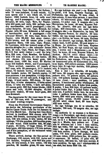 THE MAORI MESSENGER 7 TE KARERE MAORI. rude 118 tons, Capt. Dunning, for Sydney, with 70 tons potatoes, 5 tons onions, 1½ tuns sperm and 1 tan black oil, 10 cwt butter, i 200 bushels bran, 14 coils wool lashing, and 9 passengers; the schooner Salopian, 40 tons, Capt. Bain, for Napier. with 600 posts and rails, 500 palings, sun- dry merchandise, and 2 passengers;—the cutter Surprise, 49 tons, Capt. Braund, for Napier, with 50 tons firewood, a full cargo of merchandise, and 4 passengers;—the schooner Eliezer, 56 tons, Capt. Kean. for Napier, with 22, 500 feet sawn timber, 3, 500 bricks, and 60 totara piles; the bigatine Harp, 155 tons, Capt, Fisher, for Lyttleton, with her inward cargo of Tas- manian shingles &c.; the schooner James Daly, 42 tons, Capt. Nicol, for Otago, with 50, 112 feet sawn timber;—and the brig Moa, 236 tons, Capt. Bowden, for Sydney, with 172 tons potatoes, 4 i cwt butter, 46 cwt cheese, 10½ tons kauri gum, 500 bushels bran, 1600 IDS. wool, 20 Merino rams 355 bushels wheat, and 9 passengers. There arrived, coastwise, 40 vessels of 947 tons, with 98 passengers, 5171 bushels wheat, 75 bushels barley, 40 bushels oats, i 00 bushels maize, 65 bushels apples, 11 tons potatoes, 1 toa pumpkins, 14 bags flour, 5 cwt bacon, 45 cwt salt pork, 2 kegs lard, 2 pigs, 5 head cattle, 200 sheep, 10 bun- dles flax. 4 bales sheepskins, 5 bales salted hides. 3 bales dry bides. 4 bale calf skins. 15 ounces gold, 500 feet house blocks, 1800 posts and rails, 19, 090 shingles, 43, 500 feet sawn timber, 59 tons kauri gum, 425 tons firewood. The departures for the coast were 35 ves- sels of 790 tons, with 79 passengers. and the usual trading cargoes. From the Provincial Government Gazette we derive the following particulars of the Native Canoe Trade from the 1st January to the 31st March last. During that time there arrived in Auckland 194 canoes with 755 males, 369 female, conveying 547 kits pota- toes, 108 kits onions. 3 kits maize, 86 kits cabbage, 773 kits peaches, 449 bundles grass, 19 tons wood, 1038 bundles fish, 20 pigs, 4 goats, 53 fowls, 17 bags wheat, 27 tons kauri gum, 420 kits oysters, 176 kits melons, and 8 kits pumpkins, of the estimated value £669 12s. 6d. There arrived, during the like period at Onehunga, 133 canoes, with 330 males and 311 females, freighted, with 803 kits pota- toes, 52 kits onions, 5 kits maize, 104 kits peaches, 36 bundles grass, 90 tons wood, Ko nga hokinga atu enei; te Kataruta,, he piriki, 118 tana, Kapene Taningi, no Poihakena, nga utanga, 70 tana riwai, 5 tana aniana, 1½ tanu hinu paraoa, 1 tana hinu tohora, 10 hanaraweti pata, 1200 puhera papapa, 14 pokai ropi, 9 tangata eke;—te Haropiana, he kune, 40 tana, Kapene Pei- na, ko Ahuriri, 600 pou me nga kaho taiepa, 500 tiwatawata, me etahi taonga, 2 tangata eke ; te Haparaiha, be kata, 49 tana, Kapene Parane, ko Ahuriri, 60 tana wahie, me nga taonga tomo tonu, 4 tangata eke; te Erieha, he kune, 56 tana, Kapene Kene, ko Ahuriri, nga utanga. 22, 500 whiti rakau kani, 3, 500 periki, 60 pou totara; te Hapa, he pirikitina, 155 tana, Kapene Piha, ko Poti Kupa, me nga toetoe me nga aha, i utaina mai i Hopetaone; te Hemi Teri, he kune, 42 tana, Kapene Nikora, ko Atakou, 30, 113 whiti rakau kani;—te Moa, he piriki, 236 tana, Kapene Pautene, ko Poihakena, nga utanga, 172 tana riwai, 44 hanaraweti pata, 46 hanaraweti tihi, 10½ tana kapia, 300 puhera papapa, i 600 pauna huru hipi, 20 nga hipi marino, 355 puhera witi, 9 tangata eke. Kua u mai i te tahatika, 40 kaipuke, 947 tana, 98 tangata eke, nga utanga, 5171 puhera witi, 75 puhera paare, 40 puhera ooti, 100 puhera kaanga, 65 puhera aporo, 11 Iana riwai, 1 tana paukena, 14 peke paraoa, 5 hanaraweti poaka whakapaoa, 45 hanaraweti poaka tote, 2 kaho hinu poaka, 2 poaka, 5 kau, 200 hipi, 10 paihere muka, 4 pokai hiako hipi, 5 pokai hiako kau, he mea tote, 3 paihere hiako kau, he mea ma - roke 1 paihere hiako kuao kau, 15 aunihi koura, 500 whiti pou whare, 1800 pou me nga kaho taiepa, 19, 000 toetoe whare, 43, 500 whiti rakau kani, 59 tana kapia, 425 tana wahie. Ko nga hokinga atu hi te tahatika, 35 kaipuke, 790 tana, 79 tangata eke, me nga taonga . Ka mohiotia ki te nupepa o te Kawana- tonga o te Porowhini, nga mea e utaina mai ana ki nga waka Maori hoe mai ki Akarana nei, no te 1 o Hanuere tae noa ki te 31 o nga ra o Maehe, kua pahure nei. U mai ana ki Akarana nei i roto i taua takiwa, 204 nga waka, 755 nga tane, 369 nga wa- hine; ko nga utanga mai, 547 kete riwai, 108 kete aniana, 3 kete kaanga, 86 kete puka, 773 kete pititi, 449 paihere otaota, 19 tana rakau, 1038 paihere ika, 20 poaka, 4 nanenane, 53 heihei, 17 peke witi, 37 tana kapia, 420 kete tio, 176 kete mereni, 8 kete paukina. Ko nga utu i whakaarohia ai mo enei, hui katoa 6691 I2s. 6d.