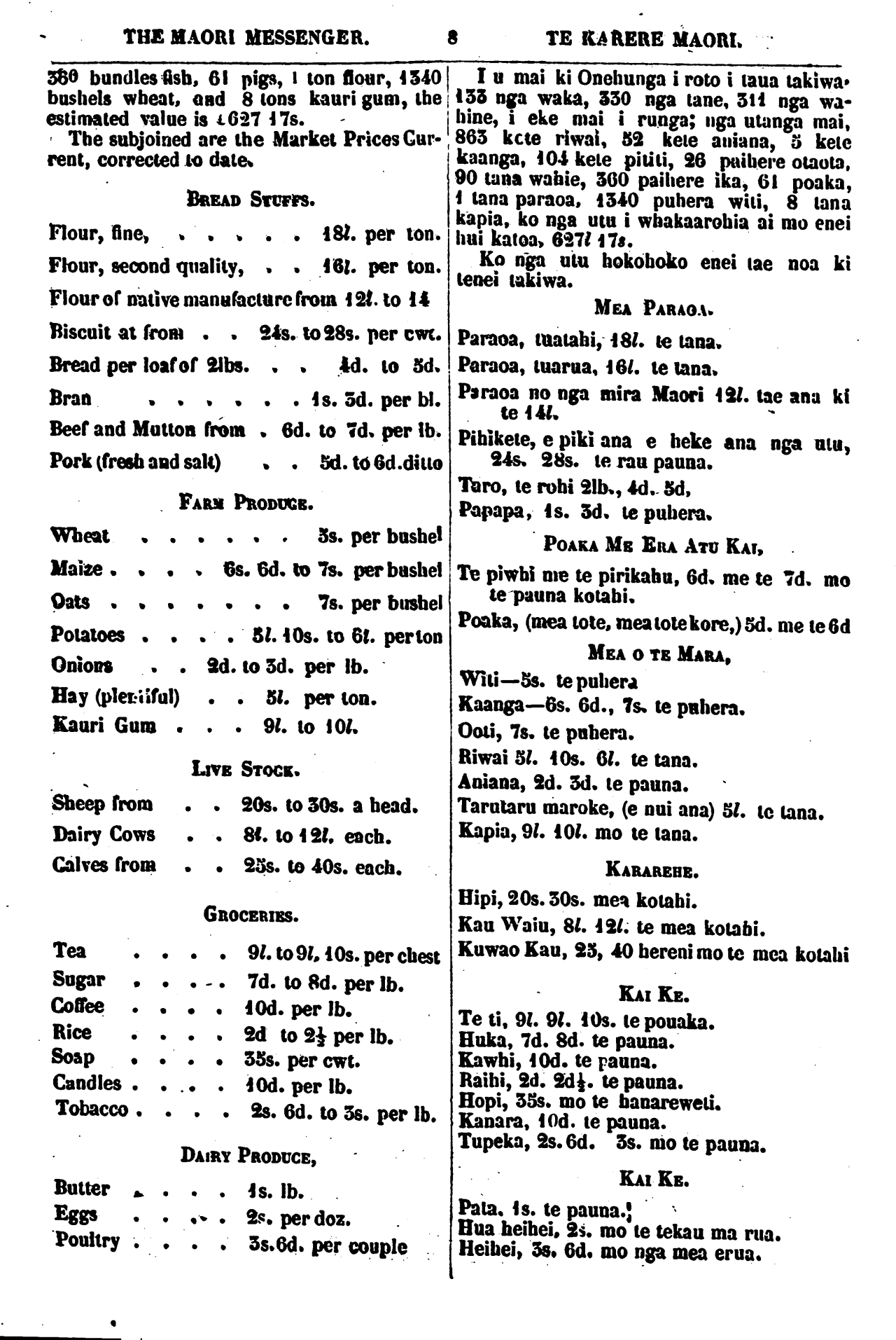 THE MAORI MESSENGER. 8 TE KARERE MAORI. 380 bundles fish, 61 pigs, 1 ton flour, 1340 bushels wheat, and 8 tons kauri gum, the estimated value is £627 17s. The subjoined are the Market Prices Cur- rent, corrected to date . BREAD STUFFS. Flour, fine, . . . . 181. per ton. Flow, second quality, . . 161. per ton. Flour of native manufacture from 121. to 14 Biscuit at from . . 24s. to 28s. per cwt. Bread per loaf of 21bs. . . 4d. to 5d. Bran •••••• ls.3d.per bl. Beef and Mutton from . 6d. to 7d, per Ib. Pork (fresh and salt) . . 5d.to6d.ditto FARM PRODUCE. Wheat •••••' 5s. per bushel Maize . . . 6s. 6d. to 7s. per bushel Oats ••••••• 7s. per bushel Potatoes . . . . 51 10s. to 61. per ton Onions . . 2d. to 3d. per Ib. Hay (plentiful ) . . 51 per ton. Kauri Gum . . . 9 1. to 101. LIVE STOCK. Sheep from . . 20s. to 30s. a head. Dairy Cows . . 81. to 12 1 each. Calves from . . 25s. to 40s. each. GROCERIES. Tea . . . . 91 to 9 1. 10s. per chest Sugar . . . - . 7d. to 8d. per Ib. Coffee . . . 10d. per Ib. Rice . . . . 2d to 2½ per Ib. Soap . . . . 35s. per cwt. Candles. . .. . lOd. per Ib. Tobacco . . . . 2s. 6d. to 3s. per Ib. DAIRY PRODUCE, Butter ... Is. Ib. Eggs . . . 2s. per doz. Poultry . . . 3s. 6d. per couple I u mai ki Onehunga i roto i taua takiwa 155 nga waka, 550 nga tane, 511 nga wa- hine, i eke mai i runga; nga utanga mai, 865 kete riwai, 52 kete aniana, 5 kete kaanga, 104 kete pititi, 26 paihere otaota. 90 tana wahie, 360 paihere ika, 61 poaka, 1 tana paraoa, 1540 puhera witi, 8 tana kapia, ko nga utu i whakaarohia ai mo enei hui katoa, 6271 17s. Ko nga utu hokohoko enei tae noa ki tenei takiwa. MEA PARAOA . Paraoa, tuatahi, 181. te tana . Paraoa, tuarua, 161 te tana . Paraoa no nga mira Maori 121 tae ana ki te l41 Pihikete, e piki ana e heke ana nga utu, 24s. 28s. te rau pauna. Taro, te rohi 21b., 4d.. 5d, Papapa, is. 3d. te puhera, POAKA ME ERA ATU KAI, Te piwhi me te pirikahu, 6d. me te 7d. mo te pauna kotahi . Poaka, (mea tote, mea tote kore,) 5d. me te 6d MEA o TE MARA, Witi—5s. te puhera Kaanga 6s. 6d., 7s. te puhera. Ooti, 7s. te puhera. Riwai 51 10s. 61. te tana. Aniana, 2d. 3d. te pauna. Tarutaru maroke, (e nui ana) 51 te tana, Kapia, 91 10 1 mo te tana. KARAREHE. Hipi, 20s. 50s. mea kotahi. Kau Waiu, 81 121. te mea kotahi. Kuwao Kau, 23, 40 hereni mo te mea kotahi KAIKE. Te ti. 91 9 1 10s. te pouaka. Huka, 7d. 8d. te pauna. Kawhi, lOd. te pauna. Raihi, 2d. 2d½. te pauna. Hopi, 35s. mo te hanaraweti. Kanara. lOd. te pauna. Tupeka, 2s. 6d. 3s. mo te pauna. KAI KE. Pata . Is. te pauna. Hua heihei, 2s. mo te tekau ma rua. Heihei, 3s. 6d . mo nga mea erua.