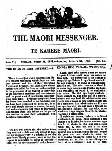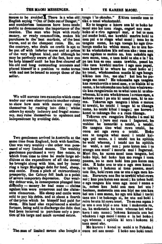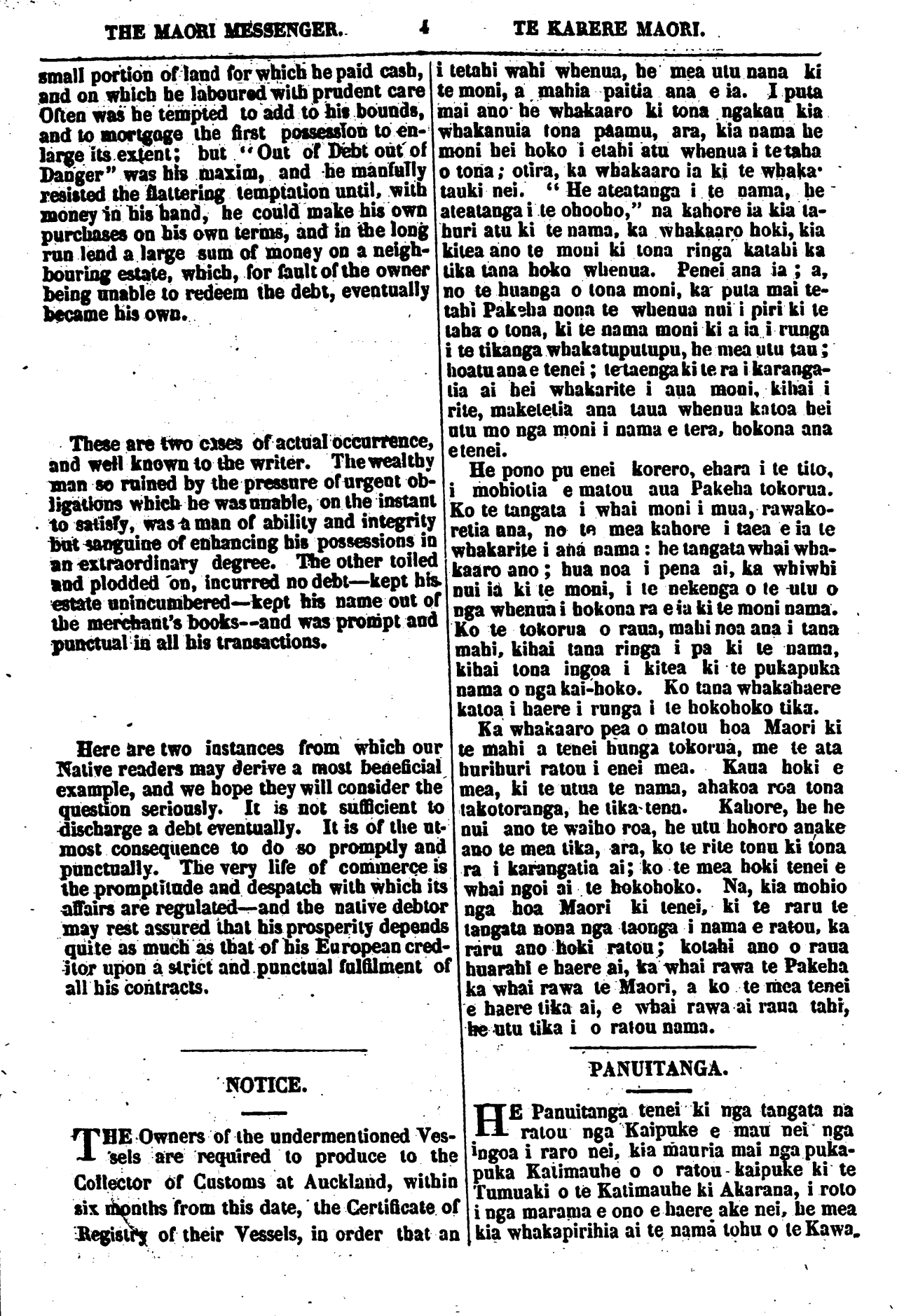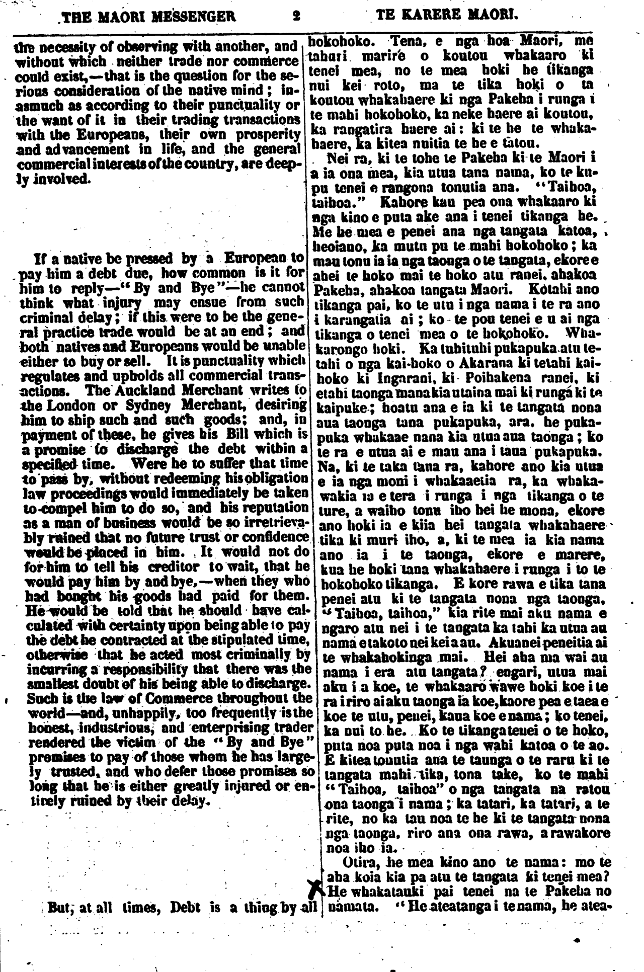 THE MAORI MESSENGER. TE KARERE MAORI. VOL. V.] AUCKLAND, AUGUST 51, 1858. AKARANA, AKUHATA 31, 1858. [No. 14. THE EVILS OF DEBT DEFERRED. 1. There is a subject which concerns our Na- tive readers respecting which, both on their own account and that of their European friends and brothers, we think a few obser- vations are called for from us;—that subject is the proneness of the Natives to incur debt to the European merchant and store-keeper and the great want of punctuality in dischar- ging such debts. Frequent complaints have for some time reached us on this head, and we have been requested to point out, in as brief and simple manner as we can, the many and serious injuries that result to merchants and traders from this failure on the part of the natives to meet their obligations with beneficial punctuality. We are well aware that the natives when they contract a debt not only intend to pay, but do ultimately pay it; but that is not the question Timely payment, such as one Eu- ropean is compelled to make to another— such, too, as one commercial nation is under KO NGA HE O TE NAMA WAIHO ROA. Kotahi tenei take korero e mea nei matou kia puta i konei etahi kupu ma matou mo taua mea. He korero nui ia, he tikanga ki runga ki nga Pakeha kinga Maori ano hoki. Ko nga tikanga o te nama ka whakaatuatu- rina atu nei. He whai tonu na te Maori ki te nama i nga taonga o nga Pakeha kai-hoko, a he whakaroa na ratou ki te whakarite i ana nama. He tini nga kupu whakahe i tenei tikanga he, kua puta mai ki a matou; meatia mai ana hoki kia whakaaturina ma- riretia atu e matou ki nga tangata Maori nga he o tenei mea, kia whakakitea atu ki a ra - tou nga tino kino me nga raru e tau ana ki nga kai-hoko Pakeha, na taua take, na te whakaroa a nga tangata Maori ki te whaka - rite tika i a ratou nama. E mohio ana matou, kahore o te Maori whakaaro ki te nuka, i tana namanga i nga taonga a te Pakeha, kei te mea ano tona nga- kau ki te whakarite tika i aua mea a etahi rangi atu, a, utua ana ano e ia: tona mutunga, ka utu ano. Haunga tenei, ko te kakawe roa ta matou e mea atu nei, engari kia pena ano tana whakarite nama me ta te Pakeha whakarite nama ki a ia wha- kapakeha, na, ka tika; na taua tikanga ho- horo ki te whakarite i tika ai te mahi