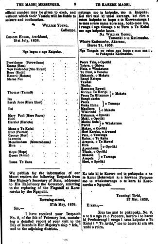 THE MAORI MESSENGER. 5 TE KARERE MAORI. official number may he given, to each, and without which their Vessels will be liable to seizure and confiscation.: WILLIAM YOUNG, Collector. Custom House, Auckland, 21 st July, 1858. WE publish for the information of our Maori readers the following Despatch from Her Majesty's Secretary of State, addressed to His Excellency the Governor, referring to the replacing of the Flagstaff at Koro- rareka by the Ngapuhi. Downing-street, 22th May, 1858. SIR, I have received your Despatch No. 8, of the 5th of February last, contain- ing a detailed report of your visit to the Bay of Islands io Her Mqjerty's ship " Iris," and to the adjoining districts. natanga mo ia kaipuke, mo ia kaipuke. Kei turi mai ki tenei karanga, kei riro o ratou kaipuke te hopu e te Kawanatanga i te mea e rere nama kore ana, hoko tonu atu, i ranga i nga tikanga o te Ture o Te Kuini mo nga kaipuke katoa. NA WILLIAM YOUNG, Tumuaki o te Katimauhe. Whare Katimauhe, Akarana, Hurae 21, 1858. KA taia ki te Karere nei te pukapuka a to te Kuini Hekeretari ki a Kawana Paraone mo te whakaturanga o te kara ki Koro- rareka e Ngapuhi Tauningi Tiriti, 27 Mei, 1858. E MARA,— Kua tae mai to pukapuka, No. 8, o te 5 o nga ra o Pepuere, korero i to haere ki Pewhairangi i runga i taua kaipuke o Te Kuini i "Te Arihi," me to haere ki era atu wahi o reira.