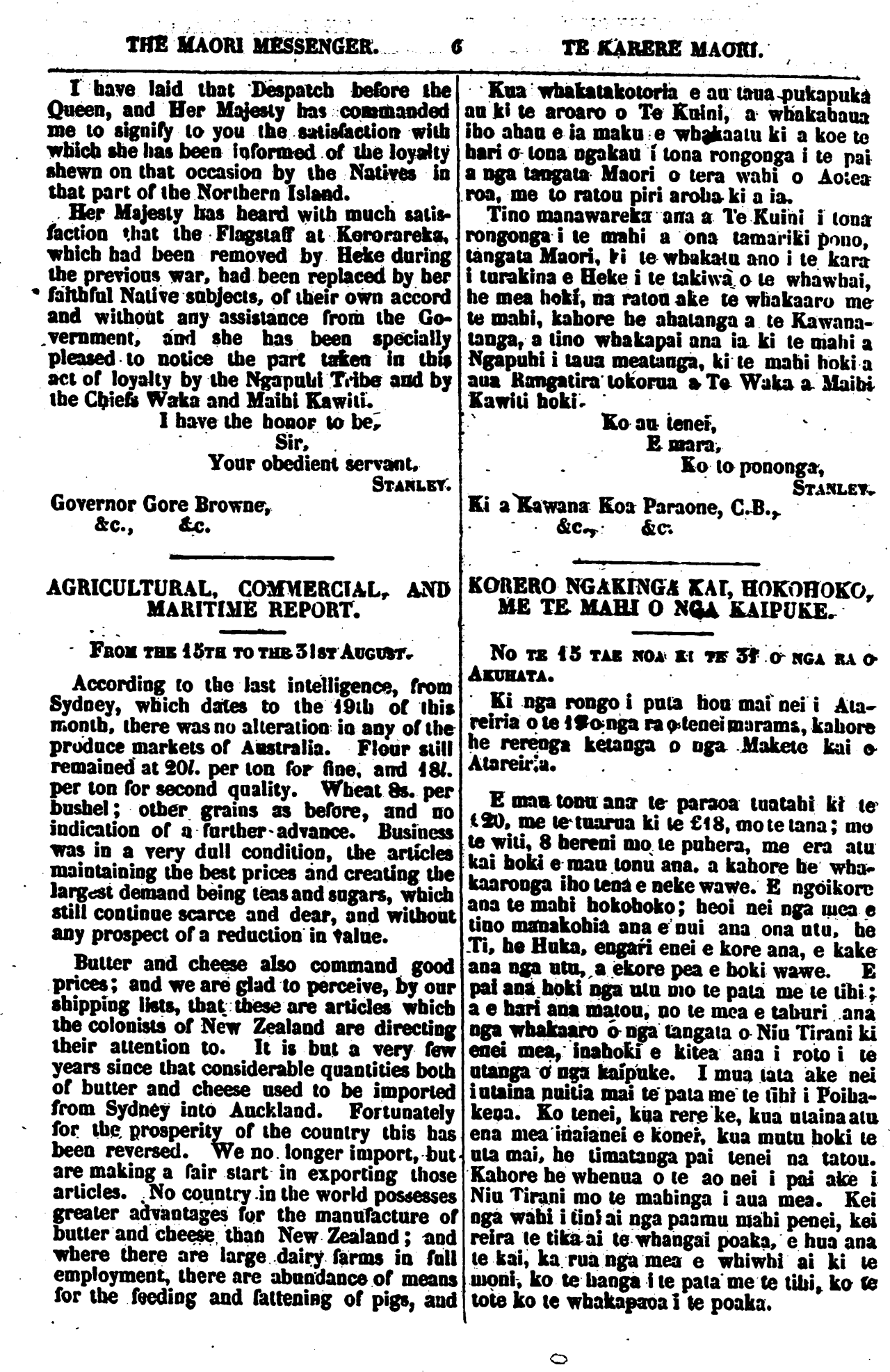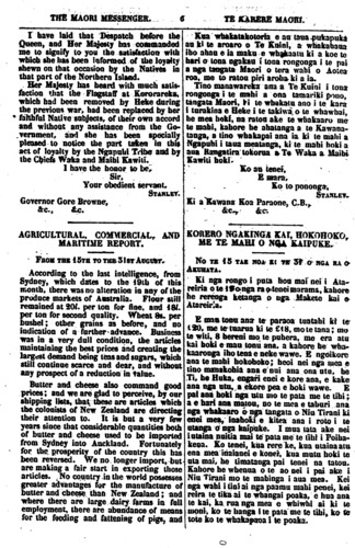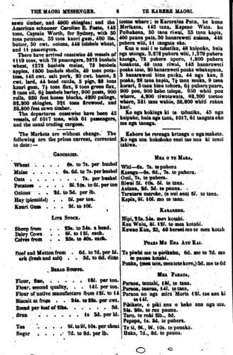 THE MAORI MESSENGER. 6 TE KARERE MA0RI. I have laid that Despatch before the Queen, and Her Majesty has commanded me to signify to you the satisfaction with which she has been informed of the loyalty shewn on that occasion by the Natives in that part of the Northern Island. Her Majesty has heard with much satis- faction that the Flagstaff at Kororareka, which had been removed by Heke during the previous war, had been replaced by her faithful Native subjects, of their own accord and without any assistance from the Go- vernment, and she has been specially pleased to notice the part taken in the act of loyally by the Ngapuhi Tribe and by the Chiefs Waka and Maihi Kawiti. I have the honor to be, Sir. Your obedient servant. STANLEY. Governor Gore Browne, &c., &c. AGRICULTURAL, COMMERCIAL, AND MARITIME REPORT . • FROM THE 15TH TO THE 31ST AUGUST. According to the last intelligence, from Sydney, which dates to the 19th of this month, there was no alteration in any of the produce markets of Australia. Flour still remained at 201 per ton for fine, and 181. per ton for second quality. Wheat 8s. per bushel; other grains as before, and no indication of a further advance. Business was in a very dull condition, the articles maintaining the best prices and creating the largest demand being teas and sugars, which still continue scarce and dear, and without any prospect of a reduction in value. Butter and cheese also command good prices; and we are glad to perceive, by our shipping lists, that these are articles which the colonists of New Zealand are directing their attention to. It is but a very few years since that considerable quantities both of butter and cheese used to be imported from Sydney into Auckland. Fortunately for the prosperity of the country this has been reversed. We no. longer import, but are making a fair start in exporting those articles. No country in the world possesses greater advantages for the manufacture of butter and cheese, than New Zealand; and where there are large dairy farms in full employment, there are abundance of means for the feeding and fattening of pigs, and Kua whakatakotoria e au taua pukapuka au ki te aroaro o Te Kuini, a whakahaua iho ahau e ia maku e whakaatu ki a koe te hari o tona ngakau i tona rongonga i te pai a nga tangata Maori o tera wahi o Aotea roa, me to ratou pin aroha ki a ia. Tino manawareka ana a Te Kuihi i tona rongonga i te mahi a ona tamariki pono, tangata Maori, ki te whakatu ano i te kara i turakina e Heke i te takiwa a te whawhai, he mea hoki, na ratou ake te whakaaro me te mahi, kahore be ahatanga a te Kawana- tanga, a tino whakapai ana ia ki te mahi a Ngapuhi i taua meatanga, ki te mahi hoki a ana Rangatira tokorua a Te Waka a Maihi Kawiti hoki. Ko au tenei, E mara, Ko to pononga, STANLEY Ki a Kawana Koa Paraone, C.B., &c., &c; KORERO NGAKINGA KAI, HOKOHOKO, ME TE MAHI O NGA KAIPUKE, NO TE 15 TAE NOA KI TE 31 O NGA RA O AKUHATA. Ki nga rongo i puta hou mai nei i Ata- reiria o te 15 o nga ra o tenei marama, kahore he rerenga ketanga o nga Makete kai o Atareiria. E mau tonu ana te paraoa tuatahi ki te 20, me te tuarua ki te £18, mo te tana; mo te witi, 8 hereni mo te puhera, me era atu kai hoki e mau tonu ana. a kahore be wha- kaaronga iho tena e neke wawe. E ngoikore ana te mahi hokohoko; heoi nei nga mea e tino manakohia ana e nui ana ona atu, he. Ti, he Huka, engari enei e kore ana, e kake ana nga utu, a ekore pea e hoki wawe. E pai ana hoki nga mu mo te pata me te tihi; a e hari ana matou, ao te mea e tahuri ana nga whakaaro o nga tangata o Niu Tirani ki enei mea, inahoki e kitea ana i roto i te utanga o nga kaipuke. I mua tata ake nei i utaina nuitia mai te pata me te tihi i Poiha- kena. Ko tenei, kua rere ke, kua utaina atu ena mea inaianei e konei. kua mutu hoki te uta mai, he. timatanga pai tenei oa tatou. Kahore he whenua o te ao nei i pai ate i Niu Tirani mo te mahinga i aua mea . Kei nga wahi i tini ai nga paamu mahi penei, kei reira te tika ai te whangai poaka, e hua ana te kai, ka rua nga mea e whiwhi ai ki te moni, ko te hanga i te pata me te tihi, ko te toie ko te whakapaoa i te poaka. o
