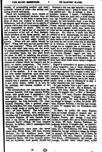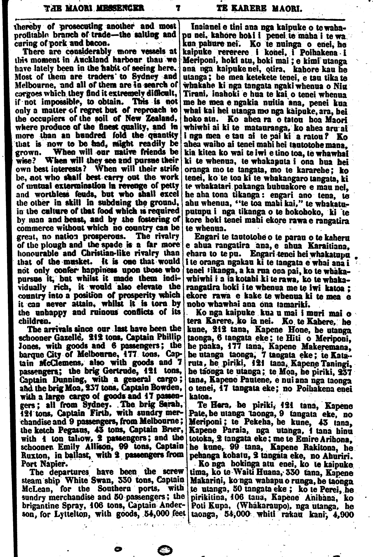 THE MAORl MESSENGER 7 TE KARERE MAORI. thereby of prosecuting another and most profitable branch of trade the salting and curing of pork and bacon. There are considerably more vessels at this moment in Auckland harbour than we have lately been in the habit of seeing here. Most of them are traders to Sydney and Melbourne and all of them are in search of cargoes which they find it extremely difficult, if not impossible, to obtain. This is not only a matter of regret but of reproach to the occupiers of the soil of New Zealand, where produce of the finest quality, and in more than an hundred fold the quantity that is now to be had, might readily be grown. Where will our native friends be wise? When will they see and pursue their own best interests? When will their strife be, not who shall best carry out the work of mutual extermination in revenge of petty and worthless feuds, but who shall excel the other in skill in subduing the ground, io the culture of that food which is required by mao and beast, and by the fostering of commerce without which no country can be great, no nation prosperous. The rivalry of the plough and the spade is a far more honourable and Christian like rivalry than that of the musket . It is one that would not only confer happiness— upon those who pursue it, but whilst it made them indi- vidually rich, it would also elevate the country into a position of prosperity which it can never attain, whilst it is torn by the unhappy and ruinous conflicts of its children. The arrivals since our last, have been the schooner Gazelle, 212 tons, Captain Philip 0Jones, with goods and 6 passengers; the barque City of Melbourne, 177 tons, Cap- tain McClemens, also with goods and 7 pasaengeni; tbe brig Gertrude, 121 ions, Captain Dunning, with a geoeral cargo; ahd the l)rig Moa, 257 too«, Captain Bowden, wilh a !arge cargo of good» and 17 pas«eo- gers; all rrorn Sydney • The brig Sarab, 121 ton». Captain Firtb. with sundry mer- chandise and 9 passengers, from Melboorne; ihe ketch Pegasus, 45 tons, Captain Bner, with i ion taliow, 2 p—engcre; and the schooneR Emily Allisoo, 99 tons» Captain Ruxton, in ballast, with 2 pa«eeoger» from Port Napier.' ' : The departures have been ihe screw steam ship White Swan, 530 tons« Captain McLean, tor ihe Southern ports, with sundry merchandise and 50 passengers; !be brigantine Spray, 106 Ions, Captain Ander- son, for Lyttellon, with goods, .54)000 feel Inaianei e tini ana nga kaipuke o te vaha« pa nei« kahore hoki i penei te maha i te wa koa pahure nei. Ko te nuinga o enei« he kaipuke rererere i kohei, i Poihakena - i Meriponi. hoki atu, hoki mai; e kimi'utanga ana nga kaipuke nei, Qtira, kabore kau he utanga; he mea ketekete tenei, e tau tika te whakahe ki nga tangata ngaki whenua o Niu Tirani, inahoki e hua te kai o tenei whenua me be mea e ngakia nuitia ana» penei kua whai kai hei utanga mo nga kaipuke, ara, hei hoko aia. Ko ahea ra o tatou hoa Maori whiwhi ai ki te matauranga, ko ahea ani-ai i nga mea e tao ai te pai ki a raiou ? Ko «hea waiho ai tenei mahi hei tautotohe mana, kia kitea ko wai te iwi e tino toa, Ie whawhai ki te whenua, te whakaputa i ona hua hei oranga mo te tangata, mo le kararebe; ko tenei, ko te toa ki te whakangaro tangata, ki te whakatau pakanga bubuakore e mau nei, he aha tona tikanga: engari ano tena, te ahu whenua, **te toa mahi kai," te whakatu- putupu i nga tikanga o te hokohoko, ki 'te kore hoki tenei mahi ekore rawa e rangatira te whenua. - Eogari te tautotohe o te pamu o te kahera e ahua rangatira ana, e ahua Karaitiana, ehara to tepu. Engari tenei hei whakatopa . i le oranga ngakau ki te tangata e whai ana i tenei (ikanga, a ka rna ona pai, ko te whaka- whiwhi i a iakotabi ki terawa, ko te whaka« raogatira hoki i te whenua me 19 iwi katoa ; ekore rawa e kake te whenua ki te mea e noho whawhai ana ona lamariki. . Ko nga kaipuke kua u mai i mori mai o tera Karere. .ko ia nei. Ko. te Kabere, he kune, 212 tana, Kapene Hone, he utanga taonga, O tangata eke; ie Hiti o Meriponi, be paaka» 177 iana, Kapene Makeremana, he utanga taonga, 7 tangata eke; ie Kate- ruta, be pinki, 121 tana,. Kapene Taningi, be taonga te utanga; te Moa, be piriki, 357 tana, Kapene Ramene, e nui ana nga taonga o tenei, 17 tangata eke; no Poihakena enei katoa» Te Ewa, be piriki, 431 tana, Kapene Pale, be manga taonga, 9 tangata eke, no Meriponi; te Pekeha, he kune, 43 iana, Kapene Paraia, nga utanga, I tana hinu totoka, .2 tangata eke; me te EmireAribona, he kune, 99 tana, Kapene Rakitona, he pehanga kohatu, 3 tangata eke» no Aburiri. Ko nga hokinga atu enei, ko (e kaipuke tima, ko te Waiti Huana, 330 (ana, Kapene Makarini, konga wahapu o ranga, be taonga .te utanga, 50 tangata eke; ko le Perei, be pirikilina, 106 iaua, Kapene Ahibana, ko Poti Kupa, (Whakaraupo), nga utanga, he taonga, 54,000 whiti rakau kani. 4,900