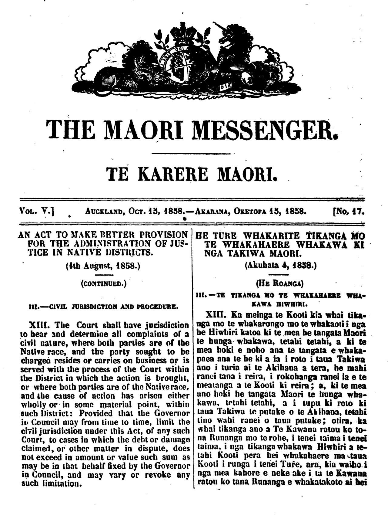 THE MAORI MESSENGER. TE KARERE MAORI. VOL. V.1 AUCKLAND, OCT. 15, 1858.—AKARANA, OKETOPA 15, 1858. [No, 17. AN ACT TO MAKE BETTER PROVISION FOR THE ADMINISTRATION OF JUS- TICE IN NATIVE DISTRICTS. (4th August, 1858.) (CONTINUED.) III-—CIVIL JURISDICTION AND PROCEDURE. XIII. The Court shall have judsdiction to hear and determine all complaints of a civil nature, where both parties are of the Native race, and the party sought to be charged resides or carries on business or is served with the process of the Court within the District in which the action is brought, or where both parties are of the Native race, and ihe cause of action has arisen either wholly or in some material point, within such District: Provided that the Governor in Council may from time to time, limit the civil jurisdiction under this Act, of any such Court, to cases in which the debt or damage claimed, or other matter in dispute, does not exceed in amount or value such sum as may be in that behalf fixed by the Governor in Council, and may vary or revoke any such limitation. HE TURE WHAKARITE TIKANGA MO TE WHAKAHAERE WHAKAWA KI NGA TAKIWA MAORI. (Akuhata 4, 1858.) (HE ROANGA) III. TE TIKANGA MO TE WHAKAHAERE WHA- KAWA HIWHIRI. XIII. Ka meinga te Kooti kia whai tika - nga mo te whakarongo mo te whakaoti i nga be Hiwhiri katoa ki te mea he tangata Maori te hunga whakawa, tetahi tetahi, a ki te mea hoki e noho ana te tangata e whaka- paea ana te he ki a ia i roto i taua Takiwa ano i turia ai te Akihana a tera, he mahi ranei tana i reira, i rokohanga ranei ia e te meatanga a te Kooti ki reira; a, ki te mea ano hoki he tangata Maori te hunga wha- kawa, tetahi tetahi, a i tupu ki roto ki taua Takiwa te putake o te Akinana, tetahi tino wahi ranei o taua putake; otira, ka whai tikanga ano a Te Kawana ratou ko to- na Runanga mo te rohe, i tenei taima i tenei taima, i nga tikanga whakawa Hiwhiri a te- tahi Kooti pera hei whakahaere ma taua Kooti i runga i tenei Ture, ara, kia waiho, i nga mea kahore e neke ake i ta te Kawana ratou ko tana Runanga e whakatakoto ai hei