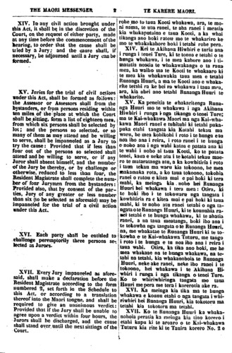 THE MAORI MESSENGER 2 TE KARERE MAORI. XIV. In any civil action brought under this Act, it shall be in the discretion of the Court, on the request of either party, made at any time before the commencement of the hearing, to order that the cause shall be tried by a Jury: and the cause shall, if necessary, be adjourned until a Jury can be formed. XV. Juries for the trial of civil actions under this Act, shall be formed- as follows: the Assessor or Assessors shall from the bystanders, or from persons residing within ten miles of the place at which the Court shall be sitting, form a list of eighteen men, from which six persons shall be selected by lot; and the persons so selected,, or so many of them as may attend and be willing to serve, shall be impanneled as a Jury, to try the cause: Provided that if less than four out of the persons so selected shall attend and be willing to serve, or if any Juror shall absent himself, and the number of the Jury, be thereby. or by challenge or otherwise, reduced to less than four, the Resident Magistrate shall complete the num- ber of four Jurymen from the bystanders: Provided also, that by consent of the par- ties, Jury, of any greater or less number than six (to be selected as aforesaid) may be impanneled for the trial of a civil action under this Act. XVI. Each party shall be entitled to challenge peremptorily three persons se- lected as Jurors. XVII. Every Jury impaneled as afore- said, shall make a declaration before the Resident Magistrate according to the form numbered 2, set forth in the Schedule to this Act, or according to a translation thereof into the Maori tongue, and shall be required to give an unanimous verdict: Provided that if the Jury, shall be unable to agree upon a verdict within four hours, the Jurors shall be discharged, and the cause shall stand over. until the next sittings of the Court. rohe mo to taua Kooti whakawa, ara, te mo- ni nama, te utu ranei, te aha ranei i meatia kia whakaputaina e taua Kooti, a ka whai tikanga ano hoki ratou mo te whakariro ke mo te whakakahore hoki i tetahi rohe pera. XIV Kei te Akihana Hiwhiri e turia ana i runga i tenei Ture, ki te tonoa e tetahi o te hunga whakawa, i te mea kahore ano i ti- matatia noatia te whakawakanga o ta raua mea, ka waiho ma te Kooti te whakaaro ki te mea kia whakawakia taua mea e tetahi Hunanga Huuri, a ma te Kooti ano e whaka- rite tetahi ra ke hei ra whakawa i taua mea, ara, kia ahei ana tetahi Runanga Huuri te whakarite . XV. Ka peneitia te whakaritenga Runa- nga Huuri mo te whakawa i nga Akihana Hiwhiri i runga i nga tikanga o tenei Ture; ma te Kai-whakawa Maori ma nga Kai-wha- kawa Maori ranei e tuhituhi ki tetahi puka - puka etahi tangata kia Kotahi tekau ma waru, he mea kohikohi i roto i te hunga e tu noa iho ana i reira, i roto ranei i te hunga e noho ana i nga wahi katoa e patata anu ki te wahi i noho ai taua Kooti, ko te patata tenei, kaua e neke atu i te kotahi tekau mae- ro te mataratanga atu, a ka kowhitiria i roto i taua tekau ma waru kia tokoono, he mea makamaka rota, a ko taua tokoono, tokohia ranei o ratou e kitea mai e pai hoki ki tera mahi, ka meinga kia - noho kei Runanga Huuri hei whakawa i tera mea: Otira, ki te hoki iho i te tokowaru nga tangata i kowhitiria ra e kitea mai e pai hoki ki taua mahi, ki te noho atu ranei tetahi o nga ta- ngata o te Runanga Huuri, ki te kounuhia ra- nei tetahi e te hunga whakawa, ki te ahatia ranei, a ua taua meatanga, hoki iho ana i te tokowha nga tangata o te Runanga Huuri, na, me whakatae te Runanga Huuri ki te to- kowha e te Kai-whakawa Tuturu. me tango i rota i te hunga e tu noa iho ana i reira i taua wahi. Otira, ka tika ano hoki, me he mea whakaae na te hunga whakawa, oa te- tahi oa tetahi, kia whakanohoia te Runanga Huuri, neke ake ranei, neke iho ranei i te tokoono, hei whakawa i te Akihana Hi- whiri i runga i nga tikanga a tenei Ture. Ko te whiriwhiringa tangata mo taua Huuri me pera me tera i korerotia ake ra. XVI. Ka meinga kia tika ma te hunga whakawa e kounu etahi o nga tangata i whi- riwhiri hei Runanga Huuri, kia tokotoru ma tetahi kia tokotoru ma tetahi. XVII. Ko te Runanga Huuri ka whaka- nohoia peratia ka meinga kia tino korera i etahi kupu ki te aroaro o te Kai-whakawa Tuturu kia rite ki te Tauira korero No. 2 e