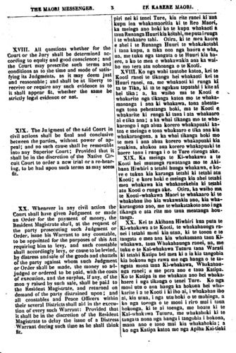 THE MAORI MESSENGER. 3 TE KARERE MAORI. XVIII. All questions whether for the Court or the Jury, shall be determined ac- cording to equity and good conscience; and the Court may prescribe such terms and conditions as to the time and mode of satis- fying its Judgments, as it may deem just and reasonable; and shall be at liberty to receive or require any such evidence as to it shall appear fit, whether the same be strictly legal evidence or not, XIX. The Judgement of the said Court in civil actions shall be final and conclusive between the parties, without power of ap- peal; and no such cause shall he removable into any Superior Court; Provided that it shall be in the discretion of the Native Cir- cuit Court to order a new trial or a re-hear- ing, to be had upon such terms as may seem fit. XX. Whenever in any civil action the Court shall have given Judgment or made an Order for the payment of money, the Resident Magistrate shall, at the request of the party prosecuting such Judgment or Order, issue his Warrant to any constable, to be appointed for the purposes of this Act requiring him to levy,and such constable shall accordingly levy, or cause to be levied, by distress and sale of the goods and chattels of the party against whom such Judgment or Order shall be made, the money so ad- judged or ordered to be paid, with the costs of execution, and the surplus, if any, of the money raised by such sale, shall be paid to the Resident Magistrate, and returned on demand of the parly distrained upon; and all constables and Peace Officers within their several Districts shall aid in the execu- tion of every such Warrant: Provided that it shall be in the discretion of the Resident Magistrate to delay the issue of a Distress Warrant during such time as he shall think fit. piri nei ki tenei Ture, kia rite ranei ki aua kupu ina whakamaoritia ki te Reo Maori, ka meinga ano hoki ko te kupu whakaoti & taua Runanga Huuri kia kotahi, me puta i runga i te whakaaro tahi. Otira, ki te men kaore e ahei i te Runanga Huuri te whakakotahi i tana kupu, a taka noa nga haora e wha, na, me tuku nga tangata o te Huuri kia ha- ere, a ko te mea e whakawakia ana ka wai- ho mo tera atu nohoanga o te Kooti. XVIII. Ko nga wahi tautohe katoa, kei te Kooti ranei te tikanga hei whakaoti kei te Huuri ranei, na, me whakaoti ki runga ki ta te Tika, ki ta te ngakau tapatahi i kite ai hei tika; a, ka waiho ma te Kooti e I whakarite nga tikanga katoa mo te whaka- mananga i ana ki whakawa, tona aheata- nga tona peheatanga hoki, ma te Kooti e whakarite ki runga ki tana i ata whakaaro ai e tika ana; a ka whai tikanga mo te wha- karongo i nga ahua korero whakapuaki ka- toa e meinga e tona whakaaro e tika ana kia whakarangona. a ka whai tikanga hoki mo te mea i aua ahua korero whakapuaki kia puakina, ahakoa aua korero whakapuaki te haere tonu i runga i o te Ture ritenga ake. XIX. Ka meinga te Ki-whakawa a te Kooti hei mutunga rawatanga mo te Aki- hana Hiwhiri a tetahi hunga whakawa, e ko- re e tukua kia karanga tetahi ki tetahi atu Kooti; e kore hoki e meinga kia ahei tetahi mea whakawa kia whakanekehia ki tetahi atu Kooti o runga ake. Otira, ka waiho ma te Kooti-whakawa Maori te whakaaro ki te whakahau iho kia wakawakia ano, kia wha- karangona ano, me te whakatakoto ano i nga tikanga e ata rite mo taua meatanga hou - tanga. XX. Kei te Akihana Hiwhiri kua puta te Ki-whakawa a te Kooti, te whakahaunga ra - nei i tetahi moni kia utua, ki te tonoa e te tangata e mea ana kia whakamana taua Ki- whakawa, taua Whakahaunga ranei, ua, me tuku e te Kai-whakawa Tuturu tana Warati ki tetahi Katipa hei mea ki a ia kia tangohia kia hokona nga rawa me nga hanga o te ta - ngata mona taua Ki-whakawa, Whakahau- nga ranei; a me pera ano e taua Katipa. Ko te Katipa ia me whakatu ano hei whaka- haere i nga tikanga o tenei Ture. Ko nga moni utu o ana hanga ka hokona hei wha,- karite i a te Kooti i ki iho ai, i whakahau iho ai, kia utua, i nga utu hoki o te mahinga, a ko nga toenga o te moni i riro mai i taua hokonga, ki te ai toenga, me hoatu ki te Kai-whakawa Tuturu, me whakahoki ki te tangata nona nga hangai tangohia i hokona, mana ano e tono mai kia whakahokia; a ko nga Katipa katoa me nga Apiha Kai-tiaki