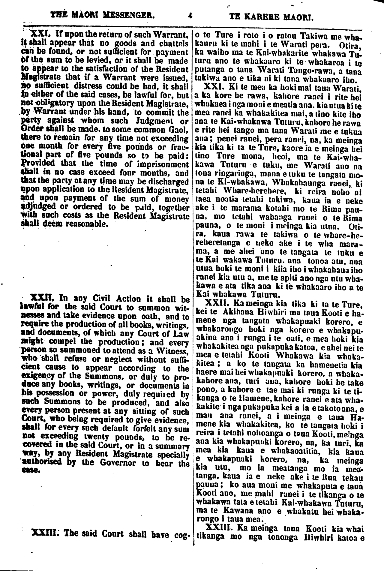 THE MAORI MESSENGER. 4 TE KARERE MAORI. XXI If upon the return of such Warrant, it shall appear that no goods and chattels can be found, or not sufficient for payment of the sum to be levied, or it shall be made to appear to the satisfaction of the Resident Magistrate that if a Warrant were issued, no sufficient distress could be had, it shall in either of the said cases, be lawful for, but not obligatory upon the Resident Magistrate, by Warrant under his hand, to commit the party against whom such Judgment or Order shall be made, to some common Gaol, there to remain for any time not exceeding one month for every five pounds or frac- tional part of five pounds so to be paid: Provided that the time of imprisonment shall in no case exceed four mouths, and that the party at any time may be discharged upon application to the Resident Magistrate, and upon payment of the sum of money adjudged or ordered to be paid, together with such costs as the Resident Magistrate shall deem reasonable. XXII. In any Civil Action it shall be lawful for the said Court to summon wit- nesses and take evidence upon oath, and to require the production of all books, writings, and documents, of which any Court of Law might compel the production; and every person so summoned to attend as a Witness, who shall refuse or neglect without suffi- cient cause to appear according to the exigency of the Summons, or duly to pro- duce any books, writings, or documents in bis possession or power, duly required by such Summons to be produced, and also every person present at any sitting of such Court, who being required to give evidence, shall for every such default forfeit any sum not exceeding twenty pounds, to be re- covered in the said Court, or in a summary way, by any Resident Magistrate specially authorised by the Governor to hear the case. XXIII. The said Court shall have cog- o te Ture i roto i o ratou Takiwa me wha - kauru ki te mahi i te Warati pera. Otira, ka waiho ma te Kai-whakarite whakawa Tu- turu ano te whakaaro ki te whakaroa i te putanga o tana Warati Tango-rawa, a tana takiwa ano e tika ai ki tana whakaaro iho. XXI. Ki te mea ka hoki mai taua Warati, a ka kore he rawa, kahore ranei i rite hei whakaea i nga moni e meatia ana. kia utua ki te mea ranei ka whakakitea mai, a tino kite iho ana te Kai-whakawa Tuturu, kahore he rawa e rite hei tango roa tana Warati me e tukua ana; penei ranei, pera ranei, na, ka meinga kia tika ki ta te Ture, kaore ia e meinga hei tino Ture mona, heoi, ma te Kai-wha- kawa Tuturu e tuku, me Warati ano na tona ringaringa, mana e tuku te tangata mo- na te Ki-whakawa, Whakahaunga ranei, ki tetahi Whare-herehere, ki reira noho ai taea noatia tetahi takiwa, kaua ia e neke ake i te marama kotahi mo te Rima pau- na, mo tetahi wahanga ranei o te Rima pauna, o te moni i meinga kia utua. OU- ra, kaua rawa te takiwa o te whare-he- reheretanga e neke ake i te wha mara- ma, a me ahei ano te tangata te tuku e te Kai wakawa Tuturu. ana tonoa atu. ana utua hoki te moni i kiia iho i whakahaua iho ranei kia utu a, me te apiti ano nga utu wha- kawa e ata tika ana ki te whakaaro iho a te Kai whakawa Tuturu. XXII. Ka meinga kia tika ki ta te Ture, kei te Akihana Hiwhiri ma taua Kooti e ha - mene nga tangata whakapuaki korero, e whakarongo hoki nga korero e whakapu- akina ana i runga i te oati, e mea hoki kia whakakitea nga pukapuka katoa, e ahei nei te mea e tetahi Kooti Whakawa kia whaka- kitea; a ko te tangata ka hamenetia kia haere mai hei whakapuaki korero, a whaka- kahore ana, turi aua, kahore hoki he take pono, a kahore e tae mai ki runga ki te ti- kanga o te Hamene, kahore ranei e ata wha- kakite i nga pukapuka kei a ia e takoto ana, e mau ana ranei, a i meinga e taua Ha - mene kia whakakitea, ko te tangata hoki i reira i tetahi nohoanga o taua Kooti, meinga ana kia whakapuaki korero, na, ka turi, ka mea kia kaua e whakaoatitia, kia kaua e whakapuaki korero, na, ka meinga kia utu, mo ia meatanga mo ia mea- tanga, kaua ia e neke ake i te Rua tekau pauna; ko aua moni me whakaputa e taua Kooti ano, me mahi ranei i te tikanga o te whakawa tata e tetahi Kai-whakawa Tuturu, ma te Kawana ano e whakatu hei whaka- rongo i taua mea. XXIII. Ka meinga taua Kooti kia whai tikanga mo nga tononga Hiwhiri katoa e
