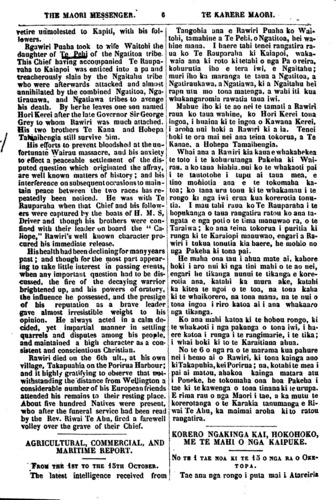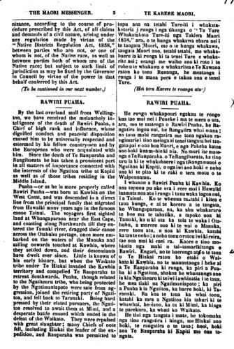 THE MAORI MESSENGER. TE KARERE MAORI. nizance, according to ihe course of pro- cedure prescribed by this Act, of all claims and demands of a civil nature, arising under any regulation made by virtue of the " Native Districts Regulation Act, 1858," between parties who are not, or one of whom is not, of the Native race, as well as between parties both of whom are of the Native race; but subject to such limit of jurisdiction as may be fixed by the Governor in Council by virtue of the power in that behalf conferred by this Act. (To be continued in our next number.) RAWIRI PUAHA. By the last overland mall from Welling- ton we have received the melancholy in- telligence of the death of Rawiri Puaha, a Chief of high rank and in influence, whose dignified conduct and peaceful disposition caused him to be universally respected and esteemed by his fellow countrymen and by the Europeans who were acquainted with him. Since the death of Te Rauparaha and Rangihaeata he has taken a prominent part in all matters of importance connected with the interests of the Ngatitoa tribe at Kapiti as well as of those tribes residing in the Middle Island. Puaha—or as he is more properly called Rawiri Puaha—was born at Kawhia on the West Coast, and was descended in a direct line from the principal family that migrated from Hawaiki many years ago in the famous canoe Tainui. The voyagers first sighted land at Whangaparaoa near the East Cape, and coasting along Northwards till they en- tered the Tamaki river, dragged their canoe across the Otahuhu portage, once more em- barked on the waters of the Manuka and sailing onwards touched at Kawhia, where they settled down, and their descendants have dwelt ever since. Little is known of bis early history, but when the Waikato tribe under Te Hiakai invaded the Kawhia territory and compelled Te Rauparaha to retreat Southwards, Puaha, though related to the Ngatiteuru tribe, who being protected by the Ngatimaniapoto were sale from ag- gression, joined the retiring party of Ngati- toa, and fell back to Taranaki. Being hard pressed by their elated pursuers, the Ngati- toa resolved to await them at Mimi, and a desperate battle ensued which ended in the defeat of the Waikato. They were repulsed with great slaughter; many Chiefs of note fell, including Hiakai the leader of the ex- pedition, and Rauparaha was permitted to tupu ana na tetahi Ture-iti i whakata- kotoria i runga i nga tikanga o " Te Ture Whakatakoto Ture-iti nga Takiwa Maori 1858," ara, o te hunga whakawa ehara nei i te tangata Maori, me o te hunga whakawa, tangata Maori ano, tetahi tetahi, me whaka- haere ia ki runga ki ta tenei Ture e whaka- rite nei; erangi me waiho ano ki roto i te rohe o te whakawa e whakaritea e Te Kawana ratou ko tona Runanga, he meatanga i runga i te maua pera e tukua ana e tenei Ture. (He tera Karere te roanga atu) RAWIRI PUAHA. He rongo whakapouri ngakau te rongo kua tae mai nei i Poneke i ma te mera o uta, ara, mo te matenga o Rawiri Puaha, he Ra- ngatira ingoa nui, he Rangatira whai mana; na tana mahi rangatira me tona ngakau ra- ngimarie i tino meinga ai tenei tangata hei tan- gata pai e ona hoa Maori, e nga Pakeha katoa ano hoki kua mohio ki aia. No muri i te mate- nga o Te Rauparaha, o Te Rangihaeata, ka tino uru ia ki te whakahaere i nga tikanga nunui o Ngatitoa ki Kapiti, o nga iwi ano hoki e noho ana ki te pito ki te raki o tera motu o te Waipounamu. I whanau a Rawiri Puaha ki Kawhia. Ko ana tupuna pu ake era i rere mai i Hawaiki inamata noa atu i runga i ta ua waka ingoa nui, i a Tainui. Ko te whenua tuatahi i kitea e taua hunga, e ai te korero a te tangata, ko Whangaparaoa, na, ka ahu whakararo te hoe ma te tahatika, a tapoko noa ki Tamaki, ka u ki uta ka toia te waka i Ota- huhu, a marere noa ki te wai o Manuka, rere tonu atu, u noa ki Kawhia, katahi ka tau te noho; a noho tonu o mou iwi ki reira, tae noa mai ki enei ra. Kaore e tino mo- hiotia nga mahi o tai-tamarikitanga o Rawiri. Engari, no te haerenga atu o te taua o Te Hiakai ratou ko etahi o Wai- kato ki Kawhia, no te maunutanga i heke ai a Te Rauparaha ki runga, ka piri a Pua- ha ki a Ngatitoa, ahakoa he whanaunga ano ia kia Ngatiteuru ki te iwi i awhinatia i te taua, he mea tiaki na Ngatimaniapoto; ka piri a Puaha kia Ngatitoa, ka haere hoki, ki Ta- ranaki. Ra koa te taua ka whai tonu, katahi ka mea a Ngatitoa kia tahuri ki te whawhai, heoiano, ka tu ki Mimi, ka hinga te parekura, ka whati ko Waikato. He tini nga tangata i mate, he tokomaha nga tino rangatira i hinga, me Hiakai ano hoki, te rangatira o te taua; heoi, hoki ana Te Rauparaha ki Kapiti me ona ta- ngata.