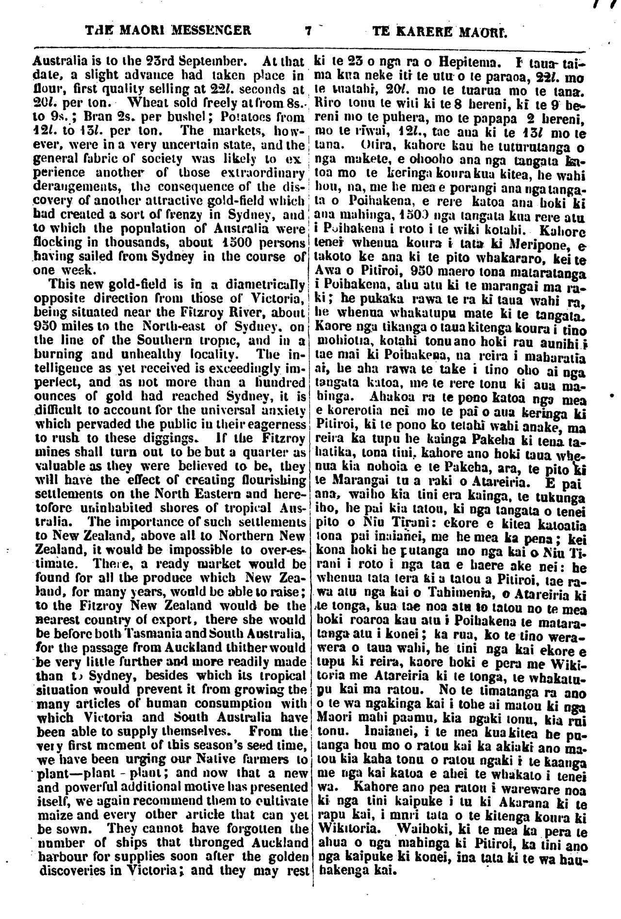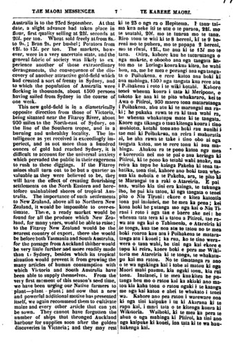 THE MAORI MESSENGER TE KARERE MAORI. Australia is to the 23rd September. At that date, a slight advance had taken palace in flour, first quality selling at 221 seconds at 201 per ton. Wheat sold freely at from 8s. to 9s.; Bran 2s. per bushel; Potatoes from 121. to 131. per ton. The markets, how- ever, were in a very uncertain state, and the general fabric of society was likely to ex- perience another of those extraordinary derangements, the consequence of the dis- covery of another attractive gold-field which bad created a sort of frenzy in Sydney, and to which the population of Australia were flocking in thousands, about 1500 persons having sailed from Sydney in the course of one week. This new gold-field is in a diametrically opposite direction from those of Victoria, being situated near the Fitzroy River, about 950 miles In the North-east of Sydney, on the line of the Southern tropic, and in a burning and unhealthy locality. The in- telligence as yet received is exceedingly im- perfect, and as not more than a hundred ounces of gold had reached Sydney, it is difficult to account for the universal anxiety which pervaded the public in their eagerness to rush to these diggings. If the Fitzroy mines shall turn out to be but a quarter as valuable as they were believed to be, they will have the effect of creating flourishing settlements on the North Eastern and here- tofore uninhabited shores of tropical Aus- tralia. The importance of such settlements to New Zealand, above all to Northern New Zealand, it would be impossible to over-es- timate. There, a ready market would be found for all the produce which New Zea- land, for many years, would be able to raise; to the Fitzroy New Zealand would be the nearest country of export, there she would be before both Tasmania and South Australia, for the passage from Auckland thither would be very little further and wore readily made than to Sydney, besides which its tropical situation would prevent it from growing the many articles of human consumption with which Victoria and South Australia have been able to supply themselves. From the very first moment of this season's seed time, we have been urging our Native farmers to plant—plant - plant; and now that a new and powerful additional motive has presented itself, we again recommend them to cultivate maize and every other article that can yet be sown. They cannot have forgotten the number of ships that thronged Auckland harbour for supplies soon after the golden discoveries in Victoria; and they may rest ki te 25 o nga ra o Hepitema. I taua tai- ma kua neke iti te utu o te paraoa, 221. mo te tuatahi, 201. mo te tuarua mo te tana. Riro tonu te witi ki te 8 hereni, ki te 9 he- reni mo te puhera, mo te papapa 2 hereni, mo te riwai, 12 1., tae aua ki te 131 mo te tana. Otira, kahore kau he tuturutanga o nga makete, e ohooho ana nga tangata ka- toa mo te keringa koura kua kitea, he wahi hou, na, me he mea e porangi ana nga tanga- ta o Poihakena, e rere katoa ana hoki ki ana mahinga, 1500 nga tangata kua rere atu i Poihakena i roto i te wiki kotahi. Kahore tenei whenua koura i tata ki Meripone, e takoto ke ana ki te pito whakararo, kei te Awa o Pitiroi, 950 maero tona mataratanga i Poihakena, ahu atu ki te marangai ma ra- ki; he pukaka rawa te ra ki taua wahi ra, he whenua whakatupu mate ki te tangata. Kaore nga tikanga o taua kitenga koura i tino mohiotia, kotahi tonu ano hoki rau aunihi i tae mai ki Poihakena, na reira i maharatia ai, he aha rawa te take i tino oho ai nga tangata katoa, me te rere tonu ki aua ma- hinga. Ahakoa ra te pono katoa nga mea e korerotia nei mo te pai o aua keringa ki Pitiroi, ki te pono ko tetahi wahi anake, ma reira ka tupu he kainga Pakeha ki tena ta- hatika, tona tini, kahore ano hoki taua whe- nua kia nohoia e te Pakeha, ara, te pito ki te Marangai tu a raki o Atareiria. E pai ana, waiho kia tini era kainga, te tukunga iho, he pai kia tatou, ki nga tangata o tenei pito o Mu Tirani: ekore e kitea katoatia tona pai inaianei, me he mea ka pena; kei kona hoki he putanga mo nga kai o Niu Ti- rani i roto i nga tau e haere ake nei: he whenua tata tera ki a tatou a Pitiroi, tae ra- wa atu nga kai o Tahimenia, o Atareiria ki te tonga, kua tae noa atu to tatou no te mea hoki roaroa kau atu i Poihakena te matara- tanga atu i konei; ka rua, ko te tino wera- wera o taua wahi, he tini nga kai ekore e tupu ki reira, kaore hoki e pera me Wiki- toria me Atareiria ki te tonga, te whakatu- pu kai ma ra tou. No te timatanga ra ano o te wa ngakinga kai i tohe ai matou ki nga Maori mahi paamu, kia ngaki tonu, kia rui tonu. Inaianei, i te mea kua kitea he pu- tanga hou mo o ratou kai ka akiaki ano ma- tou kia kaha tonu o ratou ngaki i te kaanga me nga kai katua e ahei te whakato i tenei wa. Kahore ano pea ratou i wareware noa ki nga tini kaipuke i tu ki Akarana ki te rapu kai, i muri tata o te kitenga koura ki Wikitoria. Waihoki, ki te mea ka pera te ahua o nga mahinga ki Pitiroi, ka tini ano nga kaipuke ki konei, ina tata ki te wa hau- hakenga kai.
