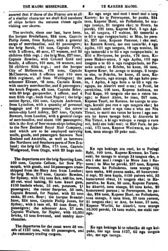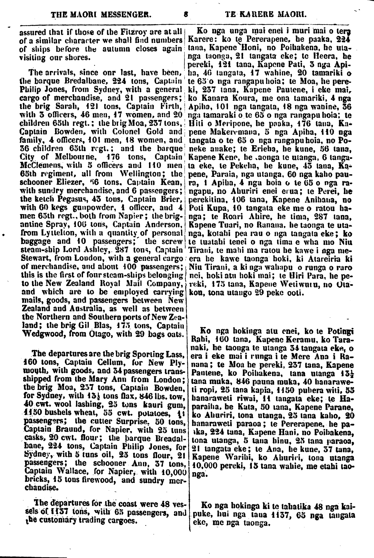 THE MAORI MESSENGER. TE KARERE MAORl. assured that if those of the Fitzroy are at all of a similar character we shall find numbers of ships before the autumn closes again visiting our shores. The arrivals, since our last, have been, the barque Bredalbane. 224 tons. Captain Philip Jones, from Sydney, with a general, cargo of merchandise, and 21 passengers; the brig Sarah. 121 tons, Captain Firth, with 5 officers, 46 men, 17 women, and 20 children 65th regt.; the brig Moa, 237 tons. Captain Bowden, with Colonel Gold and; family, 4 officers, 101 men, 18 women, and 36 children 65th regt.; and the barque City of Melbourne, 176 tons, Captain McClemens, with 5 officers and 110 men 65th regiment, all from Wellington; the schooner Eliezer, 56 tons, Captain Kean, with sundry merchandise, and 6 passengers; the ketch Pegasus, 43 tons. Captain Brier, with 60 kegs gunpowder, 1 officer, and 4 men 65th regt., both from Napier; the brig- antine Spray, 106 tons, Captain Anderson, from Lyttelton, with a quantity of personal baggage and 10 passengers;' the screw steam-ship Lord Ashley, 287 tons, Captain Stewart, from London, with a general cargo of merchandise, and about 100 passengers; this is the first of four steam-ships belonging to the New Zealand Royal Mail Company, and which are to be employed carrying mails, goods, and passengers between New Zealand and Australia, as well as between the Northern and Southern ports of New Zea- land; the brig Gil Blas, 175 tons, Captain Wedgwood, from Otago, with 29 bags oats. The departures are the brig Sporting Lass, 160 tons, Captain Cellum, for New Ply- mouth with goods, and 34 passengers trans- shipped from the Mary Ann from London; the brig Moa, 237 tons, Captain Bowden, for Sydney, with 13½ tons flax, 846 Ibs. tow, 40 cwt. wool lashing, 25 tons kauri gum, 1150 bushels wheat, 55 cwt. potatoes, 11 passengers; the cutter Surprise. 50 tons. Captain Braund, for Napier, with 25 tuns casks, 20 cwt. flour; the barque Breadal- bane, 224 tons, Captain Philip Jones, for Sydney, with 5 tuns oil, 25 tons flour, 21 passengers; the schooner Ann, 37 tons. Captain Wallace, for Napier, with 1O, OO0 bricks, 15 tons firewood, and sundry mer- chandise. The departures for the coast were 48 ves- sels of 1137 tons, with 65 passengers, and the customary trading cargoes. Ko nga unga mai enei i muri mai o tera Karere: ko te Pererapene, he paaka, 224 tana, Kapene Honi, no Poihakena, he uta- nga taonga, 21 tangata eke; te Heera. he pereki, 121 tana, Kapene Pati, 3 nga Api- ha, 46 tangata, 17 wahine, 20 tamariki o te 65 o nga ra ngapu hoia; te Moa, he pere- ki, 237 tana, Kapene Pautene, i eke mai, ko Kanara Koura, me ona tamariki, 4 nga Apiha, 101 nga tangata, 18 nga wahine, 36 nga tamaraki o te 65 o nga rangapu hoia; te Hiti o Meripone, he paaka, 176 tana, Ka- pene Makeremana, 5 nga Apiha, 110 nga tangata o te 65 o nga rangapu hoia, no Po- neke anake; te Erieha, be kune. 56 tana, Kapene Kene, he taonga te utanga, 6 tanga- ta eke, te Pekeha, he kune, 43 tana, Ka- pene, Paraia, nga utanga, 60 nga kaho pau- ra, 1 Apiha, 4 nga hoia o te 05 o nga ra- ngapu, no Ahuriri enei erua; te Perei, he perekitina. 106 tana, Kapene Anihana, no Poti Kupa. 10 tangata eke me o ratou ha- nga; te Roari Ahire, he tima, 287 tana, Kapene Tuari, no Ranana, he taonga te uta- nga, kotahi pea rau o nga tangata eke; ko te tuatahi tenei o nga tima e wha mo Niu Tirani, te mahi ma ratou be kawe i nga me- era he kawe taonga hoki, ki Atareiria ki Niu Tirani, a ki nga wahapu o runga o raro nei, hoki atu hoki mai; te Hiri Para, he pe- reki. 175 tana, Kapene Wetiwuru, no Ota- kou, tona mango 29 peke ooti. Ko nga hokinga atu enei, ko te Potingi Rahi, 160 tana. Kapene Keramu, ko Tara- naki, he taonga te utanga 54 tangata eke, o era i eke mai i runga i te Mere Ana i Ra- nana; te Moa he pereki, 237 tana, Kapene Pautene, ko Poihakena, tana utanga 13½ tana muka, 846 pauna muka, 40 hanarawe- ti ropi, 25 tana kapia, 1150 puhera witi, 55 hanaraweti riwai, 11 tangata eke; te Ha- paraiha, be Kata, 50 tana. Kapene Parane, ko Ahuriri, tona utanga, 25 tana kaho, 20 hanaraweti paraoa; te Pererapene, he pa- aka, 224 tana, Kapene Hani, no Poihakena, tona utanga, 5 tana hinu. 25 tana paraoa, 21 tangata eke; te Ana, he kune. 37 tana, Kapene Warihi, ko Ahuriri, tona utanga 10, 000 pereki, 15 tana wahie, me etahi tao- nga. Ko nga hokinga ki te tahatika 48 nga kai- puke, hui nga taua 1137, 65 nga tangata eke, me nga taonga.