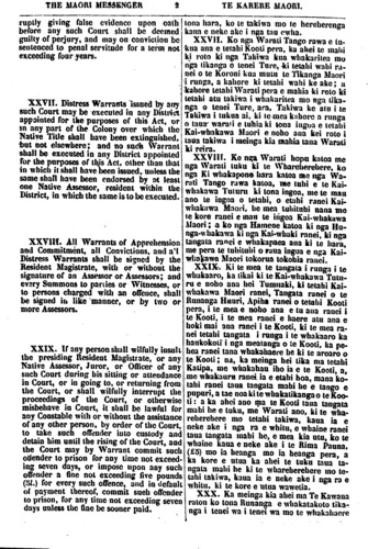 THE MAORI MESSENGER TE KARERE MAORI. ruptly giving false evidence upon oath before any such Court shall be deemed guilty of perjury, and may on conviction be sentenced to penal servitude for a term not exceeding four years. XXVII. Distress Warrants Issued by any such Court may be executed in any District appointed for the purposes of this Act, or in any part of the Colony over which the Native Title shall have been extinguished, but not elsewhere; and no such Warrant shall be executed in any District appointed for the purposes of this Act, other than that in which it shall have been issued, unless the same shall have been endorsed by at least one Native Assessor, resident within the District, in which the same is lobe executed. XXVIII. All Warrants of Apprehension and Commitment, all Convictions, and all Distress Warrants shall be signed by the Resident Magistrate, with or without the signature of an Assessor or Assessors; and every Summons to parties or Witnesses, or to persons charged with an offence, shall be signed in like manner, or by two or more Assessors. XXIX. If any person shall wilfully insult the presiding Resident Magistrate, or any Native Assessor, Juror, or Officer of any such Court during his sitting or attendance in Court, or in going to, or returning from Ihe Court, or shall wilfully interrupt the proceedings of the Court, or otherwise misbehave in Court, it shall be lawful for any Constable with or without the assistance of any other person, by order of the Court, to take such offender into custody and detain him until the rising of the Court, and the Court may by Warrant commit such offender to prison for any time not exceed- ing seven days, or impose upon any such offender a fine not exceeding five pounds (51) for every such offence, and in default of payment thereof, commit such offender to prison, for any time not exceeding seven days unless the fine be sooner paid. tona hara, ko te takiwa mo te hereherenga kaua e neke ake i nga tau ewha. XXVII. Ko nga Warati Tango rawa e tu- kua ana e tetahi Kooti pera, ku ahei te mahi ki roto ki nga Takiwa kua whakaritea mu nga tikanga o tenei Ture, ki tetahi wahi ra- nei o te Koroni kua mutu te Tikanga Maori i runga, a kahore ki tetahi wahi ke ake; a kahore tetahi Warati pera e mahia ki roto ki tetahi atu takiwa i whakaritea mo nga tika- nga o tenei Ture, ara, Takiwa ke atu i te Takiwa i tukua ai, ki te mea kahore a runga o taua warati e tuhia ki kona ingoa e tetahi Kai -whakawa Maori e noho ana kei roto i taua takiwa i meinga kia mahia taua Warati ki reira, XXVIII. Ko nga Warati hopu katoa me nga Warati tuku ki te Whareherehere, ko nga Ki whakapono hara katoa me nga Wa- rati Tango rawa katoa, me tuhi e te Kai- whakawa Tuturu ki tona ingoa, me te mau ano te ingoa o tetahi, o etahi ranei Kai- whakawa Maori, he mea tuhituhi nana mo te kore ranei e man te ingoa Kai-whakawa Maori; a ko nga Hamene katoa ki nga Hu- nga-whakawa ki nga Kai-whaki ranei, ki nga tangata ranei e whakapaea ana ki te hara, me pera te tuhituhi o raua ingoa e nga Kai- whakawa Maori tokorua tokohia ranei. XXIX. Ki te mea te tangata i runga i te whakaaro, ka tikai ki te Kai-whakawa Tutu- ru e noho ana hei Tumuaki, ki tetahi Kai- whakawa Maori ranei, Tangata ranei o te Runanga Huuri, Apiha ranei o tetahi Kooti pera, i te mea e noho ana e tu aua ranei i te Kooti, i te mea ranei e haere atu ana e hoki mai ana ranei i te Kooti, ki te mea ra - nei tetahi tangata i runga i te whakaaro ka haukokoti i nga meatanga o te Kooti, ka pe- hea ranei tana whakahaere be ki te aroaro o te Kooti; na, ka meinga hei tika ma tetahi Katipa, me whakahau iho ia e te Kooti, a, me whakauru ranei ia e etahi hoa, mana ko- tahi ranei taua tangata mahi he e tango e pupuri, a tae noa ki te whakatikanga o te Koo- ti: a ka ahei ano ma te Kooti taua tangata mahi he e tuku, me Warati ano, ki te wha- reherehere mo tetahi takiwa, kaua ia e neke ake i nga ra e whitu, e whaine ranei taua tangata mahi he, e mea kia utu, ko te whaine kaua e neke ake i te Rima Pauna, (£5) mo ia heanga mo ia heanga pera, a ka kore e utua ka ahei te tuku taua ta- ngata mahi he ki te whareherehere mo te- tahi takiwa, kaua ia e neke ake i nga ra e whitu, ki te kore e utua wawetia. XXX. Ka meinga kia ahei ma Te Kawana ratou ko tona Runanga e whakatakoto tika- nga i tenei wa i tenei wa mo te whakahaere
