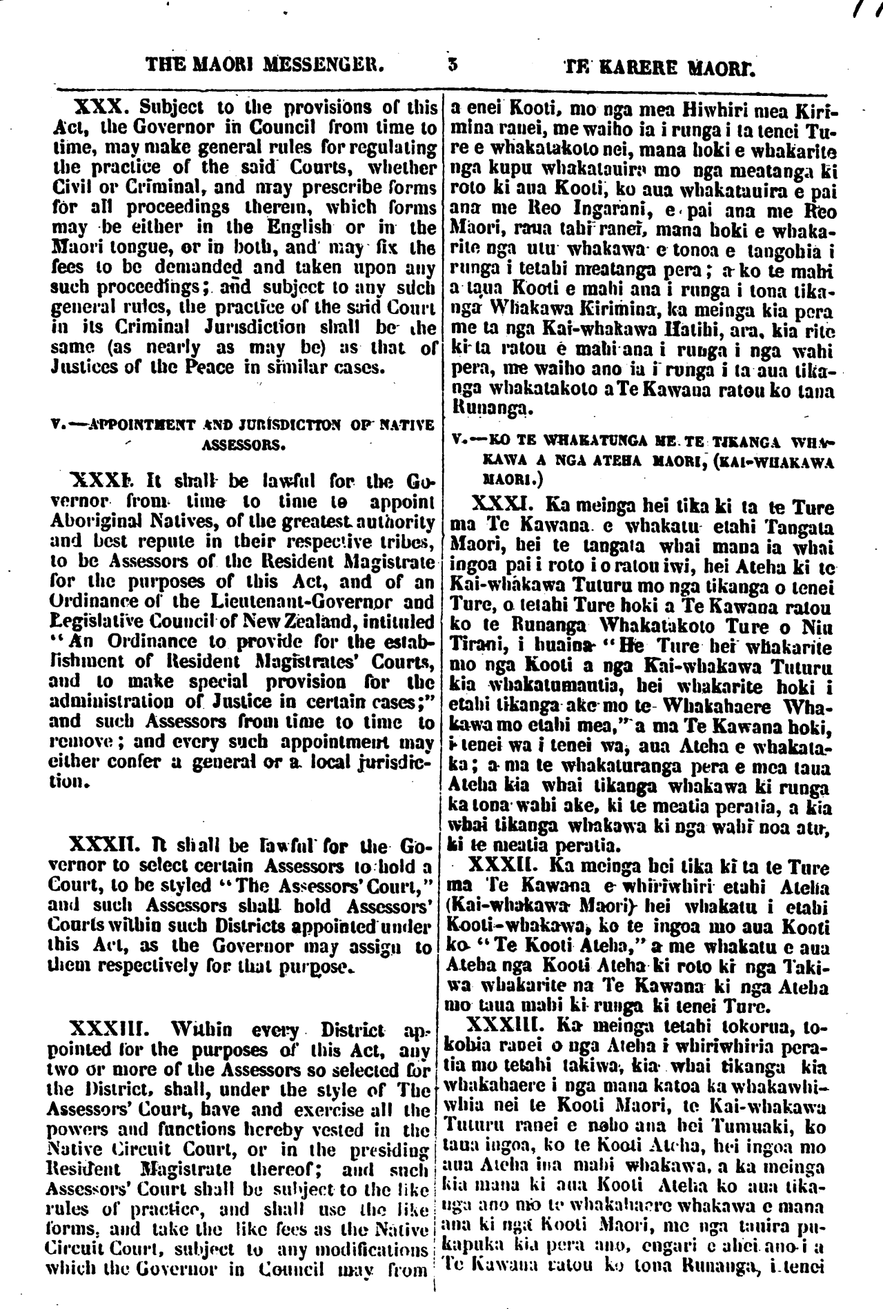 THE MAORI MESSENGER. 5 TE KARERE MAORI. XXX. Subject to the provisions of this Act, the Governor in Council from time to time, may make general rules for regulating the practice of the said Courts, whether Civil or Criminal, and may prescribe forms for all proceedings therein, which forms may be either in the English or in the Maori tongue, or in both, and may fix the fees to be demanded and taken upon any such proceedings; and subject to any such general rules, the practice of the said Court in its Criminal Jurisdiction shall be the same (as nearly as may be) as that of Justices of the Peace in similar cases. V.—APPOINTMENT AND JURISDICTION OF NATIVE ASSESSORS. XXXI. It shall be lawful for the Go- vernor from time to time to appoint Aboriginal Natives, of the great authority and best repute in their respective tribes, to be Assessors of the Resident Magistrate for the purposes of this Act, and of an Ordinance of the Lieutenant-Governor and Legislative Council of New Zealand, intituled "An Ordinance to provide for the estab- lishment of Resident Magistrates Courts, and to make special provision for the administration of Justice in certain cases;" and such Assessors from time to time to remove; and every such appointment may either confer a general or a local Jurisdic- tion. XXXII. It shall be lawful for the Go- vernor to select certain Assessors to hold a Court, to be styled "The Assessors Court," and such Assessors shall hold Assessors' Courts within such Districts appointed under this Act, as the Governor may assign to them respectively for that purpose. XXXIlI. Within every District ap- pointed for the purposes of this Act, any two or more of the Assessors so selected for the District, shall, under the style of The Assessors'' Court, have and exercise all the powers and functions hereby vested in the Native Circuit Court, or in the presiding Resident Magistrate thereof; and such Assessors' Court shall be subject to the like rules of practice, and shall use the like forms, and take the like fees as the Native Circuit Court, subject to any modifications which the Governor in Council may from a enei Kooti, mo nga mea Hiwhiri mea Kiri- mina ranei, me waiho ia i runga i ta tenei Tu- re e whakatakoto nei, mana hoki e whakarite nga kupu whakatauira mo nga meatanga ki roto ki aua Kooti, ko aua whakatauira e pai ana me Reo Ingarani, e pai ana me Reo Maori, raua tahi ranei, mana hoki e whaka- rite nga utu whakawa e tonoa e tangohia i runga i tetahi meatanga pera; a ko te mahi a taua Kooti e mahi ana i runga i tona tika- nga Whakawa Kirimina, ka meinga kia pera me ta nga Kai-whakawa Hatihi, ara, kia rite ki ta ratou e mahi ana i runga i nga wahi pera, me waiho ano ia i runga i ta aua tika- nga whakatakoto a Te Kawana ratou ko tana Runanga. V.—KO TE WHAKATUNGA ME TE TIKANGA WHA KAWA A NGA ATEHA MAORI, (KAI-WHAKAWA MAORI,) XXXI. Ka meinga hei tika ki ta te Ture ma Te Kawana e whakatu etahi Tangata Maori, hei te tangata whai mana ia whai ingoa pai i roto i o ratou iwi, hei Ateha ki te Kai-whakawa Tuturu mo nga tikanga o tenei Ture, o tetahi Ture hoki a Te Kawana ratou ko te Runanga Whakatakoto Ture o Niu Tirani, i huaina " He Ture hei whakarite mo nga Kooti a nga Kai-whakawa Tuturu kia whakatumautia, hei whakarite hoki i etahi tikanga ake mo te Whakahaere Wha- kawa mo etahi mea," a ma Te Kawana hoki, i tenei wa i tenei wa, aua Ateha e whakata- ka; a ma te whakaturanga pera e mea taua Ateha kia whai tikanga whakawa ki runga ka tona wahi ake, ki te meatia peratia, a kia whai tikanga whakawa ki nga wahi nga atu, ki te meatia peratia. XXXII. Ka meinga hei tika ki ta te Ture ma Te Kawana e whiriwhiri etahi Ateha (Kai-whakawa' Maori) hei whakatu i etahi Kooti-whakawa, ko te ingoa mo aua Kooti ko " Te Kooti Ateha," a me whakatu e aua Ateha nga Kooti Ateha ki roto ki nga Taki- wa whakarite na Te Kawana ki nga Ateha mo taua mahi ki runga ki tenei Ture. XXXIII. Ka meinga tetahi tokorua, to- kohia ranei o nga Ateha i whiriwhiria pera- tia mo tetahi takiwa, kia whai tikanga kia whakahaere i nga mana katoa ka whakawhi- whia nei te Kooti Maori, te Kai-whakawa Tuturu ranei e noho ana hei Tumuaki, ko taua ingoa, ko Ie Kooti Ateha, hei ingoa mo aua Ateha ina mahi whakawa, a ka meinga kia mana ki aua Kooti Ateha ko aua tika- nga ano mo te whakahaere whakawa e mana ana ki nga Kooti Maori, me nga tauira pu- kapuka kia pera ano, engari e ahei ano i a Te Kawana tatou ko tona Runanga, i tenei