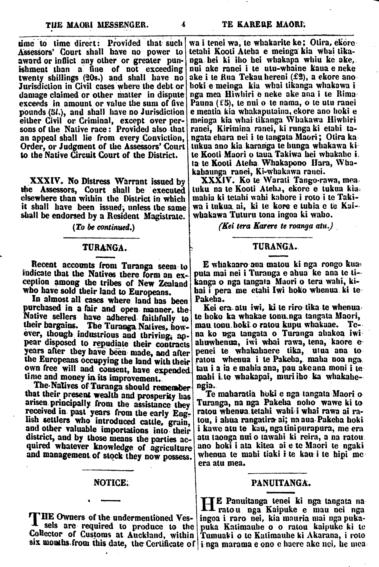 THE MAORI MESSENGER. TE KARERE MAORI. time to time direct: Provided that such Assessors' Court shall have no power to award or inflict any other or greater pun- ishment than a fine of not exceeding twenty shillings (20s.) and shall have no Jurisdiction in Civil cases where the debt or damage claimed or other matter in dispute exceeds in amount or value the sum of five pounds (51), and shall have no Jurisdiction either Civil or Criminal, except over per- sons of the Native race: Provided also that an appeal shall lie from every Conviction, Order, or Judgment of the Assessors' Court to the Native Circuit Court of the District. XXX IV. No Distress Warrant issued by the Assessors, Court shall be executed elsewhere than within the District in which it shall have been issued, unless the same shall be endorsed by a Resident Magistrate. (To be continued.) TURANGA. Recent accounts from Turanga seem to indicate that the Natives there from an ex- ception among the tribes of New Zealand who have sold their land to Europeans. In almost all cases where land has been purchased in a fair and open manner, the Native sellers have adhered faithfully to their bargains. The Turanga Natives, how- ever, though industrious and thriving, ap- pear disposed to repudiate their contracts years after they have been made, and after the Europeans occupying the land with their own free will and consent, have expended. time and money in its improvement. The. Natives of Turanga should remember that their present wealth and prosperity has arisen principally from the assistance they received io past years from the early Eng- lish settlers who introduced cattle, grain, and other valuable importations into their district, and by those means the parties ac- quired whatever knowledge of agriculture and management of stock they now possess. NOTICE. THE OWNERS of the undermentioned Ves- sels are required to produce to the Collector of Customs at Auckland, within six months from this date, the Certificate of wa i tenei wa, te whakarite ke; Otira, ekore tetahi Kooti Ateha e meinga kia whai tika- nga hei ki iho hei whakapa whiu ke ake, nui ake ranei i te utu-whaine kaua e neke ake i te Rua Tekau hereni (£2), a ekore ano hoki e meinga kia whai tikanga whakawa i nga mea Hiwhiri e neke ake ana i te Rima Pauna (£5), te nui o te nama, o te utu ranei e meatia kia whakaputaina, ekore ano hoki e meinga kia whai tikanga Whakawa Hiwhiri ranei, Kirimina ranei, ki runga ki etahi ta- ngata ehara nei i te tangata Maori; Otira ka tukua ano kia karanga te hunga whakawa ki te Kooti Maori o taua Takiwa hei whakahe i ta te Kooti Ateha Whakapono Hara, Wha- kahaunga ranei, Ki-whakawa ranei. XXXIV. Ko te VVarati Tango-rawa, mea. tuku na te Kooti Ateha, ekore e tukua kia: mahia ki tetahi wahi kahore i roto i te Taki- wa i tukua ai, ki te kore e tuhia e te Kai- whakawa Tuturu tona ingoa ki waho. (Kei tera Karere te Toanga atu.) TURANGA. E whakaaro ana matou ki nga rongo kua- puta mai nei i Turanga e ahua ke ana te ti- kanga o nga tangata Maori o tera wahi, ki- hai i pera me etahi Iwi hoko whenua ki te Pakeha. Kei era atu iwi, ki te riro tika te whenua te boko ka whakae tonu. nga tangata Maori, mau tonu. hoki o ratou kupu whakaae. Te- na ko nga tangata o Turanga ahakoa iwi ahuwhenua, iwi whai rawa, tena, kaore e penei te whakahaere tika, utua ana to ratou whenua i te Pakeha, maha noa nga tau i a ia e mahia ana, pau ake ana moni i te mahi Ite whakapai, muri iho ka whakahe- ngia. Te maharatia huki e nga tangata Maori a Turanga, na nga Pakeha noho wawe ki to ratou whenua tetahi wahi i whai rawa ai ra- tou, i ahua rangatira ai; na aua Pakeha hoki i kawe atu te kau, nga tini purapura, me era atu taonga nui o tawahi ki reira, a na ratou ano hoki i ata kitea ai e te Maori te ngaki whenua te mahi tiaki ite kau i te hipi me era atu mea. PANUITANGA. HE Panuitanga tenei ki nga tangata na rato u nga Kaipuke e mau nei nga ingoa i raro nei, kia mauria mai nga puka- puka Katimauhe o o ratou kaipuke ki te Tumuaki o te Katimauhe ki Akarana, i roto I i nga marama e ono e haere ake nei, he mea