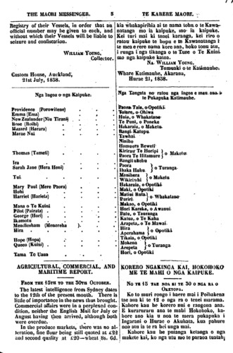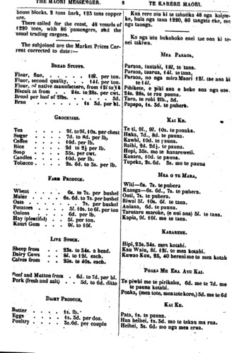 THE MAORI MESSENGER. TE KARERE MAORI. Registry of their Vessels, in order that an official number may he given to each, and without which their Vessels will be liable to seizure and confiscation. WILLIAM YOUNG, Collector. Custom House, Auckland, 21st July, 1858. Nga Ingoa a nga Kaipuke. Providence (Porowitene) Emma (Ema) New Zealander (Niu Tirani) Rose (Roihi) Hazard (Harara) Marae Nui Thomas (Tamati) lra Sarah Jane (Hera Honi) Tui Mary Paul (Mere Paora) Hohi Harriet (Harieta) Mana o Te Kuini Pilot (Pairata) George (Hori) Ikamotu Mendlesham (Menereha) Hira Hope (Hopa) Queen (Kumi) Tama Te Uaua AGRICULTURAL, COMMERCIAL, AND MARITIME REPORT. FROM THE 15TH TO THE 30TH OCTOBER. The latest intelligence from Sydney dates to the 12th of the present month. There is little of importance in the news thus brought. Commercial affairs were in a perplexed con- dition, neither the English Mail for July or August having then arrived, although both were overdue. In the produce markets, there was no al- teration, fine flour being still quoted at £22 and second quality at £20—wheat 8s, 6d. kia whakapirihia ai te nama tohu. o te Kawa- natanga mo ia kaipuke, mo ia kaipuke. Kei turi mai ki tenet karanga, kei riro o ratou kaipuke te hopu e te Kawanatanga i te mea e rere nama kore ana, hoko tonu atu, i runga i nga tikanga o te Ture o Te Kuini mo nga. kaipuke katoa. NA WILLIAM YOUNG, Tumuaki o te Katimauhe. Whare Katimauhe, Akarana, Hurae 21, 1858. Nga Tangata no ratou nga ingoa e mau. ana i te Pukapuka Katimauhe. Paora Taia, o Opotiki Tatare, o Ohiwa Huia, o Whakatane Te Puni, o Poneke Hakaraia, o Maketu. Rangi Katupu Tawhai. Niniho Hamuera Reweti Kirirau Te Horipi ) o Maketu Paora Te Hitimure Rangitukehu Ihaka Huhu} o Turanga Manihera} o Maketu Wikiriwhi Hakaraia o Opotiki Maki, o Opotiki Matini Ruta Puriri o Whakatane Makao, o Opotiki Hori Karaka, o Awanui Patu, o Tauranga Katua,, o Te Kaha Arapeta o Te Mawai. Aperahama Tikaia, o Opotiki Mokena o Turanga Arepeta Hori, o Opotiki KORERO NGAKINGA KAI. HOKOHOKO ME TE MAHI O NGA KAIPUKE. NO TE I5 TAE NOA KI TE 30 O NGA RA O OKETOPA. Ko to muri rongo i haere mai i Poihakena tae ana ki te 12 o nga ra o tenei marama. Kahore kau he korero nui e rangona ana. E kuraruraru ana te mahi Hokohoko, ka- hore ano kia u noa te mera pukapuka i Ingarani o Hurae o Akuhata, kua pahure noa atu ia te ra hei unga mai. Kahore kau ke putanga ketanga o nga makete kai, ko nga utu mo te paraoa tuatahi