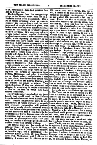 THE MAORI MESSENGER. 6 TE KARERE MAORI. to 9s. per bushel;—bran: 2s.; potatoes from £15 to £18 per ton. The intelligence from the new gold dig- gings, at the Fitzroy River, were not so fa- vourable as bad been anticipated. This is by no means surprising when we come to consider the extraordinary and the enor- mous rush of people which took place, even before there were any well authenticated ac- counts of the extent or productiveness of the new territory. It is now reported to be of very limited extent, capable of affording profitable occupation to a few hundreds only whilst, at the beginning of October, it was calculated that there would have been not less than 10, 000 persons congregated on the spot. Many had returned to Sydney with- out ever having gone as far as the diggings; and the Sydney newspapers were full of the most doleful letters from diggers to their friends in Sydney, deploring their rash folly in having undertaken such risks without being better informed of the character of the country on which they had so blindly pre- cipitated themselves. But, although most of the accounts were of a very discouraging kind, there are other accounts of a more hopeful tendency, and ships were still sail ing with full cargoes of passengers from Sydney, Melbourne, and other Australian- ports. Much misery and privation is sure to lake place; for numbers who parted with their all to reach the Fitzroy Diggings, are left without the means to return They must, therefore, if they can withstand the climate, do something to enable themselves to live on Ihe land on which they have thrown themselves. In our last number,we dwelt on the great benefit that would result to New. Zealand from the colonisation of North Eastern Aus- tralia. Should the gold fields prove to be a total failure, of which we have yet no posi- tive evidence, colonisation will proceed much more slowly than it otherwise would do; but, failure of the gold field or no failure, we feel convinced that a step towards the colonization of North Eastern Australia has been made, and we again urge our native growers to plant— plant plant—for they may rest assured of finding a good and ready market for all their surplus produce. The arrivals since our last consist of the schooner Henry, 42 tons, Captain Wallace, from Napier, with 1 Officer and 18 soldiers of the 65th regt., and 5 passengers; the schooner Emily AIIison, 99 tons, Captain Ellis, from Wellington, with 2 officers, 24 soldiers, 5 women and 5 children of the 221. mo te tana, mo te tuarua, 201. mo te witi, 8 hereni me te hikipene, tae noa ki te 9 hereni mo te puhera; mo te papapa, 2 here- ni, mo te riwai 151., tae noa ki te 181., mo te tana. Kaore i rite ki ta te tokomaha i wha- kaaro ai te korero o nga keri nga koura, mea kite hou ra. Koia ano hoki kia peheatia hoki i te tini whakaharahara o nga Pakeha kua rere rukaruka ki reira i te orokokite- nga o taua koura, kahore i tatari kia ata ra- ngona te pono o nga korero, te nui o te whenua me te hua o te koura. Na, katahi ka mohiotia he wahi iti taua wahi kia hia nei nga rau tangata hei mahi i taua wahi, ko tenei e whakaarohia ana, kiu tae ki nga ra timatanga o Oketopa kua. 10, 000 ka rupe- ke ki taua wahi. He tokomaha nga tangata kua hoki ki Poihakena, kaore i tino tae ki nga keringa: kapikapi ana nga nupepa o Poihakena i nga pukapuka a nga tangata i haere atu ki reira, pouri noa iho te ahua o a ratou korero. He mea tuhituhi ki o ratou hoa i Poihakena aua pukapuka, a he kete- kete te hanga ki to ratou pohehe i haere ku- are atu ai ki taua whenua i te mea kahore ano kia ata mohiotia tona pai tona aha ranei. Ko etahi korero ia i pai a e hono tonu ana nga kaipuke o Poihakena, o Meripone, o era atu wahapu hoki o Atareiria, te rere atu ki reira, tomo tonu i te tangata. Akuanei ka tokomaha e kite i te mate kai i te he noa iho, inahoki i pau katoa nga rawa o etahi hei utu mo te ekenga atu, heoiano kahore kau he moni hei whakahoki mai, na, ki. te ora ratou i nga kino o taua whenua, me ma- hi tonu ki reira tetahi o ranga mo ratou. Korerotia ana e tera Karere nga pai e tau ki Niu Tirani me he mea ka nohoia e te Pa- keha a Atareiria ki te marangai tu a raki. Kahore ano kia Hao mohiotia te korenga o te koura, ki te mea ia ka kore, na, ekore e nohoia wawetia taua wahi, engari ka hua te koura, ekore e roa. Otira, ahakoa hua te koura, kore ranei e hua, kua timata te noho e te Pakeha te tana ki te Marangai tu a raki o Atareiria, a ka whakahaua ano e matou nga Maori mahi paamu kia ngaki tonu, kia rui tonu, tena hoki e whai makete ngawari mo a ratou kai a muri ake nei. Ko nga unga mai enei o muri mai i tera Karere, ko te Henare, he kune, 42 tana, Ka- pene Warihi, eke mai ana i runga, 1 Apiha, 18 nga hoia o te 65 o nga Rangapu, tanga- ta eke: ko te Emire Arihana, he kune, 99 tana, Kapene Erihe no Poneke, 2 Apiha, 24 nga hoia, 5 wahine, 5 tamariki o te 60 o nga Rangapu:—ko te kaipuke pai, ko te Tira- nia, 1052 tana, Kapene Pohiti, no Poti Ku- pa, he pehanga kohatu: ko te Kahere, he