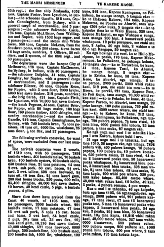 THE MAORI MESSENGER 7 TE KARERE MAORI. 65th regt.; the fine ship Zealandia, 1032 tons, Captain Foster, from Lyttelton, in bal- last;—the schooner Gazelle, 212 tons, Cap- tain Cunninghame, from Sydney, with a general cargo of merchandise, and 3 pas- sengers; the schooner Salcombe Castle, 124 tons, Captain McAllister, from Welling- ton and Napier, with 1502 bags sugar. and 5 passengers;—and the steam ship White Swan, 350 tons, Captain McLean, from the Southern ports, with 200 sheep, 4 cwt bacon 12 bags seeds, sundries, 2 Officers,. 50 sol- diers, and 3 women, of the 65th regt., and 39 passengers. The departures were the barque City of Melbourne, 176 tons, Captain McClemens, for, Sydney, in ballast, with 46 passengers; —the schooner Dolphin, 41 tons, Captain Doughty, for Napier, with a general cargo of merchandise, and 2 passengers;—the schooner Eliezer, 56 tons, Captain Kean, for Napier, with 5 tons flour, 2000 bricks, 5000 feet sawn timber, 512 posts, sundries; —the brig Sarah, 121 tons, Captain Firth, for Lyttelton, with 70, 000 feel sawn timber; —the ketch Pegasus, 45 tons, Captain Drier, for Napier, with 28 bags maize, 180 bogs flour, 769 pieces timber, 4500 shingles, and sundry merchandise;—and the schooner Gazelle, 212 tons, Captain Cunninghame, for Sydney, with 720 bushels bran, 7½ tons po- tatoes, 18 tuns oil, 1600 Ibs. whalebone, 25 tons flour, ½ ton flax, and 27 passengers. The following arrivals coastwise, for want of space, were excluded from our last num- ber. The arrivals coastwise were 5 vessels. of 1310 tons, with 56 passengers, 7892 bushels wheat, 400 bushels maize, 70 bushels bran, 100 bushels oysters, 10 bushels shells, 650 bushels lime, 21 tons potatoes, 14 tons 2 cwt. salt pork, 50 cwt. bacon, 9½ cwt. lard, 3 cwt. tallow, 598 tons firewood, 9¼ tuns oil, 18 tons flax, 2½ tons kauri gum, 200 feet house blocks, 350 posts, 600 rails, 85, 400 shingles, 48, 000 feet sawn timber, 10 horses, 49 bead cattle, 5 pigs, 4 bushels lemons. 4 piles. Since then there have arrived from the Coast 46 vessels, of 1103 tons, with 64 passengers, 2606 bushels wheat, 991 bushels maize, 17 tons potatoes, 17 tons 1 5 cwt salt pork, 3 tons 13 cwt. bacon and hams, 5 cwt lard, 54 head cattle, 2 pigs, 26 ½ tuns oil, 35 cwt flax, 10½ tons kauri gum, 18, 216 feet sawn timber, 49, 000 shingles, 527 tons firewood, 6000 palings, 300 bushels lime, 300 bushels sand, 200 bundles fish, iOOO lbs, whalebone, 100 kune, 212 tana, Kapene Kaningama, no Poi- hakena, he utanga taonga, 3 tangata eke: — ko te Hakoma Kahera, 124 tana, Kapene Makareta, no Poneke no Ahuriri, tona uta- nga 1302 peke huka, 3 tangata eke: ko te kaipuke tima ko te Waiti Huana, 350 tana, Kapene Makarini, no nga Wahapu o runga, tana utanga 200 hipi, 4 hanaraweti poaka whakapaoa. 12 peke purapura, me etahi atu mea, 2 Apiha, 50 nga hoia, 2 wahine o te 65 o nga Rangapu, 39 tangata eke. I Ko nga hokinga atu ene!, ko te Hiti o Me- ripone, he paaka, 176 tana, Kapene Make- remana, ko Poihakena, he pehanga kohatu, 16 tangata eke:—ko te Torowhini, he kune, 41 tana, Kapene Toati, ko Ahuriri, ho utanga taonga, 2 tangata eke:— ko te Erieha, he kune, 56 tana, Kapene Kene, ko Ahuriri, nga utanga, 5 ta- na paraoa, 2000 periki, 5000 whiti rakau kani, 312 pou, me etahi atu mea: ko te Heera, be pereki, 121 tana, Kapene Pata. ko Poti Kupa, tana nuinga. 70, 000 whiti ra- kau kani:—ko te Pekaha, he kune, 45 tana, Kapene Paraea, ko Ahuriri, tana utanga, 38 peke kaanga, 180 peke paraoa, 769 pihi ra- kau kani, 4500 toetoe whare, me etahi tao- nga:—ko te Kahere, he kune, 212 taua, Kapene Kaningama, ko Poihakena, nga uta- nga, 720 puhera papapa, 7½ tana riwai, 18 tana hinu, 1600 pauna hihi tohora, 25 tana paraoa, ½ tana muka, 27 tangata eke. Ko nga unga mai enei i te tahatika i ka- pea i tera Karere, kahore hoki i uru. 51 nga unga mai i te tahatika, hui nga tana 1310, 56 tangata eke, nga utanga, 7893 puhera witi, 400 puhera kaanga. 70 puhera papapa, 100 puhera tio, 10 puhera kotako- ta, 650 puhera raima, 21 tana riwai, 14 ta- na 2 hanaraweti poaka tote, 50 hanaraweti poaka whakapaoa, 9½ hanaraweti hinu poa- ka-, 3 hanaraweti hinu totoka, 598 tana wa- hie, 9¼ tana hinu tohora, i 8 tana muka, 2½ tana kapia, 200 whiti pou whare, 350 pou, 600 kaho taiepa, 85, 400 toetoe whare, 48, 000 whiti rakau kani, 10 hoiho, 49 kau, 5 poaka, 4 puhera remana. 4 pou waapu. Kua u mai i te tahatika, 46 nga kaipuke, huia nga tana 1103, 64 nga tangata eke, nga utanga, 2606 puhera witi, 291 puhera kaa- nga, 17 tana riwai, 7 tana 15 hanaraweti poaka tote, 3 tana 13 hanaraweti poaka wha - kapaoa, 5 hanaraweti hinu poaka, 54 nga kau, 2 poaka, 26½ tana hinu, 55 hanaraweti muka, 10½ tana kapia, 18, 216 whiti rakau kani, 49, 000 toetoe whare, 527 tana wahie, 6000 tiwatawata, 300 puhera raima, 300 puhera onepu, 200 paihere ika, 1000 pauna hihi tohora, 100 pou whare, 2 tana peha rakau, 123 tana kohata kapa.