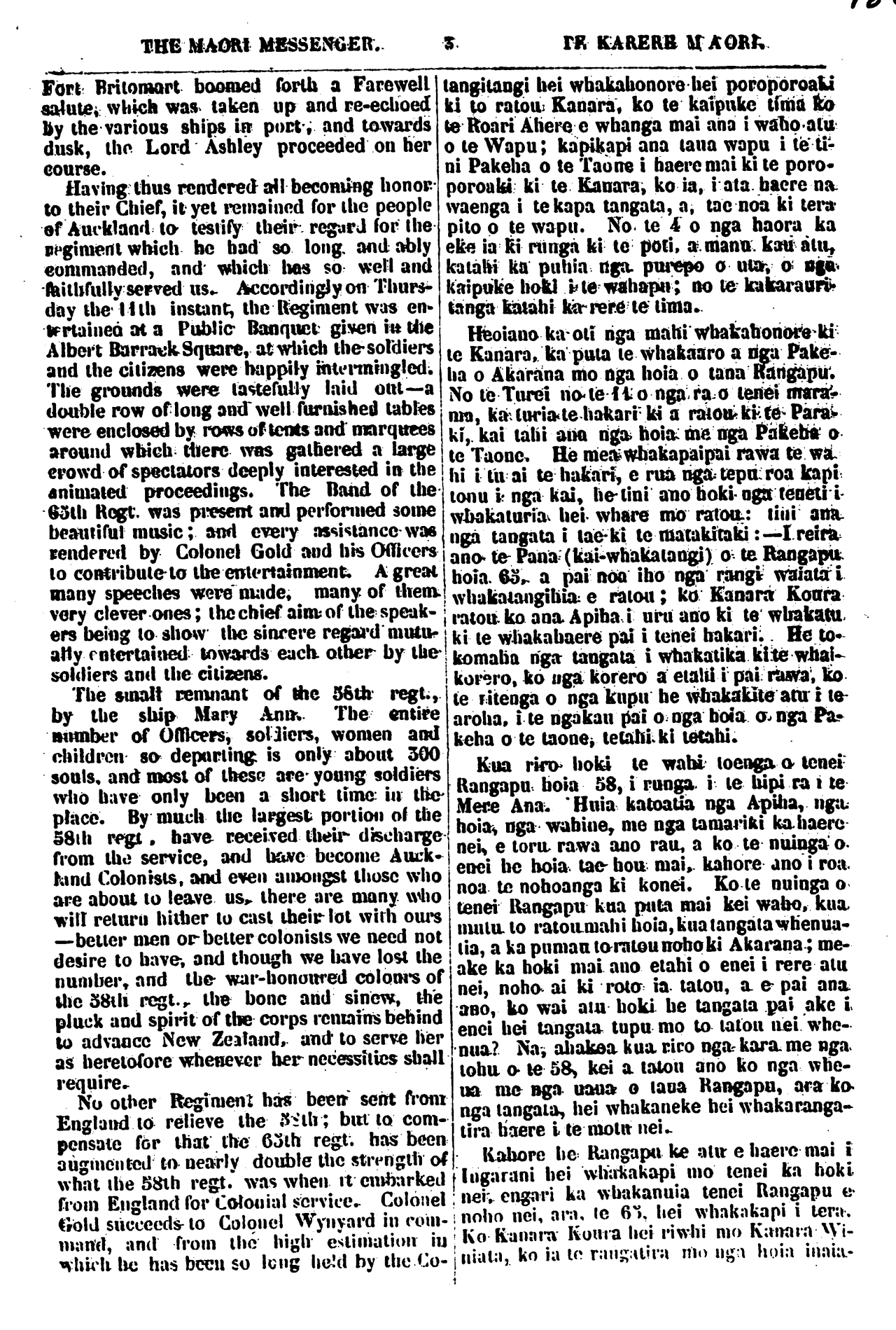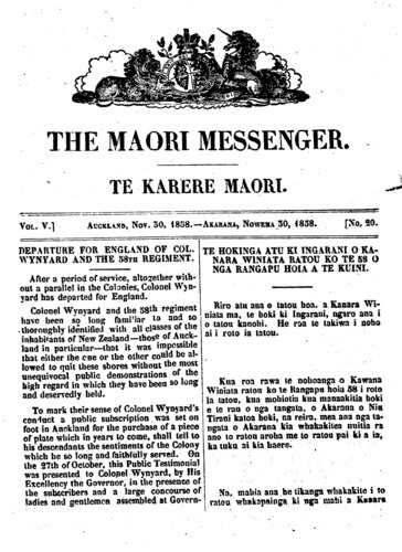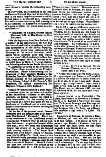 THE MAORI MESSENGER. TE KARERE MAORI. VOL. V.] AUCKLAND, Nov. 30, 1858.—AKARANA, NOWEMA 30, 1858. DEPARTURE FOR ENGLAND OF COL. WYNYARD AND THE 58TH REGIMENT. After a period of service, altogether with- out a parallel in the Colonies, Colonel Wyn- yard has departed for England. Colonel Wynyard and the 58th regiment have been so long familiar to and so thoroughly identified with all classes of the inhabitants of New Zealand—those of Auck- land in particular—that it was impossible that either the one or the other could be al- lowed to quit these shores without the most unequivocal public demonstrations of the high regard in which they have been so long and deservedly held. To mark their sense of Colonel Wynyard's conduct a public subscription was set on foot in Auckland for the purchase of a piece of plate which in years to come, shall tell to his descendants the sentiments of the Colony which be so long and faithfully served. On the 27th of October, this Public Testimonial was presented to Colonel Wynyard, by His Excellency the Governor, in the presence of the subccribers and a large concourse of ladies and gentlemen assembled at Govern- TE HOKINGA ATU KI INGARANI O KA- NARA WINIATA RATOU KO TE 58 O NGA RANGAPU HOIA A TE KUINI. Riro atu ana o tatou boa, a Kanara Wi- niata ma, te hoki ki Ingarani, ngaro ana i o tatou kanohi. He roa te takiwa i noho ai i roto ia tatou. Kua roa rawa te nohoanga o Kawana Winiata ratou ko te Rangapu hoia 58 i roto ia tatou, kua mohiotia kua manaakitia hoki e te rau o nga tangata, o Akarana o Niu Tirani katoa hoki, na reira, mea ana nga ta- ngata o Akarana kia whakakitea nuitia ra ano to ratou aroha me to ratou pai ki a ia, ka tuku ai kia haere. Na, mahia ana he tikanga whakakite i to ratou whakapainga ki nga mahi a Kanara