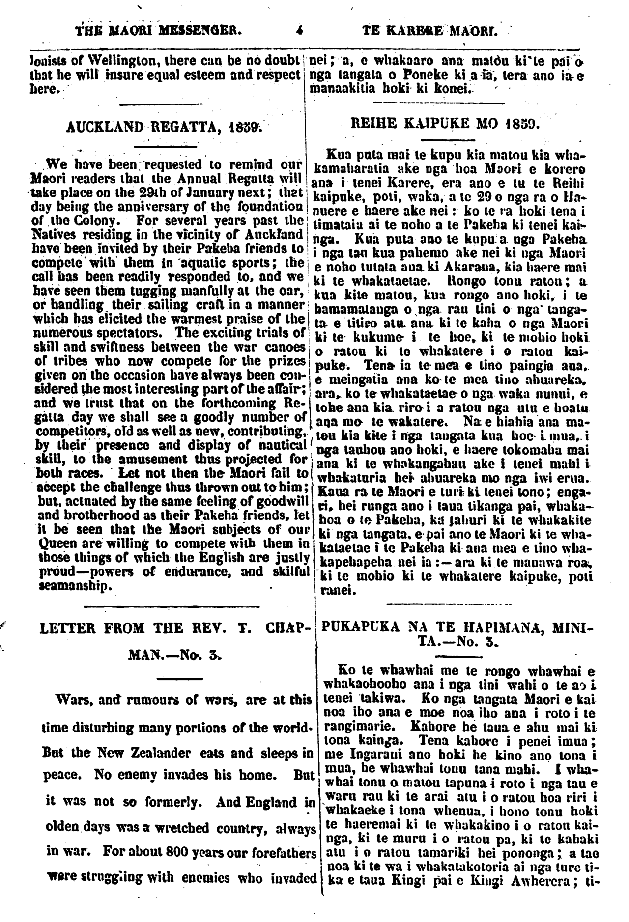 THE MAORI MESSENGER. TE KARERE MAORI loinsts of Wellington, there can be ho doubt that he will insure equal esteem and respect here. AUCKLAND REGATTA, 1859. We have been requested to remind our Maori readers that the Annual Regatta will take place on the 29th of January next; that day being the anniversary of the foundation of the Colony. For several years past the Natives residing. in the vicinity of Auckland have been invited by their Pakeha friends to compete with them in aquatic sports; the call has been readily responded to, and we have seen them tugging manfully at the oar, or handling their sailing craft in a manner which has elicited the warmest praise of the numerous spectators. The exciting trials of skill and swiftness between the war canoes of tribes who now compete for the prizes given on the occasion have always been con- sidered the most interesting part of the affair; and we trust that on the forthcoming Re- gatta day we shall see a goodly number of competitors, old as well as new, contributing, by their presence and display of nautical skill, to the amusement thus projected for both races. Let not then the Maori fail to accept the challenge thus thrown out to him; but, actuated by the same feeling of goodwill and brotherhood as their Pakeha friends, let it be seen that the Maori subjects of our Queen are willing to compete with them in those things of which the English are justly proud—powers of endurance, and skilful seamanship. LETTER FROM THE REV. T. CHAP- MAN.—No. 3. Wars, and rumours of wars, are at this time disturbing many portions of the world But the New Zealander eats and sleeps in peace. No enemy invades his home. But it was not so formerly. And England in • olden days was a wretched counrtry, always in war. For about 800 years our forefathers were struggling with enemies who invaded nei; a, e whakaaro ana matou ki te pai o nga tangata o Poneke ki a ia, tera ano ia e manaakitia hoki ki konei. REIHE KAIPUKE MO 1859. Kua puta mai te kupu kia matou kia wha- kamaharatia ake nga hoa Maori e korero an» i tenei Karere, era ano e tu te Reihi kaipuke, poti, waka, a te 29 o nga ra o Ha- nuere e haere ake nei: ko te ra hoki tena i timataia ai te noho a te Pakeha ki tenei kai- nga. Kua puta ano te kupu a nga Pakeha. i nga tau kua pahemo ake nei ki nga Maori e noho tutata aua ki Akarana, kia haere mai ki te whakataetae. Rongo tonu ratou; a kua kite matou, kua rongo ano hoki, i te hamamatanga o nga rau tini o nga tanga- ta e titiro atu ana ki te kaha o nga Maori ki te kukume i te hoe, ki te mohio hoki o ratou ki te whakatere i o ratou kai- puke. Tena ia te mea e tino paingia ana, e meingatia ama ko te mea tino ahuareka, ara, ko te whakataetae o nga waka nunui, e tohe ana kia rira i a ratou nga utu e hoatu ana mo te wakatere. Na e hiahia ana ma- tou kia kite i nga tangata kua hoe i mua,. i nga tauhou ano hoki, e haere tokomaha mai ana ki te whakangahau ake i tenei mahi I whakaturia hei ahuareka mo nga iwi erua. Kaua ra te Maori e turi ki tenei tono; enga- ri, hei runga ano i taua tikanga pai, whaka- hoa o te Pakeha, ka tahuri ki te whakakite ki nga tangata, e pai ano te Maori ki te wha kataetae i te Pakeha ki ana mea e tino wha- kapehapeha nei ia:—ara ki te manawa roa, ki te mohio ki te whakatere kaipuke, poti ranei. PUKAPUKA NA TE HAPIMANA, MINI- TA. No. 3. Ko te whawhai me te rongo whawhai e whakaohooho ana i nga tini wahi o te ao i tenei takiwa. Ko nga tangata Maori e kai noa the ana e moe noa the ana i roto i te rangimarie. Kahore he taua e ahu mai ki tona kainga. Tena kahore i penei imua; me Ingarani ano hoki he kino ano tona i mua, he whawhai tonu tana mahi. I wha- whai tonu o matou tupuna i roto i nga tau e waru rau ki te arai atu i o ratou boa riri i whakaeke i tona whenua, i hono tonu hoki te haeremai ki te whakakino i o ratou kai- nga, ki te muru i o ratou pa, ki te kahaki atu i o ratou tamariki hei pononga; a tae noa ki te wa i whakatakotoria ai nga ture ti- ka e taua Kingi pai e Kingi Awherera; ti-