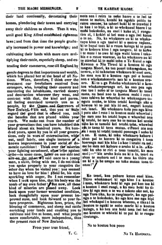 THE MAORI MESSENGER. THE KARERE MAORI. their land continually, devastating their homes, plundering their towns and carrying away their children as slaves. Thus it was, until good King Alfred established righteous laws; and from that time the people gradu- ally increased in power and knowledge; and cultivating their lands with more care mul- tiplying their cattle, especially sheep, and ex- tending their commerce, rose till England, by gentle degrees to that importance and wealth, which has placed her at the bead of all Na- tions. When, therefore, I think over the treatment our forefathers received from strangers, who, invading their country and murdering the inhabitants, carried misery and destruction wherever they went, and contrast with that, the kind and paren- tal feeling exercised towards you as a people, by the Queen and Governors of New Zealand, I am sad, that you so little regard the good that is offered you, and the benefits that are placed within your reach. We make out from the number of your generations that you have inhabited this island about six hundred years. Six hun- dred years, spent by you in all your genera- tions, only in wars of extermination, with out, until lately, one single instance of a known improvement in your social or do- mestic condition! Think over the miseries your fighting occasioned, often tribe against tribe—in some cases, father on one side and son on the other. I said once to a young man, a slave, living with me, I do not think yon spoke properly to your rangatira the other day when be visited you; you seemed to have no love for him! Said he, his eyes sparkling with anger, Do I not remember when I look upon him, that his body was the tomb of my own father! But how, all these kind of miseries are passed away. Look back upon your former wretched condition, look thoughtfully upon your present im- proved state, and look forward to your fu- ture prospects. Righteous laws. peace, the blessing of commerce, and sheep and cattle enriching your lands and enabling yon to cultivate and live at home, and what people more comfortable, more independent, than the present race of New Zealand. From your true friend, T. C. mata aua i reira te neke haere o te iwi te mana te mohio, katahi ka ngakia paitia to ratou oneone, ka tahuri hoki ki te atawhai i te kau i te hipi, a ki te whakanui haere i te mahi hokohoko, ria enei i kake ai, i ranga- tira ai, i kokiri ai hei nuia o nga iwi katoa o te ao. Na, ka whakaaro au ki te whaka- tupu kino a nga tauiwi ki o matou tupuna, ki te hapai taua ki o ratou. kainga ki te patu ki te kohuru kino i nga tangata, ki te kawe i te mate i te awe ki nga wahi katoa i taka- hia e o ramu waewae, na ka whakaaro au ki te atawhai ki te mahi tohu o Te Kuini o nga Kawana o Niu Tirani ki a koutou ki nga tangata. Maori, ka tua pouri taku ngakau, no te mea, e iti to koutou whakaaro ki enei mea, he mea noa ki a koutou nga pai e homai ana e whakatakotoria ana ki o koutou aro- aro. Ki ta unga Pakeha whakaaro ki o kou- tou whakatupuranga uri, ka ono pea nga rau tau i noho ai te tangata Maori ki tenei motu, na heoi ano ta kumou mahi i roto i taua takiwa he whawhai he whakangaro ta- ngata anake, te kitea tetahi koninga ake o komou ki te pai kia iti nei, engari kotahi nei, ianei. Me whakaaro koia pea nga kino i puta ake i roto i to koutou mahi whawhai; he mea ano ka tetahi hapu e whawhai ana ki tetahi, he mea ano ko te matua kei tetahi taha ka te tamaiti kei tetahi taha, whawhai atu te tama ki tona matua. Penei atu ana au i mua ki tetahi tamaiti pononga i noho ki a au. E tama, ki taku whakaaro kahore i ahua pai to korero ki to rangatira i toua haerenga mai kia kite ia koe i tetahi ranei; me he mea nei kahore o aroha ki a ia. Ka- tahi ka oho te riri o taua tamaiti, ka mea mai;—" kia aroha koia au ki a ia, tenei ra ahau te mahara nei i te mea ka titiro atu au ki a ia be urupa no toku matua tona tinana!" Ko tenei, kua pahure katoa enei kino. Titiro whakamuri ki nga kino i a koutou i mua, whakaaro hoki ki nga pai kua tau ki a koutou i enei rangi, a ka mea hoki ka ti- tiro ki nga mea o te wa e takoto ake nei, ko nga Ture tika, ko te rangimarie, ko nga pai- nga o te hokohoko, ko nga kau me nga hipi hei whakapai i o koutou whenua, e tika a i ia koutou te ngaki te noho marie ki o koutou kainga, a ko hea atu hoki tena iwi hei rite mo koutou te whiwhi ki te pai ki te ranga- tiratanga. Na to koutou hoa pono Na TE HAPIMANA. T.C.
