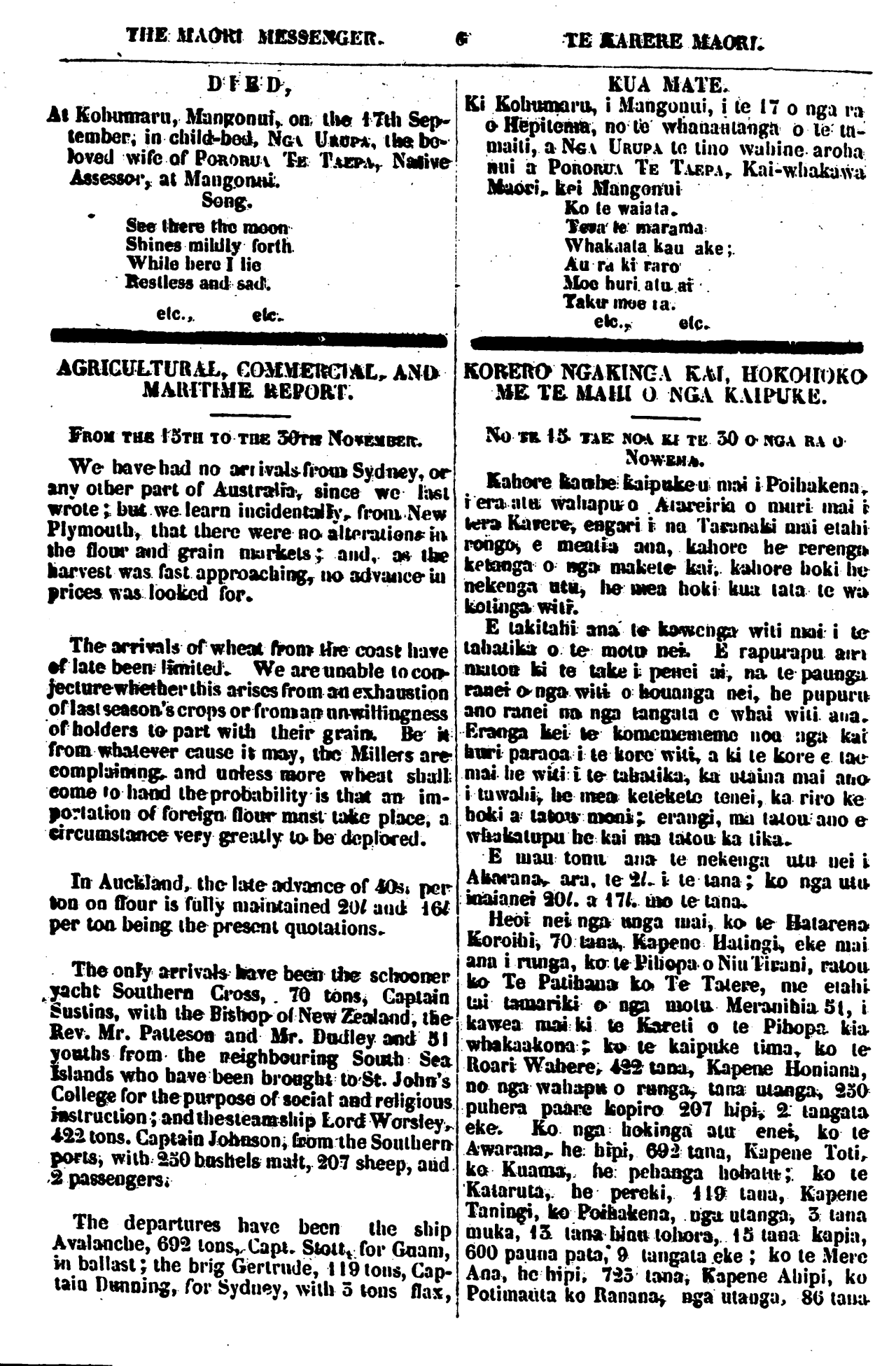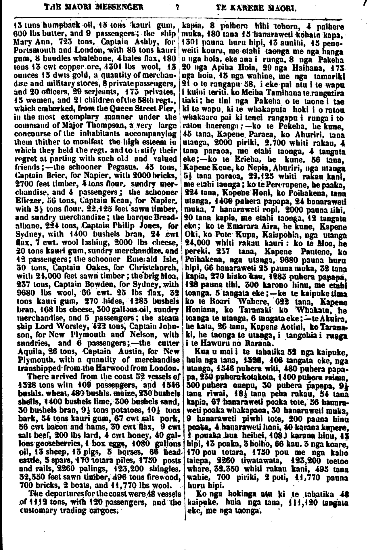 THE MAORI MESSENGER TE KARERE MAORI. 13 tuns humpback oil, 15 tons kauri gum, 600 Ibs butter, and 9 passengers; the ship Mary Ann, 723 tons, Captain Ashby, for Portsmouth and London, with 86 tons kauri gum, 8 bundles whalebone. 4 bales flax, 180 tons 15 cwt copper ore, 1301 Ibs wool, 13 ounces 15 cwts gold, a quantity of merchan- dise and miIitary stores, 8 private passengers, and 20 officers, 20 serjeants, 173 privates, 15 women, and 21 children of the 58th regt. which embarked, from the Queen Street Pier, in the most exemplary manner under the command of Major Thompson, a very large concourse of the inhabitants accompanying them thither to manifest the high esteem in which they held the regt. and to testify their regret at parting with such old and valued friends;—the schooner Pegasus, 45 tons, Captain Brier, for Napier, with 2000 bricks, 2700 feet timber, 4 tons flour, sundry mer- chandise. and 4 passengers.; the schooner Eliezer, 56 tons, Captain Kean, for Napier, with 5½ tons flour. 22, 125 feet sawn timber and sundry merchandize; the barque Bread- albane. 224 tons, Captain Philip Jones, for Sydney, with 1400 bushels bran, 24 cwt flax, 7 cwt. wool lashing, 2000 Ibs cheese, 20 tons kauri gum, sundry merchandize, and 12 passengers; the schooner Emerald Isle, 30 tons, Captain Oakes, for Christchurch, with 24, 000 feet sawn timber; the brig Moa, 237 tons, Captain Bowden, for Sydney, with 9680 Ibs wool, 66 cwt. 25 Ibs flax, 52 tons kauri gum, 270 hides, 1283 bushels bran, 168 Ibs cheese, 300 gallons oil,, sundry merchandise, and 5 passengers; the steam ship Lord Worsley, 422 tons, Captain John- son, for New Plymouth and Nelson, with sundries. and 6 passengers;—the cutter Aquila, 26 tons, Captain Austin, for New Plymouth, with a quantity of merchandise transhipped from the Hardwood from London. There arrived from the coast 52 vessels of 1528 tons with 109 passengers, and 1546 bushels. wheat, 489 bushels. maize, 250 bushels shells, 4400 bushels lime, 500 bushels sand, 30 bushels bran, 9½ tons potatoes, 10½ tons bark, 54 tons kauri gum, 67 cwt salt pork, 56 cwt bacon and hams, 30 cwt flax, 9 cwt salt beef, 200 Ibs lard, 4 cwt honey, 40 gal- lons gooseberries, 1 box eggs, 1080 gallons oil, 13 sheep. 13 pies, 5 horses, 66 head cattle, 3 spars, 170 totara piles. 1750 posts and rails, 2260 palings, 125, 200 shingles, 32, 350 feet sawn timber, 496 tons firewood, 700 bricks, 2 boats, and 11, 770 Ibs wool. The departures for the coast were 48 vessels of 1112 tons, with 120 passengers, and the customary trading cargoes. kapia, 8 paihere hihi tohora, 4 paihere muka, 180 tana 15 hanaraweti kohatu kapa, 1301 pauna huru hipi, 15 aunihi, 15 pene- weiti koura, me etahi taonga me nga hanga a nga hoia, eke ana i runga, 8 nga Pakeha 20 nga Apiha Hoia, 29 nga Haihana, 175 nga hoia, IS nga wahine, me nga tamariki 21 o te rangapu 58, i eke pai atu i te wapu i kuini teriti, ko Meiha Tamihana te rangatira tiaki; he tini nga Pakeha o te taone i tae ki te wapu, ki te whakaputa hoki i o ratou whakaaro pai ki tenei rangapu i runga i to ratou haerenga; ko te Pekeha, he kune, 45 tana, Kapene Paraea, ko Ahuriri, tana utanga, 2000 piriki. 2, 700 whiti rakau, 4 tana paraoa, me etahi taonga, 4 tangata eke; ko te Erieha, he kane, 56 tana, Kapene Kene, ko Nepia, Ahuriri, nga utanga 5½ tana paraoa, 22, 125 whiti rakau kani, me etahi taonga; ko te Pererapene, he paaka, 224 tana, Kapene Honi, ko Poihakena, tana utanga, 1400 puhera papapa, 24 hanaraweti muka, 7 hanaraweti ropi, 2000 pauna tihi. 20 tana kapia, me etahi taonga, 12 tangata eke; ko te Emarara Aira, he kune, Kapene Oki, ko Pote Kupa, Kaiapohia, nga utanga 24, 000 whiti rakau kauri: ko te Moa, he pereki, 237 tana, Kapene Pautene, ko Poihakena, nga utanga, 9680 pauna hura hipi, 66 hanaraweti 25 pauna muka, 52 tana kapia, 270 hiako kau, 1285 puhera papapa, 128 pauna tihi, 500 karono hinu, me etahi toanga, 5 tangata eke;—ke te kaipuke Uma ko te Roari Wahere, 622 tana, Kapene Honiana, ko Taranaki ko Whakatu, he toanga te utanga, 6 tangata eke; te A kuira, he kata, 36 Iana, Kapene Aotini, ko Tarana ki, he taonga te utanga, i tangohia i runga i te Hawuru no Rarana. Kua u mai i te tahatika 52 nga kaipuke, huia nga tana, 1328, 106 tangata eke, nga utanga, 4546 puhera witi, 480 puhera papa- pa, 250 puhera kotakota, 100 puhera raima 300 puhera onepu, 50 puhera papapa, 9½ tana riwai, 18½ tana peha rakau, 54 tana kapia, 67 hanaraweti poaka tote, 56 hanara- weti poaka whakapaoa, 50 hanaraweti muka, 9 hanaraweti piwhi tote, 200 pauna hinu poaka, 4 hanaraweti honi, 40 karana kupere, 1 pouaka hua heihei, 1080 karana hinu, 15 hipi, 13 poaka, 3 hoiho, 66 kau, 5 nga koare, i 70 pou totara, 1730 pou me nga kaho taiepa, 3260 tiwatawata, 193, 200 toetoe whare, 32, 550 whiti rakau kani, 495 tana wahie, 700 piriki, 2 poti, 11, 770 pauna huru hipi. Ko nga hokinga atu ki te tahatika 48 kaipuke, huia nga tana, 111, 120 tangata eke, me nga taonga. «