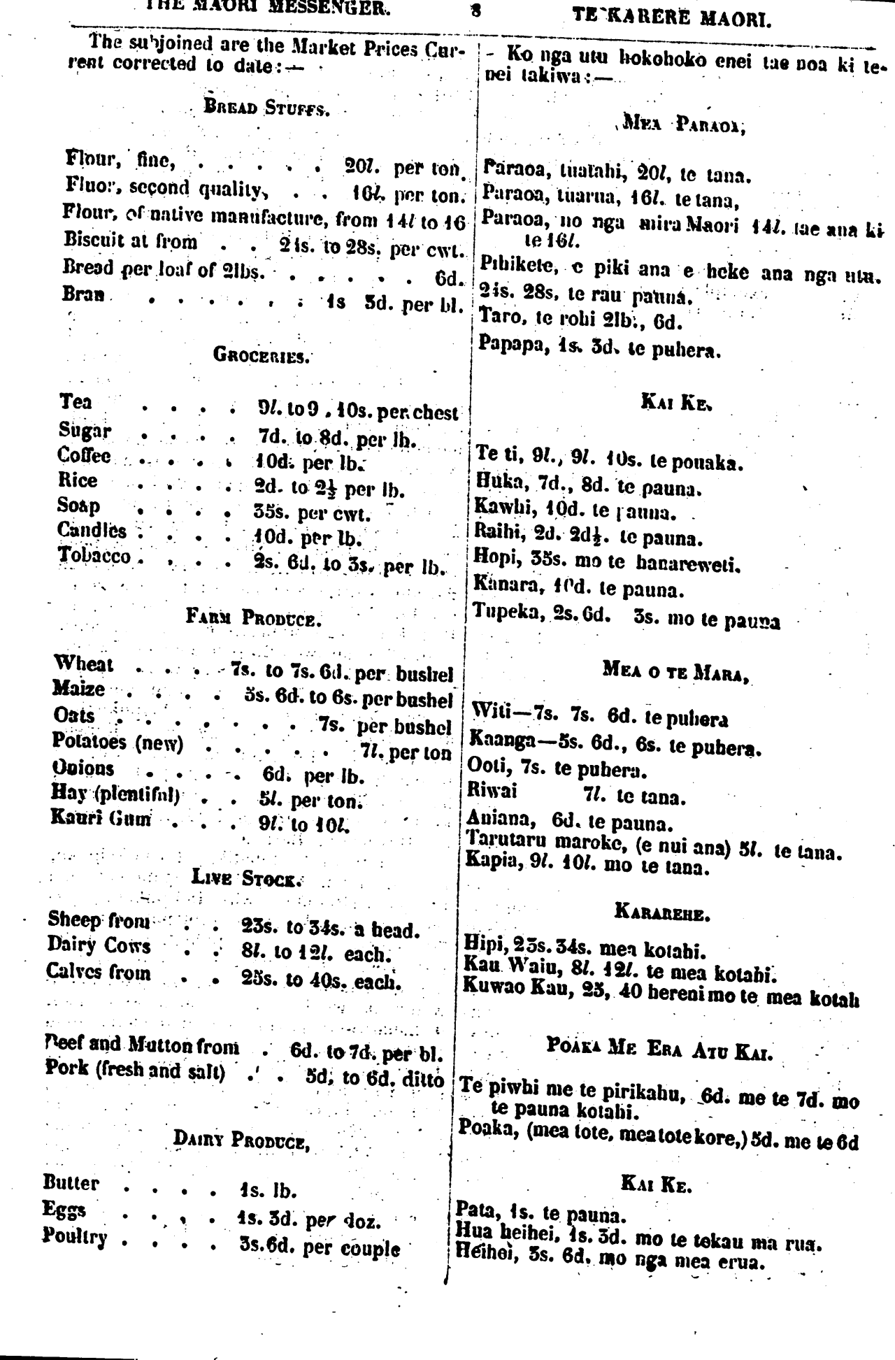 i na MAUHI MESSENGER. TE'KA UERE MAORI. ^7he subjoined are the Market Prices Car- reflt corrected io dale:-*- ' . BREAD STUW». Finnr. fine, ..... SO?. per ion. Fluo;'» second quality., . . IO^ per ton. F?oilr, of native manufacture, from 14/ to 16 Biscuit at froro . . 2 is. to 28s. per cwl. --: Bread per loaf of 21bs. . . . * . 6d. Braa • . . . , . Is 5d. per bl. f GROCERIES. Tea .... 9Uo9 .10s. per. chest Sugar • • • • 7d. to 8d. per Ib. Coffee . . . k lOd.pcrlb. Rice . . . . 2d. to 2^ per Ib. So&p • . • • 55s. per cwt. Candles. . • . 10d.p(*rlb. Tobacco . * . • • 2s. 6U. lo 3s- per Ib. ^ ' ' ' . • ' FABM PRODUCE. Wheat ... 7s. to 7s. 6J. per bushel Maize . . . . 5s. 6d. to 6s. per bushel Oats ....... 7s. per bushel Polatoes (new) . • . . . 7L per ion poioas • • . -. 6(1. per Ib. Hay (plenlifnl) , . 5/. per ton. Kaur; Glim . . . Of;lolO^. » ,a* Live STOCK. . Sheep from ; . 23s. to 34s. a bead* Dairy Cows . .: 8f. to 12^ each. Calves froin . • 25s. to 40s. each. •... ^ f^eef and Mutton troni . 6d. (o 7d. per bl. Pork (fresh and saU) .' . 5d; to 6d. ditto DAIRY PnODCCE. Butter • . • . Is. Ib. Eggs • . , . 4s. 3d. per <ioz. PnilllPV - - . ae ft«! r«ar ««rti«wai« - Ko nga utu hokohoko enei ue noa ki te- nei lakiwa^— ^ >teA PAHAOI, Faraoa, tuatahi, 20/. te tana. 1 Puraoa, tuarua, 16/. te tana, Paraoa, no nga niiraM«on \\^l. lae «na LI ie 16/. Pihikete, e piki ana e heke ana nga ui«. i 2 is. 28s, te rau patina. • • i Taro. te robi 21b., 6d. Papapa, ia. 3d. lc puhera. KAI KE^ Te ti. 91., 91. 10s. le pouaka. Huka, 7d.. 8d. te pauna. Kawhi, 10d. te i auiia« Raihi, 2d. 2di. te pauna. Hopi, 35s. mo te uanarcweli, K;mara, fPd. (e pauna. Tupeka, 2s. 6d. 3s. mo te pau!?a MEA o TE MARA» Witi—7s. 7s. 6d. lepuhera Kaangn—5s. 6d., 6s. tepubera. Ooli, 7s. te pubera. Riwai 7/. te tana. Aniana, 6J. te pauna. Tarutaru marokc, (e nui ana) 5L le iana. Kapia, 9/. !Of. mo te iana. HARAHEKE. Hipi, 23s. 34s. mea kotahi. Kau Waiu, 8/. 12/. te mea kotahi. Kuwao Kau, 35, 40 bereoiroo te mea kotau POAKA Me ERA ATU KAI. Te piwbi me te pirikabu, J6d. me te 7d. mo te pauna kotahi. Poaka, (mea tote, mea tote kore,) 5d. me (e6d KAI KE. Pata, Is. te pauna. Hua heihei, is. 3d. mo (e tokau ma rua. Heihei, 5s. 6d. mo nga mea «rua. , .