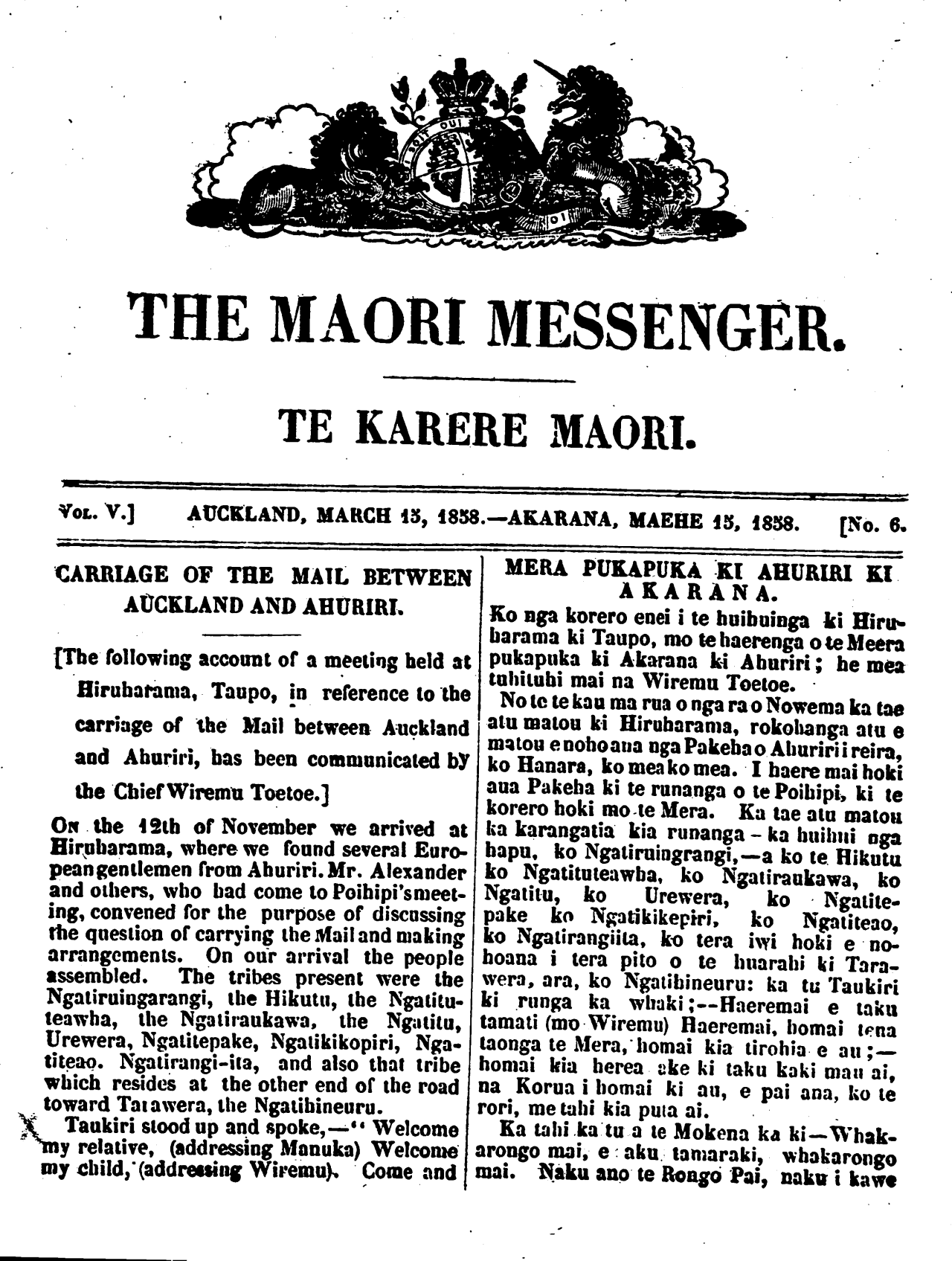 The Maori Messenger - Ko te Karere Maori 1855-1860: Volume 5, Number 6. 13 March 1858 |