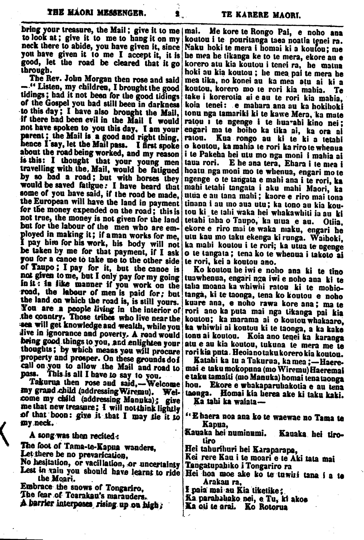 THE MAORI MESSENGER. 2 TE KARERE MAORI. bring your treasure, the Mail; give it to me to look at; give it to me to hang it on my neck there to abide, you have given it, since you have given it to me I accept it, it is good, let the road be cleared that it go through. The Rev. John Morgan then rose and said " Listen, my children. I brought the good tidings; bad it not been for the good tidings of the Gospel you had still been in darkness to this day; I have also brought the Mail, if there had been evil in the Mail I would not have spoken to you this day . I am your parent; the Mail is a good and right thing, hence I say, let the Mail pass. I first spoke about the road being worked, and my reason is this: I thought that your young men travelling with the, Mail would be fatigued by so bad a road; but with horses they would be saved fatigue: I have heard that some of you have said, if the road be made, the European will have the land in payment for the money expended on the road; this is not true, the money is not given for the land but for the labour of the men who are em- ployed in making it; if a man works for me, I pay him for his work, bis body will not be taken by me for that payment, if I ask you for a canoe to take me to the other side of Taupo; I pay for it, but the canoe is not given to me, but I only pay for my going in it: in like manner if you work on the road. the labour of men is paid for; but the land on which the road is, is still yours. You are a people living in the interior of the country. Those tribes who live near the sea will get knowledge and wealth, while you live in ignorance and poverty. A road would being good things to you, and enlighten your thoughts; by which means you will procure property and prosper. On these grounds do I call on you to allow the Mail and road to pass. This is all I have to say to you. Takurua then rose and laid,—Welcome my grand child (addressing Wiremu). Wel- come my child (addressing Manuka); give me that new treasure I will not think lightly of that boon: give it that I may tie it to my neck. A song was then recited The fool of Tama- te- Kapua wanders, Let there be no prevarication, No hesitation, or vacillation, or uncertainty Lest in vain you should have learnt to ride the Maori. Embrace the snows of Tongariro, The fear of Tearakau's marauders. A barrier interposes rising up on high; mai. Me kore te Rongo Pai, e noho ana koutou i te pouritanga taea noatia tenei ra. Naku hoki te mera i homai ki a koutou; me be mea he tikanga ke to te mera, ekore au e korero atu kia koutou i tenei ra, he matua hoki au kia koutou; he mea pai te mera he mea tika, no konei au ka mea atu ai ki a koutou, korero mo te rori kia mahia. Te take i korerotia ai e au te rori kia mahia, koia tenei: e mahara ana au ka hokihoki tonu nga tamariki ki te kawe Mera, ka male ratou i te ngenge i te huarahi kino nei; engari ma te hoiho ka tika ai, ka ora ai ratou. Kua rongo au ki te ki a tetahi o koutou, ka mahia te rori ka riro te whenua i te Pakeha hei utu mo nga moni i mahia ai taua rori. E he ana tera. Ehara i te mea i hoatu nga moni mo te whenua, engari mote ngenge o te tangata e mahi ana i te rori, ka mahi tetahi tangata i aku mahi Maori, ka utua e au tana mahi; kaore e riro mai tona tinana i au mo aua utu; ka tono au kia kou- tou ki te tahi waka hei whakawhiti ia au ki tetahi taha o Taupo, ka utua e au. Otiia, ekore e riro mai te waka maku, engari he utu kau mo taku ekenga ki runga. Waihoki, ka mahi koutou i te rori; ka utua te ngenge o te tangata; tena ko te whenua i takoto ai te rori, kei a koutou ano. Ko koutou be iwi e noho ana ki te tino tuawhenua, engari nga iwi e noho ana ki te taha moana ka whiwhi ratou ki te mohio- tanga, ki te taonga, tena ko koutou e noho kuare ana e noho rawa kore ana: ma te rori ano ka puta mai nga tikanga pai kia koutou; ka marama ai o koutou whakaaro, ka whiwhi ai koutou ki te taonga, a ka kake tonu ai koutou. Koia ano tenei ka karanga atu e au kia koutou, tukuna te mera me te rori kia pata. Heoia no taku korero kia koutou. Katahi ka tu a Takurua. ka mea;—Haere- mai e taku mokopuna (mo Wiremu) Haeremai e taka tamaiti (mo Manuka) homai tena taonga hoa. Ekore e whakaparuhakotia e au tena taonga. Homai kia herea ake ki taka kaki. Ka tahi ka waiata— " E haera noa ana ko te waewae no Tama te Kapua, Kauaka hei numinumi» Kauaka hei tiro- tiro Hei tahurihuri hei Karaparapa, Kei rere Kau i te moari e te Aki tata mai Tangatupahiko i Tongariro ra Hei hoa moe ake ko te tu wiri tana i a te Arakau ra, I puta mai au Kia tiketike; Ka parahako nei, e Tu, ki akoe Ka oti te arai. Ko Rotorua