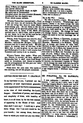 THE MAORI MESSENGER. 5 TE KARERE MAORI. Thou, 0 Mars, art slighted Thy course obstructed. The Rotorua sea shows black as night My spirlt was at Tawatawhiti Occupied about the taru o-tawhiti (Kumara). Awakanohi has the dogskin mat. From which comes warmth. Wiremu Toetoe then rose and said,—Your words are true; let all wordi be like yours I did not bring this boon to cause dissen- sions among you. Do not listen to the un- wise words of the ignorant people who say the land will be taken if. the Mails are carried over it; this is false, and is unwise; do not listen to it; bat let the road be im- proved for the carriage or the Mail . Nikora, from Tarawera near Ahuriri. then rose, - Welcome. Wiremu Toetoe and Manuka; welcome Mr. Morgan; bring your treasure and tie it round my neck. My sole object in coming here at this time, is the Mail, that it may be given to me, that you and Poihipi give it to me; I will receive it at Tarawera and convey it on to Ahuriri. Wiremu Toetoe then spoke: What you say, Nikora, is correct; we have agreed at Rangiaohia that it shall come from Rangi- aohia to Arowhena, and thence to Apotea but the arrangements for this part are with yourself and Poihipi. These were the only men who spoke at this meeting, but all the people consented. LETTER FROM THE REV. T. CHAPMAN. In my last letter to you, I pointed out the possibility of some improvement generally in the appearance of the Native communicants at the time of their attending the Lord's Supper. Cleanliness of person, and tidiness and simplicity of dress, with humility of heart, is at all times by far the best manner of appearing in the House of God. And what shall I next say? I could say a great many things, that I am sure would be for your benefit; but among these, there are those to which you would not pay any atten- Moana he ahuapo, Maku e tawa tawhiti taka wairua, E ware ake ana i te taru o tawhiti Kei a Awakanohi te huruhuru Kuri, Taka mai te ahuru e." Ka tu Ko WIREMU TOETOE. Ka tika to Korero, e koro. Kia pena mai te ritenga o te korero. Whakarongo mai; kaore i homai e au tenei taonga hei take whawhai ma koutou, kei whakarongo koutou ki te korero porangi a te tangata kuare, e mea ana hoki ratou ka riro te whenua i te haerenga o te mera. He ritenga be tenei, be ritenga kuare; kaua e whakarongo atu, engari me mahi te rori hei haerenga ao te mera. Tu ana ko Nikora, o Tarawera. te taha ki Ahuriri—Haeremai, e Wiremu Toetoe me Manuka. Haeremai, e Te Mokena. Kawea mai te taonga pai—herea ki taku kaki. Heoiano te take i haeremai ai au ki konei i tenei takiwa, ko te Mera, kia homai ki a au, kia homai e korua ko te Poihipi ki a au; koia hoki ko te Mera hei Tarawera ka riro mai ki a au, maku e mau atu ki Ahuriri. Whakatika ana a Wiremu Toetoe. Ka tika to korero, e Nikora, me haere mai i Rangiao- whia ki Arowhena—ka haeremai Arowhena ki Apotea—ka haeremai i Apotea ki Taupo ko te ritenga mo tenei wahi kei a korua ko te Poihipi. Heoiano nga tangata i tu ki te korero i tenei runanga, engari ko te whakaae a nga tangata katoa i whakaae tona, i pai katoa. HE PUKAPUKA NA TE HAPIMANA MINITA. I tero pukapuka i tuhituhia e au kia koutou, i mea atu an i reira, tena e ahei ano i nga tangata Maori e haere mai ana ki te Hakarameta Tapu te whakaahua pai i a ratou: ko te tinana kia ma, ko nga kakahu kia ahua pai, me te ngakau mahuki, wha- kaiti, kote ahua tika tenei mo te tangata, ina haere mai ki te whare o te Atua. Me pehea ano tetahi atu korero maku? ka maha ana ra nga mea e takoto nei me he mea e whakapuakina ana, tona tukunga iho he- pai kia koutou; otira, ka turi pea koutou ki etahi o enei, me he mea e korerotia ana e au . Engari ia, me whakaatuatu ano etahi.— Me he mea i karanga nga Iwi Maori kia Te Kawana i era mu kua pahure nei, ara nga iwi e noho ana i te tahatika, i nga awa nui hoki, kia uru ia hei hoa mo ratou hei wehewehe i o ratou whenua, kia peratia me te whenua o Kenana I wehewehea o