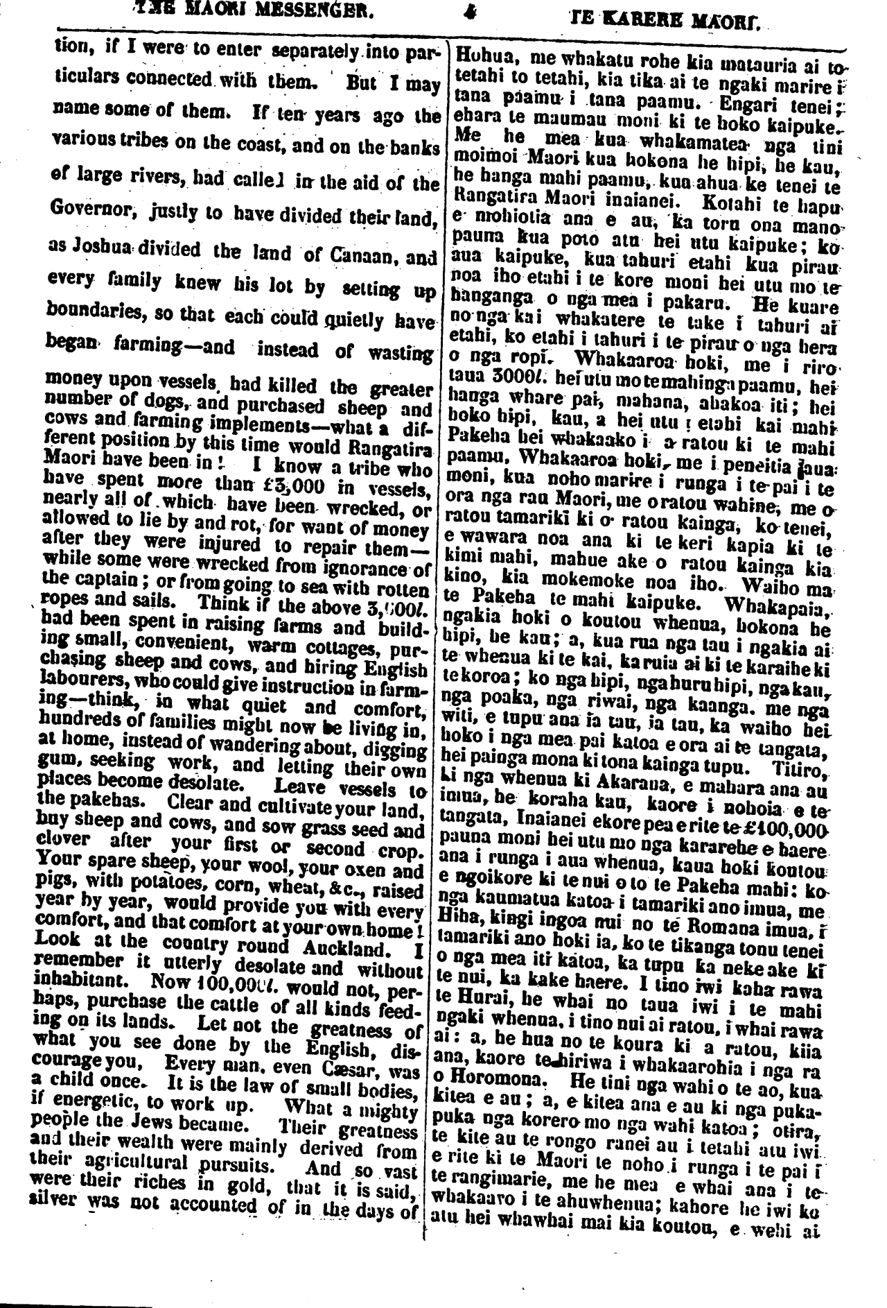 THE MAORI MESSENGER. TE KARERE MAORI. tion, if I were to enter separately into par- ticulars connected with them, But I may Dame some of them. If ten years ago the various tribes on the coast, and on the banks of large rivers, had called in the aid of the Governor, justly to have divided their land, as Joshua divided the land of Canaan, and every family knew his lot by setting up boundaries, so that each could quietly have began farming—and instead of wasting money upon vessels had killed the greater number of dogs. and purchased sheep and cows and farming implements—what a dif- ferent position by this time would Rangatira Maori have been in! I know a tribe who htVA ••^Ai» ~^— -- -• Huhua, me whakatu rohe kia matauna ai to" tetahi to tetahi, kia tika ai te ngaki roarire i tana paamu i tana paamu* Engari tenei; ebara te maumau moni ki te boko kaipuke,- Me he mea kua whakamatea« nga tini moimoi Maori kua hokona he hipi, he kau, he hanga mahi paamu, kua ahua ke tenei te Rangatira Maori inaianei. Kotahi te hapu' e- mohiotia ana e au, ka toru ona mano ona mano \_\_, —\_ •w u vnu UJCSIIU- pauna kua poto atu hei utu kaipuke; ko aua kaipuke, kua taburi etahi kua pirau noa iho etahi i (e kore moni hei utu mo «u ».;-——- have in ; I know a - spent more than £5,000 in ..—•»-• ... vessels, .\_ .-,-.. —w,ww «u vc!iseis, nearly all of. which have been wrecked, or allowed to lie by androt, for want of rnonev «A-- - • •••weu vu uv oy anarot, for want of money afler they were injured to repair them— while some were wrecked from ignorance of the captain; or from going to sea with rollen ropes and sails. Think ir the above 5,';00/. bad been spent in raising farrns and build« iny small, convenient, warrn cottages, pur- cliasing sheep and cows, and hiring English labourers, who could give instruclioa in farm- ing—think, io what quiet and comfort, hundreds of families might now ae living in, at home, instead of wandering about, digging gum, seeking work, and letting ineir own places become desolate. Leave vessels la the pakebas. Clear and cult! vate your land, buy sheep and cows, and sow crass wM «na .-„.. .^w «i,uu« i w &ure moni nei utu mo te^ hanganga o nga mea i pakaru. He koare no nga ka i whakatare te take i tahuri ar etahi, ko etahi i lahuri i ifr pirau- o nga hera o nga ropi. Whakahroa hoki, me i riro' taua 3000^. hei utu mo te mahing-i paamu, hei hanga whare pai, mahana, ahakoa iti; hei boko hipi« kau, a hei utu i etahi kai manr Pakeha hei whakaako i a- raiou ki te mahi paamu, Whakahroa hoki, me i peneitia jaua moni, kua noho marwe i runga i te-pai i te ora nga ran Maori, me oralou wahine, me o- ratou tamarikl ki o* ratou kainga, ko tenei, e wawara noa ana ki te keri kapia ki te kimi mahi, mahue ake o ratou kainga kia kino, kia mokemoke noa iho. Waiho ma ta Dnfc-»».» .- —-^- - - - te Pakeha ngakia . . —.uvr tu«* ina te mahi kaipuke. Whakapaha. hoki o koutou whenua, bokooa be hipi, be kau; a, kua roa nga tau i ngakia ai te whenua ki te kai, karui» ai ki te karaibeki tckoroa; ko nga hipi, ngaburuhjpi, ngakau, nga poaka, nga riwai, nga kaanga. me n«a witi- <» •iirw »»—• ?'- —~ 'a« me nga clover after sow grass seed and ciover alier your first or 'second crop. Your spare sheep, your wool, your oxen and pigs, with potatoes, coro, wheat, &c», raised year by year, would provide you with every comfort, and !bat comfort at your own: home t Look at (be country round Auckland« I remember it utlerfy desolate and wilbout inhabitant. Now !OO,OOK. would not, per- baps, purcbase ihe cattle of all kinds feed- inar ^n tia I»-.-».- r -- , -„- —»^^*», we UffU witi, e tupu ana fa tau, .«a (au, ka waiho hei boko i nga mea pai katoa e ora ai te tangata, hei painga mona ki tona kainga tupu. Tiliro, U nga whenua ki Akaraiia. e mahara ana -*" «-.— •- - - , e mabara ana au - .—«...u—, ^ uiuudru una au ioiua, be koraha kau, kaore i nohoia e te tangata, Inaianei ekorepeaeriieie£100,0(K> pauna moai hei utu mo nga kararebe e baere ana i runga i aua whenua, kaua hoki koutou a ^^,^:i,-— •-• - \_- -^ .——W •UTT W O«UUII L if energelic, to work up. What a im^uiy people ihe Jews became. The!r greatoess and their wealth were mainly derived trorn 1 h«air •»<»..!<»••••••-—• - \_.— . . ^...o« • uuu wnenua. Kaua taoki koutou e ngoikore ki te nui o (o (e Pakeha mahi: ko- nga kaumatua kato»! tamariki aoo imua, me Hiha, kingi ingoa nui no te Komaoa imua, i lamariki ano hoki ia, ko (e tikanga tonu (enei o nga mea itr katoa, ka tupu ku neke ake ki te nui, ka kaike haere. I lino »wS ic»»»-» "—- -—— —•*« a* • I lino iwi kaha rawa \_—...,.. * »»uu iw« Kaosi rawa le Hurai, be whai no taua iwi i te mahi ngaki whenua« i tino nui ai raton. rwhi" ia""- ai raiou. i whai rawa • • —\_ .... • va maui . . .- —. •«-ua iccu- ngaki whenua, i tino nui ai raiou. i whai rawa we oa its lands» Let not tbe greatness of ai; a, be hua DO te koura ki a ratou, kiia whai you see done by the English, dis- ana, kaore teJiiriwa i whakaaiohia i nga ra courageyou, Evcry man. even Cesar, was o Horomooa. He tini oga wahi o te ao, kua a chi!d once» It is !be law of small bodies, kitea e au; a, e kitea ana e nu ki ncro ""l- it energelic, to work UD. What •» ...;-''*-• ana e au ki nga puka- „.. .—-«-•. " r .- ...,..— ...wfJ UCt !If ineir agricullural pursuits. And ,»• •« • ——«^ftft&«k.- *•-—-- \_\_ —\_— —•^•••^tf« J&t< were their ricbes in gold, that A •I •«A«» »-....—- — ,so vast it is said, ...\_\_ ... o».u, biiiii. 11 is said, lilver was not accounted of io ihe days of . , \_ —,a- u«u </ uu KI nga puka- puka nga korera mo nga wahi katoa; otira, te kite au te ronso ranei *»" ? •^•-••s -- • • rongo ranei au ,\_-.-. ~.u •• l,CI-dUl UIU IV e rite ki te Maun te noho i runga i te pai te rangimarie, mohe mea e whai •»».*»-• 