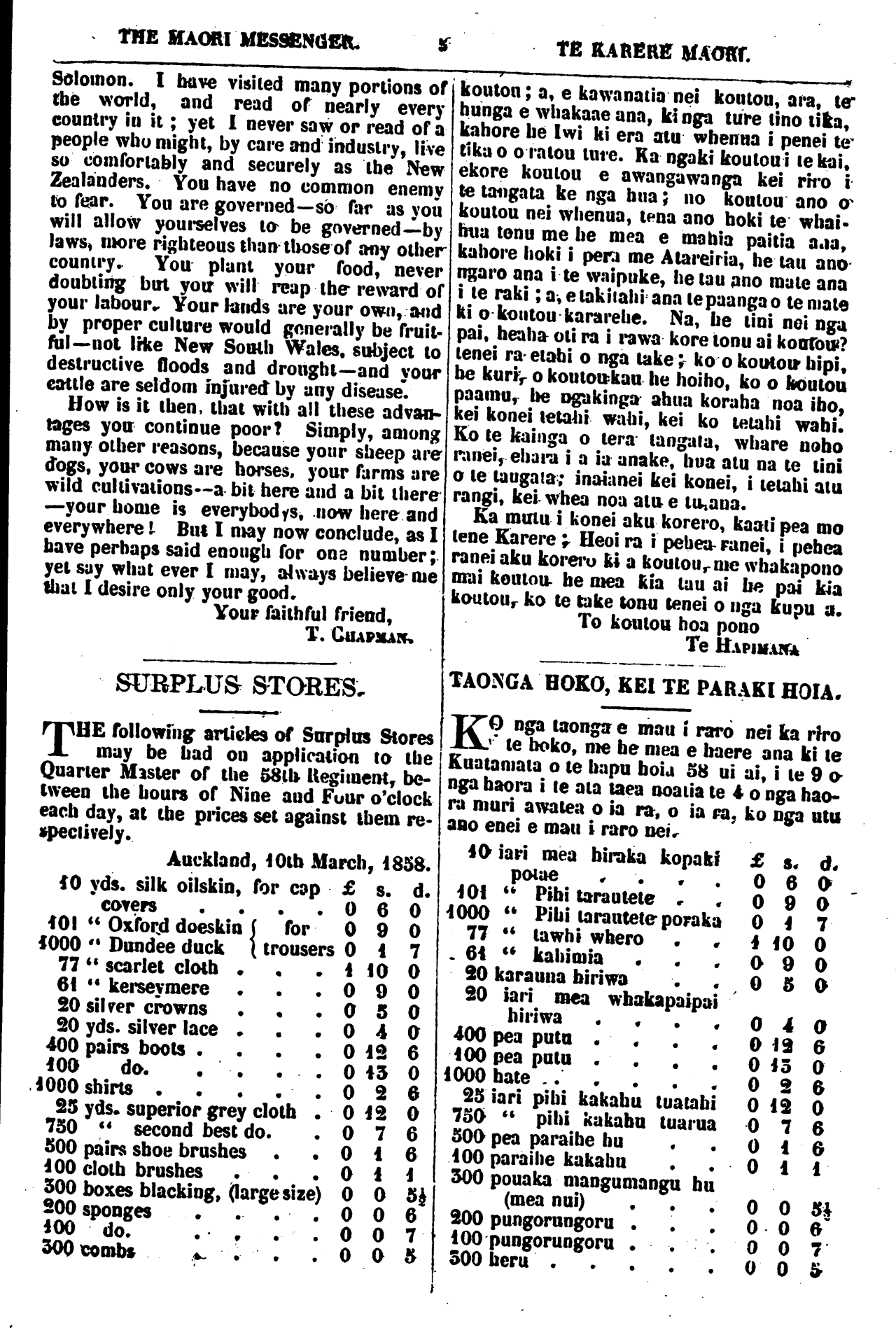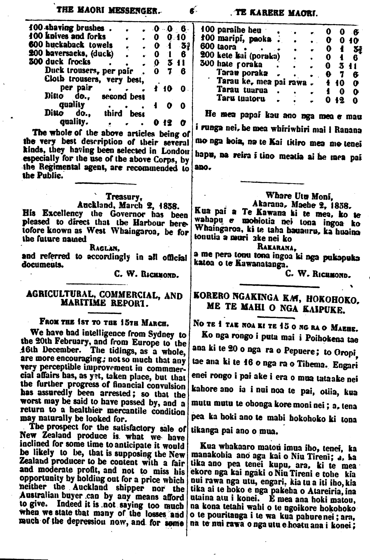 THE MAORI MESSENGER, 6 TE KARERE MAORI. Treasury, Auckland, March 2, 1858. His Excellency the Governor has been pleased to direct that the Harbour here to fore known as West Whaingaroa, be for the future named RAGLAN, and referred to accordingly in all official documents. C. W. RICHMOND. AGRICULTURAL, COMMERCIAL, AND MARITIME REPORT. FROM THE 1ST TO THE 15TH MARCH . We have had intelligence from Sydney to the 20th February, and from Europe to the 16th December. The tidings, as a whole, are more encouraging; not so much that any very perceptible improvement in commer- cial affairs has, as yet, taken place, but that the further progress of financial convulsion has assuredly been arrested; so that the worst may be said to have passed by, and a return to a healthier mercantile condition may naturally be looked for. The prospect for the satisfactory sale of New Zealand produce is- what we have inclined for some time to anticipate it would be likely to be, that is supposing the New Zealand producer to be content with a fair and moderate profit, and not to miss bis opportunity by holding out for a price which neither the Auckland shipper nor the Australian buyer can by any means afford to give. Indeed it is not saying too much when we state that many of the losses and much of the depression now, and fop some Whare Utu Moni, Akarana, Maehe 2, 1858, Kua pai a Te Kawana ki te mea, ko te wahapu e mohiotia nei tona ingoa ko Whaingaroa, ki te taha hauauru, ka huaina tonutia a muri ake nei ko AKARANA, a me pera tonu tona ingoa ki nga pukapuka katoa o te Kawanatanga. C. W, RICHMOND, KORERO NGAKINGA KAI, HOKOHOKO, ME TE MAHI O NGA KAIPUKE. No TE I TAE NOA KI TE 15 O NGA RA O MAEHE. Ko nga rongo i puta mai i Poihakena tae ana ki te 30 o nga ra o Pepuere; to Oropi tae ana ki te 16 o nga ra o Tihema. Engari enei rongo i pai ake i era o mua tata ake nei kahore ano ia i nui noa te pai, otiia, kua mutu mutu te ohonga kore moni nei; a, tena pea ka hoki ano te mahi hokohoko ki tona tikanga pai ano o mua. Kua whakaaro matou imua iho, tenei, ka manakohia and nga kai o Niu Tireni; a, ka tika ano pea tenei kupu, ara, ki te mea ekore nga kai ngaki o Niu Tireni e tohe kia nui rawa nga utu, engari. kia tu a iti iho, kia tika ai te hoko e nga pakeha o Atareiria, ina utaina atu i konei. E mea ana hoki matou, na kona tetahi wahi o te ngoikore hokohoko o te pouritanga i te wa kua pahure nei; ara. na te nui rawa o nga utu e hoatu ana i konei;