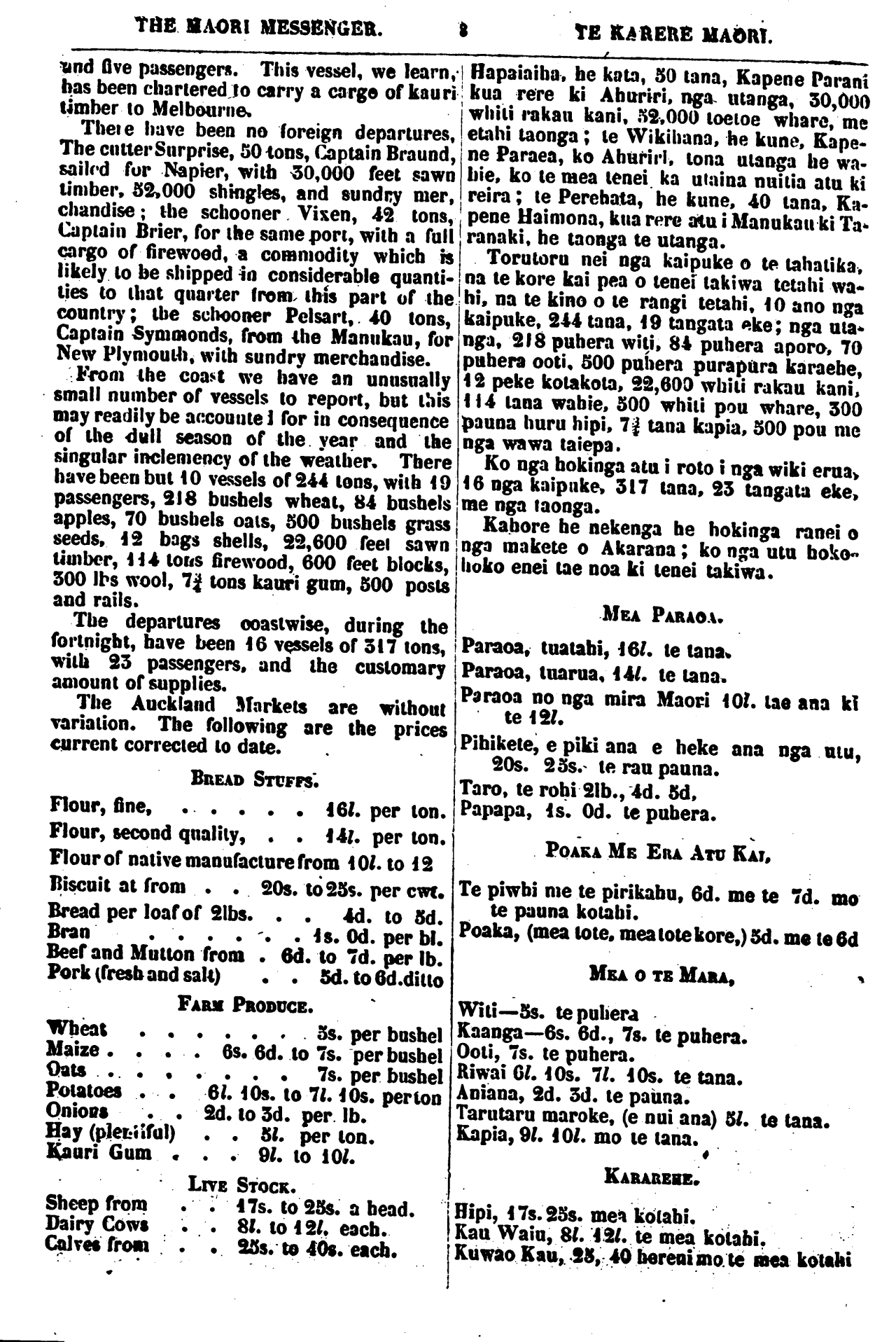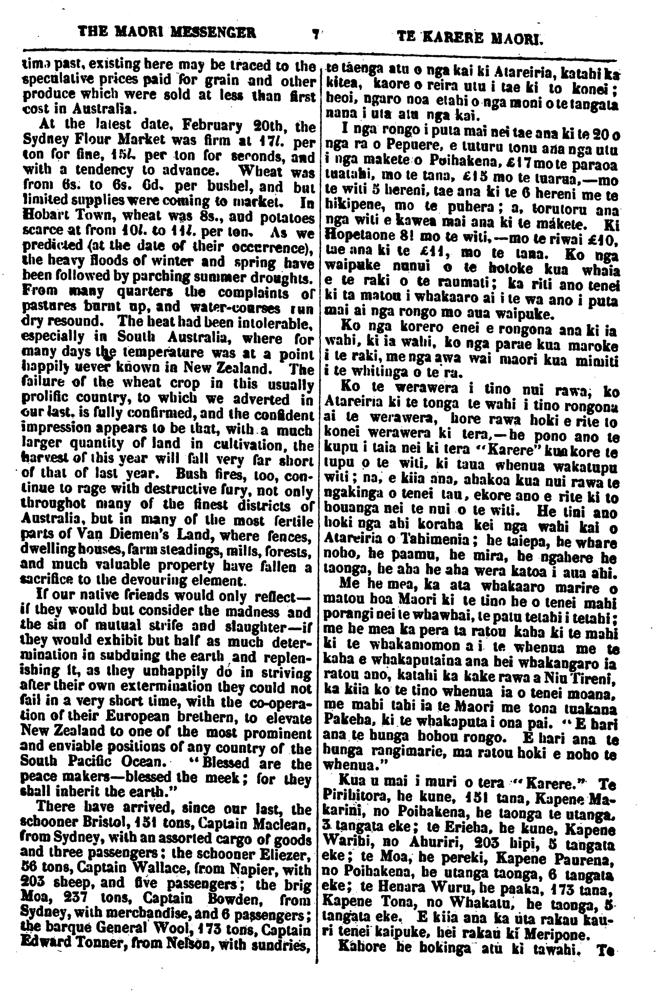 THE MAORI MESSENGER TE KARERE MAORI. time past, existing here may be traced to the speculative prices paid for grain and other produce which were sold at less than first cost in Australia. At the latest date, February 30th, the Sydney Flour Market was firm at 171. per ton for fine, 151 per ton for seconds, and with a tendency to advance. Wheat was from 6s. to 6s. 6d, per bushel, and but limited supplies were coming to market. In Hobart Town, wheat was 8s., and potatoes scarce at from 101. to 111. per ton . As we predicted (at the date of their occurrence), Ihe heavy floods of winter and spring have been followed by parching summer droughts. From many quarters the complaints of pastures burnt up, and water-courses run dry resound. The beat had been intolerable especially in South Australia, where for many days the temperature was at a point happily never known ia New Zealand. The failure of the wheat crop in this usually prolific country, to which we adverted in our last. is fully confirmed, and the confident impression appears to be that, with a much larger quantity of land in cultivation, the harvest of this year will fall very far short of that of last year. Bush fires, too, con- tinue to rage with destructive fury. not only throughout many of the finest districts of Australia, but in many of the most fertile parts of Van Diemen's Land, where fences, dwelling houses, farm stead ings, mills, forests, and much valuable property have fallen a sacrifice to the devouring element. If our native friends would only reflect— if they would but consider the madness and the sin of mutual strife and slaughter—if they would exhibit but half as much deter- mination in subduing the earth and replen- ishing It, as they unhappily do in striving after their own extermination they could not fail in a very short time, with the co-opera- tion of their European brethren. to elevate New Zealand to one of the most prominent and enviable positions of any country of the South Pacific Ocean. "Blessed are the peace makers—blessed the meek; for they shall inherit the earth." There have arrived since our last, the scbooner Bristol, 151 tons, Captain Maclean, from Sydney, with an assorted cargo of goods and three passengers: the schooner Eliezer, 56 tons, Captain Wallace, from Napier, with 905 sheep, and five passengers; the brig Moa, 257 tons, Captain Bowden, from Sydney, with merchandise, and 6 passengers; the barque General Wool, 173 tons, Captain Edward Tonner, from Nelson, with sundries, te taenga atu o nga kai ki Atareiria, katahi ka kitea, kaore o reira utu i tae ki to konei; heoi, ngaro noa etahi o nga noni o te tangata nana i uta atu nga kai. I nga rongo i puta mai nei tae ana ki te SO o nga ra o Pepuere, e tuturu tonu ana nga utu i nga makete o Poihakena, £17 mo te paraoa tuatahi, mo te tana, £15 mo te tuarua,—mo te witi 5 hereni, tae ana ki te O hereni me te hikipene, mo te puhera; a, torutoru ana nga witi e kawea mai ana ki te makete. Ki Hopetaone 81 mo te witi,—mo te riwa i £10. tae ana ki te £11, mo te tana. Ko nga waipuke nunui o te hotoke kua whaia e te raki o te raumati; ka riti ano tenei ki ta matou i whakaaro ai i te wa ano i puta mai ai nga rongo mo aua waipuke. Ko nga korero enei e rongona ana ki ia wahi, ki ia wahi, ko nga parae kua maroke i te raki, rae nga awa wai maori kua mimiti i te whitinga o te ra. Ko te werawera i tino nui rawa, ko Atareina ki te tonga te wahi i tino rongona ai te werawera, hore rawa hoki e rite to konei werawera ki tera,—he pono ano te kupu i taia nei ki tera "Karere" kua kore te tupu o te witi, ki taua whenua wakatupu witi; na, e kiia ana, ahakoa kua nui rawa te ngakinga o tenei tau, ekore ano e rite ki to houanga nei te nui o te witi. He tini ano hoki nga ahi koraha kei nga wahi kai o Atareiria o Tahimenia; be taiepa, he whare noho, he paamu, he mira, he ngahere he taonga, be aha he aha wera katoa i aua ahi. Me he mea, ka ata whakaaro marire o matou hoa Maori ki te tino he o tenei mahi porangi nei te whawhai, te patu tetahi i tetahi; me he mea ka pera ta ratou kaha ki te mahi ki te whakamomona a i te whenua me te kaha e whakaputaina ana hei whakangaro ia ratou ano, katahi ka kake rawa a Niu Tireni. ka kiia ko te tino whenua ia o tenei moana. me mahi tahi ia te Maori me tona tuakana Pakeha, ki te whakaputa i ona pai. " E hari ana te hunga hohou rongo. E hari ana te hanga rangi mane, ma ratou hoki e noho te whenua." Kua u mai i muri o tera " Karere." Te Pirihitora, he kune, 151 tana, Kapene Ma- karini, no Poihakena, he taonga te utanga 3 tangata eke; te Erieha, he kune. Kapene Warihi, no Ahuriri, 203 hipi, 5 tangata eke; te Moa, be pereki. Kapene Paurena, no Poihakena, be utanga taonga, 6 tangata eke; te Henara Wuru, he paaka, 173 tana, Kapene Tona, no Whakata, he taonga, 5 tangata eke. E kiia ana ka uta rakau kau- ri tenei kaipuke, hei rakau ki Meripone. Kahore be hokinga atu ki tawahi Te