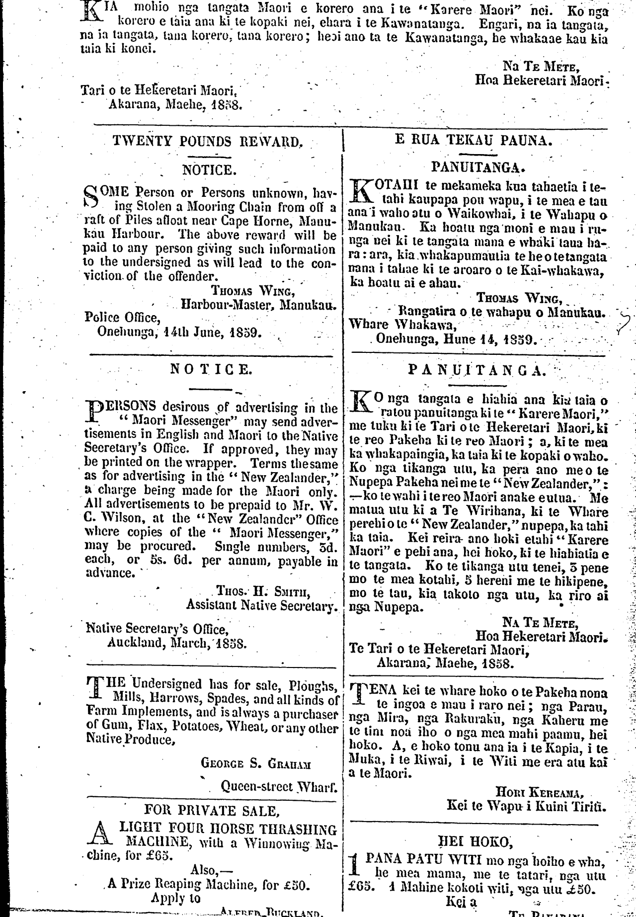KIA mohio nga tangata Maori e korero ana i te "Karere Maori " hei. Ko nga korero e taia ana ki te kopaki nei, ehara i te Kawanatanga. Engari, na ia tangata, na ia tangata, tana korero, tana korero; heoi ano ta te Kawanatanga, he whakaae kau kia taia ki konei. Na TE METE, Hoa Hekeretari Maori Tari o te Hekeretari Maori Akarana, Maehe, 1858. TWENTY POUNDS BE WARD. NOTICE. SOME Person or Persons unknown, hav- ing Stolen a Mooring Chain from off a raft of Piles afloat near Cape Horne, Manu- kau Harbour. The above reward will be paid to any person giving such information to the undersigned as will lead to the con- viction of the offender. THOMAS WING, Harbour-Master, Manukau. Police Office, Onehunga, 14th June, 1859, NOTICE. PERSONS desirous of advertising in the " Maori Messenger" may send adver- tisements in English and Maori to the Native Secretary's Office. If approved, they may be printed on the wrapper. Terms the same as for advertising in the " New Zealander," a charge being made for the Maori only. All advertisements to be prepaid to Mr. W. C. Wilson, at the "New Zealander" Office where copies of the " Maori Messenger," may be procured. Single numbers, 3d. each, or 5s. 6d. per annum, payable in advance. THOS. H. SMITH, Assistant Native Secretary. Native Secretary's Office, Auckland, March, 1838. THE Undersigned has for sale, Ploughs, Mills, Harrows, Spades, and all kinds of Farm Implements, and is always a purchaser of Gum, Flax, Potatoes, Wheat, or any other Native Produce, GEORGE S. GRAHAM Queen-street Wharf. FOR PRIVATE SALE, ALIGHT FOUR HORSE THRASHING MACHINE, with a Winnowing Ma- chine, for £63. Also,— A Prize Reaping Machine, for £30. Apply to —ALFRED BUCKLAND E RUA TEKAU PAUNA. PANUITANGA. KOTAHI te mekameka kua tahaetia i te- tahi kaupapa pou wapu, i te mea e tau ana i waho atu o Waikowhai, i te Wahapu o Manukau. Ka hoatu nga moni e mau i ru- nga nei ki te tangata mana e whaki taua ha- ra: ara, kia whakapumautia te he o te tangata nana i tahae ki te aroaro o te Kai-whakawa, ka hoatu ai e ahau. THOMAS WING, - Rangatira o te wahapu o Manukau. Whare Whakawa, Onehunga, Hune 14, 1859. PANUITANGA. EO nga tangata e hiahia ana kia taia o ratou panuitanga ki te " Karere Maori," me tuku ki te Tari o te Hekeretari Maori, ki te reo Pakeha ki te reo Maori; a, ki te mea ka whakapaingia, ka taia ki te kopaki o waho. Ko nga tikanga utu, ka pera ano me o te Nupepa Pakeha nei me te " New ZeaIander," ko te wahi i te reo Maori anake e utua. Me matua utu ki a Te Wirihana, ki te Whare perehi o te " New Zealander," nupepa, ka tahi ka taia. Kei reira ano hoki etahi " Karere Maori" e pehi ana, hei hoko, ki te hiahiatia e te tangata. Ko te tikanga utu tenei, 5 pene mo te mea kotahi, 5 hereni me te hikipene, mo te tau, kia takoto nga utu, ka riro ai nga Nupepa. NA TE METE, Hoa Hekeretari Maori. Te Tari o te Hekeretari Maori, Akarana, Maehe, 1858. TENA kei te whare hoko o te Pakeha nona te ingoa e mau i raro nei; nga Parau, nga Mira, nga Rakuraku, nga Kaheru me te tini noa iho o nga mea mahi paamu, hei hoko. A, e hoko tonu ana ia i te Kapia, i te Muka, i te Riwai, i te Witi me era atu kai a te Maori. HOKI KEREAMA, Kei te Wapu i Kuini Tiriti. HEI HOKO, I PANA PATU WITI mo nga hoiho e wha, he mea mama, me te tatari, nga utu .£65. 1 Mahine kokoti witi, nga utu 06 SO. Kei a