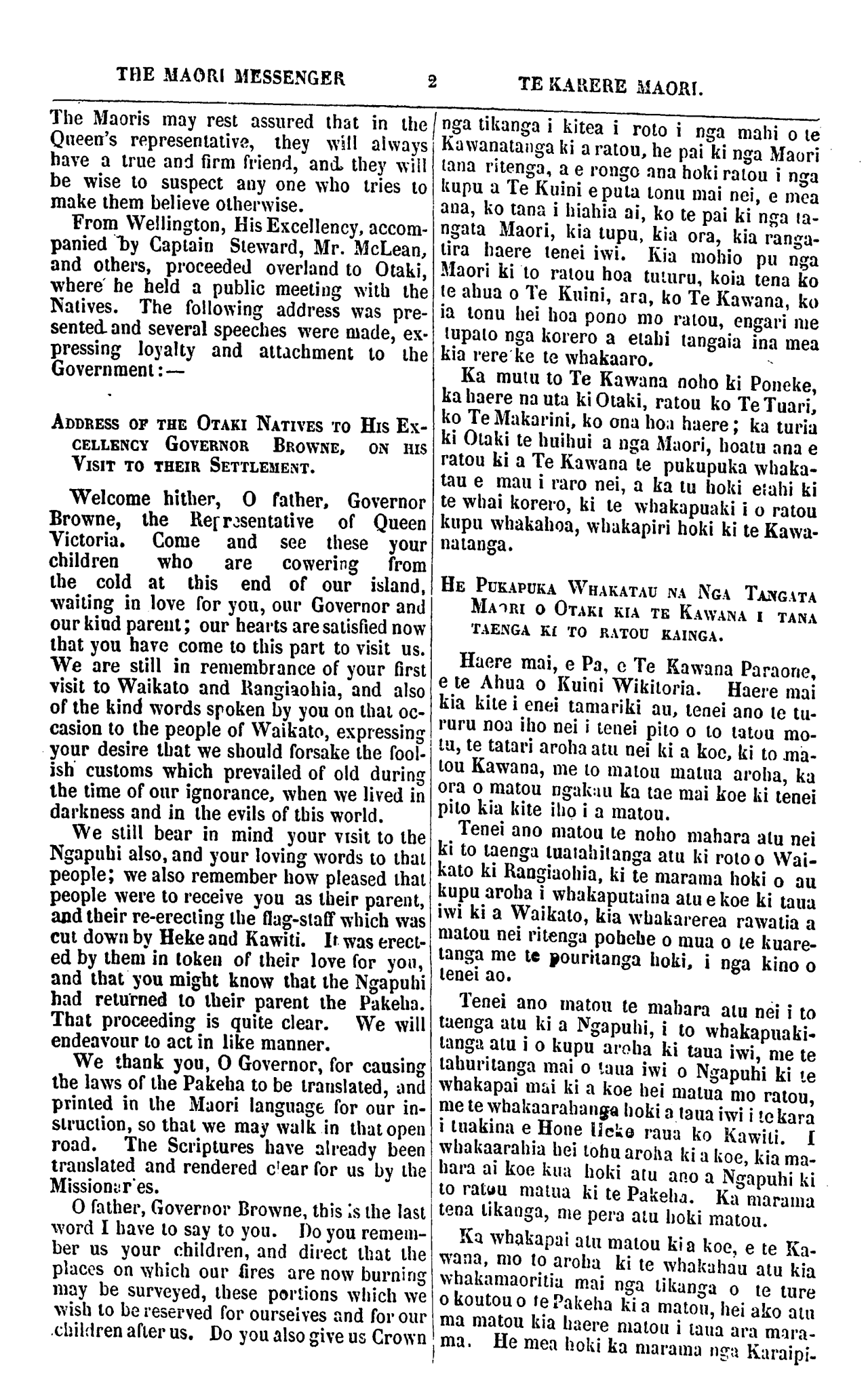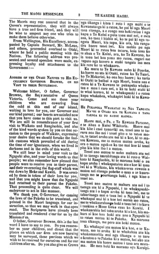 THE MAORI MESSENGER 2 TE KARERE MAORI. The Maoris may rest assured that in the Queen's representative, they will always have a true and firm friend, and they will be wise to suspect any one who tries to make them believe otherwise. From Wellington, His Excellency, accom- panied by Captain Steward, Mr. McLean, and others, proceeded overland to Otaki, where he held a public meeting with the Natives. The following address was pre- sented and several speeches were made, ex- pressing loyalty and attachment to the Government: ADDRESS OF THE OTAKI NATIVES TO HIS EX- CELLENCY GOVERNOR BROWNE. ON HIS VISIT TO THEIR SETTLEMENT. Welcome hither, 0 father, Governor Browne, the Representative of Queen Victoria. Come and see these your children who are cowering from the cold at this end of our island, wailing in love for you, our Governor and our kind parent; our hearts are satisfied now that you have come to this part to visit us. We are still in remembrance of your first visit to Waikato and Rangiaohia, and also of the kind words spoken by you on that oc- casion to the people of Waikato, expressing your desire that we should forsake the fool- ish customs which prevailed of old during the time of our ignorance, when we lived in darkness and in the evils of this world. We still bear in mind your visit to the Ngapuhi also, and your loving words to that people; we also remember how pleased that people were to receive you as their parent, and their re-erecting the flag-staff which was cut down by Heke and Kawiti. If was erect- ed by them in token of their love for you, and that you might know that the Ngapuhi had returned to their parent the Pakeha. That proceeding is quite clear. We will endeavour to act in like manner. We thank you, 0 Governor, for causing the laws of the Pakeha to be translated, and printed in the Maori language for our in- struction, so that we may walk in that open road. The Scriptures have already been translated and rendered clear for us by the Missionaries. 0 father, Governor Browne, this is the last word I have say to you. Do you remem- ber us your children, and direct that the places on which our fires are now burning may be surveyed, these portions which we wish to be reserved for ourselves and for our children after us. Do you also give us Crown nga tikanga i kitea i roto i nga mahi o te Kawanatanga ki a ratou, he pai ki nga Maori tana ritenga, a e rongo ana hoki ratou i nga kupu a Te Kuini e puta tonu mai nei, e mea ana, ko tana i hiahia ai, ko te pai ki nga ta- ngata Maori, kia tupu, kia ora, kia ranga- tira haere tenei iwi. Kia mohio pu nga Maori ki to ratou hoa tuturu, koia tena ko te ahua o Te Kuini, ara, ko Te Kawana, ko ia tonu hei hoa pono mo ratou, engari me tupato nga korero a etahi tangata ina mea kia rere ke te whakaaro. Ka mutu to Te Kawana noho ki Poneke, ka haere na uta ki Otaki, ratou ko Te Tuari, ko Te Makarini, ko ona hoa haere; ka turia ki Otaki te huihui a nga Maori, hoatu ana e ratou ki a Te Kawana te pukupuka whaka- tau e mau i raro nei, a ka tu hoki etahi ki te whai korero, ki te whakapuaki i o ratou kupu whakahoa, whakapiri hoki ki te Kawa- natanga. HE PUKAPUKA WHAKATAU NA NGA TANGATA MAORI O OTAKI KIA TE KAWANA I TANA TAENGA KI TO RATOU KAINGA. Haere mai, e Pa, e Te Kawana Paraone, e te Ahua o Kuini Wikitoria. Haere mai kia kite i enei tamariki au, tenei ano te tu- ruru noa iho nei i tenei pito o to tatou mo- tu, te tatari aroha atu nei ki a koe, ki to ma- tou Kawana, me to matou matua aroha, ka ora o matou ngakau ka tae mai koe ki tenei pito kia kite iho i a matou. Tenei ano matou te noho mahara atu nei ki to taenga tuatahitanga atu ki roto o Wai- kato ki Rangiaohia, ki te marama hoki o au kupu aroha i whakaputaina atu e koe ki taua iwi ki a Waikato, kia whakarerea rawatia a matou nei ritenga pohehe o mua o te kuare- tanga me te pouritanga hoki, i nga kino o tenei ao. Tenei ano matou te mahara atu nei i to taenga atu ki a Ngapuhi, i to whakapuaki- tanga atu i o kupu aroha ki taua iwi, me te tahuritanga mai o taua iwi o Ngapuhi ki te whakapai mai ki a koe hei matua mo ratou, me te whakaarahanga hoki a taua iwi i te kara i tuakina e Hone Heke raua ko Kawiti. I whakaarahia hei tohu aroha ki a koe, kia ma- hara ai koe kua hoki atu ano a Ngapuhi ki to ratuu matua ki te Pakeha. Ka marama tena tikanga, me pera atu hoki matou. Ka whakapai atu matou kia koe, e te Ka- wana, mo to aroha ki te whakahau atu kia whakamaoritia mai nga tikanga o te ture o koutou o te Pakeha ki a matou, hei ako atu ma matou kia haere matou i taua ara mara- ma. He mea hoki ka marama nga Karaipi-