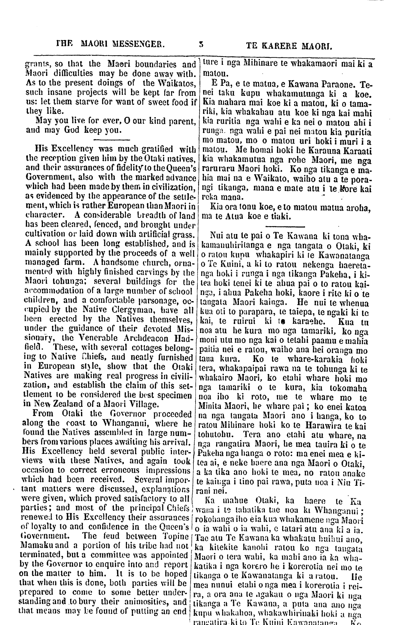 THE MAORI MESSENGER. TE KARERE MAORI. grants, so that the Maori boundaries and Maori difficulties may be done away with. As to the present doings of the Waikatos, such insane projects will be kept far from us: let them starve for want of sweet food if they like. May you live for ever, O our kind parent, and may God keep you. His Excellency was much gratified with the reception given him by the Otaki natives, and their assurances of fidelity to the Queen's Government, also with the marked advance which had been made by them in civilization, as evidenced by the appearance of the settle- ment, which is rather European than Maori in character. A considerable breadth of land has been cleared, fenced, and brought under cultivation or laid down with artificial grass. A school has been long established, and is mainly supported by the proceeds of a well managed farm. A handsome church, orna- mented with highly finished carvings by the Maori tohunga; several buildings for the accommodation of a large number of school children, and a comfortable parsonage, oc- cupied by the Native Clergyman, have all been erected by the Natives themselves, under the guidance of their devoted Mis- sionary, the Venerable Archdeacon Had- field. These, with several cottages belong- ing to Native chiefs, and neatly furnished in European style, show that the Otaki Natives are making real progress in civili- zation, and establish the claim of this set- tlement to be considered the best specimen in New Zealand of a Maori Village. From Otaki the Governor proceeded along the coast to Whanganui, where he found the Natives assembled in large num- bers from various places awaiting his arrival. His Excellency held several public inter- views with these Natives, and again took occasion to correct erroneous impressions which had been received. Several impor- tant matters were discussed, explanations were given, which proved satisfactory to all parties; and most of the principal Chiefs renewal to His Excellency their assurances of loyally to and confidence in the Queen's Government. The feud between Topine Mamaku and a portion of his tribe had not terminated, but a committee was appointed by the Governor to enquire into and report on the matter to him. lt is to be hoped that when this is done, both parties will be prepared to come to some better under- standing and to bury their animosities, and that means may be found of putting an end ture i nga Mihinare te whakamaori mai ki a matou. E Pa, e te matua, e Kawana Paraone. Te- nei taku kupu whakamutunga ki a koe. Kia mahara mai koe ki a matou, ki o tama- riki, kia whakahau atu koe ki nga kai mahi kia ruritia nga wahi e ka nei o matou ahi i runga nga wahi e pai nei matou kia puritia mo matou, mo o matou uri hoki i muri i a matou. Me homai hoki he Karauna Karaati kia whakamutua nga rohe Maori, me nga raruraru Maori hoki. Ko nga tikanga e ma- hia mai na e Waikato, waiho atu a te pora- ngi tikanga, mana e mate atu i te Kore kai reka mana. Kia ora tonu koe, e to matou matua aroha, ma te Atua koe e tiaki. Nui atu te pai o Te Kawana ki tona wha- kamanuhiritanga e nga tangata o Otaki, ki o ratou kupu whakapiri ki te Kawanatanga o Te Kuini, a ki to ratou nekenga haereta- nga hoki i runga i nga tikanga Pakeha, i ki- tea hoki tenei ki te ahua pai o to ratou kai- nga, i ahua Pakeha hoki, kaore i rite ki o te tangata Maori kainga. He nui te whenua kua oti to parapara, te taiepa, te ngaki ki te kai; te ruirui ki te karaehe. Kua tu noa atu he kura mo nga tamariki, ko nga moni utu mo nga kai o tetahi paamu e mahia paitia nei e ratou, waiho ana hei oranga mo taua kura. Ko te whare-karakia hoki tera, whakapaipai rawa na te tohunga ki te whakairo Maori, ko etahi whare hoki mo nga tamariki o te kura, kia tokomaha noa iho ki roto, me te whare mo te Minita Maori, he whare pai; ko enei katoa na nga tangata Maori ano i hanga, ko to ratou Mihinare hoki ko te Harawira te kai tohutohu. Tera ano etahi atu whare, na nga rangatira Maori, he mea tauira ki o te Pakeha nga hanga o roto: ma enei mea e ki- tea ai, e neke haere ana nga Maori o Otaki, a ka tika ano hoki te mea, no ratou anake te kainga i tino pai rawa, puta noa i Niu Ti- rani nei. Ka mahue Otaki, ka haere te Ka- wana i te tahatika tae noa ki Whanganui; rokohanga iho eia kua whakamene nga Maori o ia wahi o ia wahi, e tatari atu ana ki a ia. Tae atu Te Kawana ka whakatu huihui ano, ka kitekite kanohi ratou ko nga tangata Maori o tera wahi, ka mahi ano ia ka wha- katika i nga korero he i korerotia; a nei mo te tikanga o te Kawanatanga ki a ratou. He mea nunui etahi onga mea i korerotia i rei- ra, a ora ana te ngakau o nga Maori ki nga tikanga a Te Kawana, a puta ana ano nga kupu whakahoa, whakawhirinaki hoki a nga rangatira ki to Te Kuini Kawanatanga. Ko
