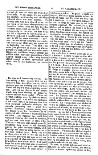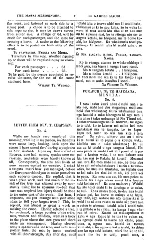 THE MAORI MESSENGER. TE KAKERE MAORI, the creek, and fastened on each side to a strong post. A canoe is to be attached to this rope so that it may be drawn across from either side. A charge of 6d. will be made for each passenger, and the same for crossing a horse. A notice to the following effect is to be posted on both sides of the creek. TO TRAVELLERS, PAKEHA AND MAORI. Travellers by this road, whether passing up or down will be required to pay for cross- ing. For each passenger . . . 6d. For each horse . . . . 6d. To be paid by the person appointed to re- ceive the same, for the use of the canoe stationed here. WIREMU TE WHEORO. LETTER FROM REV. T. CHAPMAN. No. 4. While my hands were employed this morning, working in my garden, my thoughts were more busy, looking back upon the scenes I have passed thro' during my sojourn in New Zealand. Upon my first arrival at Rotorua, axes had names, spades were cu- riosities, and adzes were hardly known at all, Consequently, the size and finish of your canoes excited my wonder. I asked a tangata maori how you managed, before the European visited you to make yourselves such superior canoes. He replied, that it was a great work, and that much of the in- side of the tree was cleared away by con- stantly using fire to consume it—but that care was required lest injury should be done to the outer part of the trunk. But how, I enquired, did you manage with your stone adzes to fell your largest trees? This, he replied, was almost as great a work as making the canoe. Having selected a tree, he continued, a large portion of the tribe, men, women and children, went in a body to the place whero the tree grew and there made an encampment. Having cleared away a space round the tree, and built tem- porary huts, the men by turns, worked with all their strenght, day after day, until tetahi taha o te awa whiti noa ki tetahi taha, whakamau ai ki te pou kaha, ko te waka ka herea ki taua taura kia tika ai te kukume atu te kukume mai, ko te ritenga utu mo te tangata kotahi, he hikipene, mo te hoiho ko- tahi, he hikipene. Ka whakaturia tenei pa- nuitanga ki tetahi taha ki tetahi taha o te awa. Ki NGA TANGATA HAERE, PAKEHA, TANGATA MAORI. Ko te ritenga utu mo te whakawhitinga i tenei awa, ana haere i runga i raro ranei. Mo te tangata kotahi . . 1 hikipene. Mo te hoiho kotahi . . 1 hikipene. Ko enei moni me utu ki te kai tango i nga moni, mo te waka kawaiho i konei. Na WIREMU TE WHEORO. PUKAPUKA NA TE HAPIMANA, MINITA. No. 4. I roto i taku kaari ahau o mahi ana i te ata nei, mahi ana aku ringaringa mahi ana hoki aku whakaaro; titiro whakamuri ana nga kanohi a toku hinengaro ki nga mea i kite ai au i taku nohoanga ki Niu Tirani nei. I toku orokotaenga mai ki Rotorua, he ingoa to te toki, ko te kaheru nei waiho hei mea matakitaki ma te tangata, ko te kapu- kapu nei, aue! ko wai kua kite i tera mea? Na reira, miharo ana au i reira ki te nunui ki to papai o a koutou waka, kimihia ana e toku whakaaro; ka ui atu au ki tetahi o nga tangata Maori, He mea pehea te mahi i oti ai i penei ai te pa- pai a komou waka, i te mea kahore ano kia tae mai te. Pakeha ki konei? Mea mai ana tera, He mea mahi nui ano, he mea tahu ki te ahi hei whakahakaro i te riu o te waka. otira, he mea ata tahutahu, me tupata tonu te kai tahu kei tino kai te ahi, kei puta kei te papa. Ka mea atu au, He mea pehea ta koutou tua i nga rakau nunui ki a koutou tuki kohatu ra? Ka mea mai tera; Wahiiti ka rite tenei mahi ki to tarainga o te waka, te nui. Ko la matou tenei, tirohia ana tetahi rakau pai, ka haere te nuinga o te hapu, nga tane, nga wahine me nga tamariki ki te wahi i tu ai taua rakau ta noho ai; para ana e ratou te whenua i tetahi taha i tetahi taha i te putake o te rakau, ka hanga i nga wha- rau ki reira. Katahi ka whakaputaina te kaha o nga taane ki te tua i te rakau ra, ka ngenge etahi ha haere atu etahi, penei tonu, a, ngoto noa, katahi ka tahuna ki te ahi, a ka ngoto te kai a te ahi, ka akina ano ko nga toki kohatu, muri iho ko te ahi, muri iho ko te toki, penei tonu, a