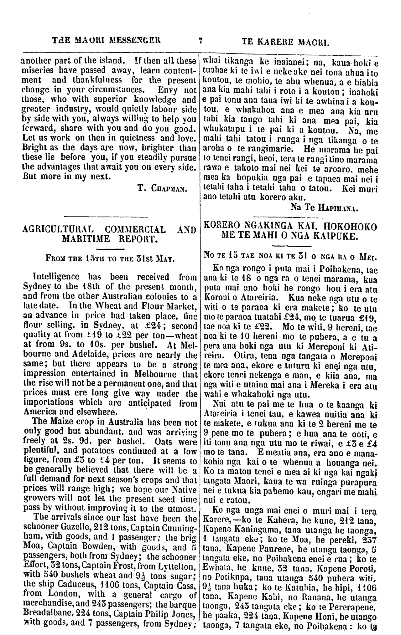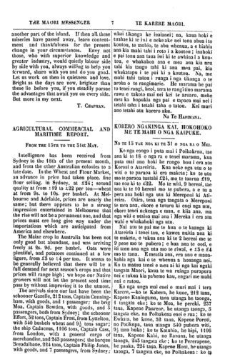 THE MAORI MESSENGER TE KARERE MAORI. another part of the island. If then all these miseries have passed away, learn content- ment and thankfulness for the present change in your circumstances. Envy not those, who with superior knowledge and greater industry, would quietly labour side by side with you, always willing to help you forward, share with you and do you good. Let us work on then in quietness and love. Bright as the days are now, brighter than these lie before you, if you steadily pursue the advantages that await you on every side. But more in my next. T. CHAPMAN. AGRICULTURAL COMMERCIAL AND MARITIME REPORT. FROM THE 15TH TO THE 51st MAY. Intelligence has been received from Sydney to the 18th of the present month, and from the other Australian colonies to a late date. In the Wheat and Flour Market, an advance in price had taken place, fine flour selling, in Sydney, at £24; second quality at from £19 to £22 per ton—wheat at from 9s. to 10s. per bushel. At Mel- bourne and Adelaide, prices are nearly the same; but there appears to be a strong impression entertained in Melbourne that the rise will not be a permanent one, and that prices must ere long give way under the importations which are anticipated from America and elsewhere. The Maize crop in Australia has been not only good but abundant, and was arriving freely at 2s. 9d. per bushel. Oats were plentiful, and potatoes continued at a low figure, from £3 to £4 per ton. It seems to be generally believed that there will be a full demand for next season's crops and that prices will range high; we hope our Native growers will not let the present seed time pass by without improving it to the utmost. The arrivals since our last have been the schooner Gazelle, 212 tons, Captain Cunning- ham, with goods, and 1 passenger; the brig Moa, Captain Bowden, with goods, and 5 passengers, both from Sydney; the schooner Effort, 52 tons, Captain Frost, from Lyttelton, with 540 bushels wheat and 9½ tons sugar; the ship Caduceus, 1106 tons, Captain Cass, from London, with a general cargo of merchandise, and 243 passengers; the barque Breadalbane, 224 tons, Captain Philip Jones, with goods, and 7 passengers, from Sydney; whai tikanga ke inaianei; na, kaua hoki e tuahae ki te iwi e neke ake nei tona ahua ito koutou, te mohio, te ahu whenua, a e hiahia ana kia mahi tahi i roto i a koutou; inahoki e pai tonu ana taua iwi ki te awhina i a kou- tou, e whakahoa ana e mea ana kia uru tahi kia tango tahi ki ana mea pai, kia whakatapu i te pai ki a koutou. Na, me mahi tahi tatou i runga i nga tikanga o te aroha o te rangimarie. He marama he pai to tenei rangi, heoi, tera te rangi tino marama rawa e takoto mai nei kei te aroaro, mehe mea ka hopukia nga pai e tapaea mai nei i tetahi taha i tetahi taha o tatou. Kei muri ano tetahi atu korero aku. Na Te HAPIMANA. KORERO NGAKINGA KAI. HOKOHOKO ME TE MAHI O NGA KAIPUKE. NO TE 15 TAE NOA KI TE 51 O NGA RA O MEI. Ko nga rongo i puta mai i Poihakena, tae ana ki te 18 o nga ra o tenei marama, kua puta mai ano hoki he rongo hou i era atu Koroni o Atareiria. Kua neke nga utu o te witi o te paraoa ki era makete; ko te utu mo te paraoa tuatahi, £24, mo te tuarua £19, tae noa ki te £22. Mo te witi, 9 hereni, tae noa ki te 10 hereni mo te puhera, a e tu a pera ana hoki nga utu ki Mereponi ki Ati- reira. Otira, tena nga tangata o Mereponi te mea ana, ekore e tuturu ki enei nga utu, ekore tenei nekenga e mau, e kiia ana, ma nga witi e utaina mai ana i Mereka i era atu wahi e whakahoki nga utu. Nui atu te pai me te hua o te kaanga ki Atareiria i tenei tau, e kawea nuitia ana ki te makete, e tukua ana ki te 2 hereni me te 9 pene mo te puhera; e hua ana te ooti, e iti tonu ana nga utu mo te riwai, e £5 e £4 mo te tana. E meatia ana, era ano e mana- kohia nga kai o te whenua a houanga nei. Ko ta matou tenei e mea ai ki nga kai ngaki tangata Maori, kaua te wa ruinga purapura nei e tukua kia pahemo kau; engari me mahi nui e ratou. Ko nga unga mai enei o muri mai i tera Karere,—ko te Kahera, he kune, 212 tana, Kapene Kaningama, tana utanga he taonga, 1 tangata eke; ko te Moa, he pereki, 257 tana, Kapene Paurene, he utanga taonga, 5 tangata eke, no Poihakena enei e rua; ko te Ewhata, he kune, 52 tana, Kapene Poroti, no Potikupa, tana utanga 540 puhera witi, 9½ tana huka; ko te Katuhia, he hipi, 1106 tana, Kapene Kahi, , no Ranana, he utanga taonga, 245 tangata eke; ko te Pererapene, he paaka, 224 tana. Kapene Honi, he utango taonga, 7 tangata eke, no Poihakena: ko ta