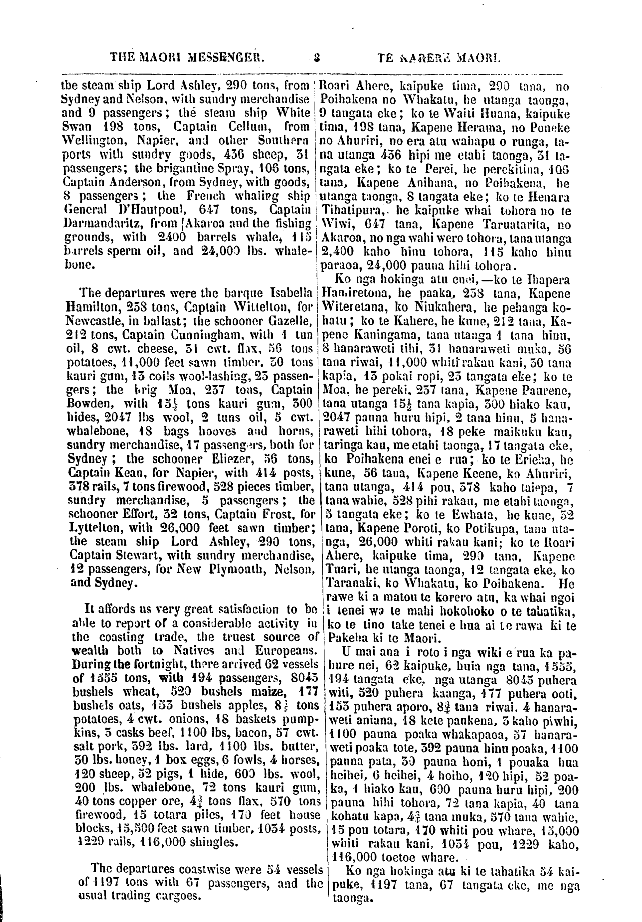 THE MAORI MESSENGER. 8 TE KARERE MAORI. the steam ship Lord Ashley, 290 tons, from Sydney and Nelson, with sundry merchandise and 9 passengers; the steam ship White Swan 198 tons, Captain Cellum, from Wellington, Napier, and other Southern ports with sundry goods, 456 sheep, 51 passengers; the brigantine Spray, 106 tons, Captain Anderson, from Sydney, with goods, 8 passengers; the French whaling ship General D'Hautpon!, 647 tons, Captain Darmandaritz, from Akaroa and the fishing grounds, with 2400 barrels whale 115 barrels sperm oil, and 24, 000 Ibs. whale- bone. The departures were the barque Isabella Hamilton, 258 tons, Captain Wittelton, for Newcastle, in ballast; the schooner Gazelle, 212 tons, Captain Cunningham, with 1 tun oil, 8 cwt. cheese, 51 cwt. flax, 56 tons potatoes, 11, 000 feel sawn timber. 30 tons kauri gum, 15 coils wool-lashing, 25 passen- gers; the brig Moa, 257 tons, Captain Bowden, with 15½ tons kauri gum, 500 hides, 2 047 Ibs wool, 2 tuns oil, 5 cwt. whalebone, 18 bags hooves and horns, sundry merchandise, 17 passengers, both for Sydney; the schooner Eliezer, 56 tons, Captain Kean, for Napier, with 414 posts, 578 rails, 7 tons firewood, 528 pieces timber, sundry merchandise, 5 passengers; the schooner Effort, 52 tons, Captain Frost, for Lyttelton, with 26, 000 feel sawn timber; Ihe steam ship Lord Ashley, 290 tons, Captain Stewart, with sundry merchandise, 12 passengers, for New Plymouth, Nelson, and Sydney. It affords us very great satisfaction to be able to report of a considerable activity in the coasting trade, the truest source of wealth both to Natives and Europeans. During me fortnight, there arrived 62 vessels of 1555 tons, with 194 passengers, 8045 bushels wheat, 520 bushels maize, 177 bushels oats, -133 bushels apples, 8 tons potatoes, 4 cwt. onions, 18 baskets pump- kins, 5 casks beef. 1100 Ibs, bacon, 57 cwt. salt pork, 592 Ibs. lard, 1100 Ibs. butter, 50 Ibs. honey, 1 box eggs, 6 fowls, 4 horses, 120 sheep, 52 pigs, 1 hide, 600 Ibs. wool, 200, Ibs. whalebone, 72 tons kauri gum, 40 tons copper ore, 4¾ tons flax, 570 tons firewood, 15 totara piles, 170 feet house blocks, 15, 500 feet sawn timber, 1034 posts, 1229 rails, 116, 000 shingles. The departures coastwise were 54 vessels of 1197 tons with 07 passengers, and the usual trading cargoes. Roari Ahere, kaipuke tima, 200 tana, no Poihakena no Whakatu, he utanga taonga, 9 tangata eke; ko te Waiti Huana, kaipuke lima, 198 tana, Kapene Herama, no Poneke no Ahuriri, no era atu wahapu o runga, ta- na utanga 456 hipi me etahi taonga, 31 ta- ngata eke; ko te Perei, he perekitina, 106 tana, Kapene Anihana, no Poihakena, he utanga taonga, 8 tangata eke; ko te Henara Tihatipura, he kaipuke whai tohora no te Wiwi, 647 tana, Kapene Taruatarita, no Akaroa, no nga wahi wero tohora, tana utanga 2, 400 kaho hinu tohora, 115 kaho hinu paraoa, 24, 000 pauna hihi tohora. Ko nga hokinga atu enei, —ko te Ihapera Hanairetona, he paaka, 258 tana, Kapene Witeretana, ko Niukahera, he pehanga ko- hatu; ko te Kahere, he kune, 212 tana, Ka- pene Kaningama, tana utanga 1 tana hinu, 8 hanaraweti tihi, 51 hanaraweti muka, 56 tana riwai, 11, 000 whiti rakau kani, 50 tana kapia, 13 pokai ropi, 23 tangata eke; ko te Moa, he pereki, 257 tana, Kapene Paurene, tana utanga 15½ tana kapia, 500 hiako kau, 2047 pauna hum hipi, 2 tana hinu, 5 hana- raweti hihi tohora, 18 peke maikuku kau, taringa kau, me etahi taonga, 17 tangata eke, ko Poihakena enei e rua; ko te Erieha, he kune, 56 tana, Kapene Keene, ko Ahuriri, tana utanga, 414 pou, 378 kaho taiepa, 7 tana wahie, 528 pihi rakau, me etahi taonga, 5 tangata eke; ko te Ewhata, he kune, 52 tana, Kapene Poroti, ko Potikupa, tana ma- nga, 26, 000 whiti rakau kani; ko te Roari Ahere, kaipuke tima, 290 tana. Kapene Tuari, he manga taonga, 12 tangata eke, ko Taranaki, ko Whakatu, ko Poihakena. He rawe ki a matou te korero atu, ka what ngoi i tenei wa te mahi hokohoko o te tahatika, ko te tino take tenei e hua ai te rawa ki te Pakeha ki te Maori. U mai ana i roto i nga wiki e rua ka pa- hure nei, 6-2 kaipuke, huia nga tana, 1555, 194 tangata eke, nga utanga 8043 puhera witi, 520 puhera kaanga, 177 puhera ooti, 155 puhera aporo, 8¾ tana riwai, 4 hanara- weti aniana, 18 kete paukena, 5 kaho piwhi, 1100 pauna poaka whakapaoa, 57 hanara- weti poaka tote, 592 pauna hinu poaka, 1 100 pauna pata, 50 pauna honi, 1 pouaka hua heihei, 6 heihei, 4 hoiho, 120 hipi, 52 poa- ka, 1 hiako kau, 690 pauna huru hipi, 200 pauna hihi tohora. 72 tana kapia, 40 Iana kohatu kapa, 4¾ tana muka, 570 tana wahie, 15 pou totara, 170 whiti pou whare, 13, 000 whiti rakau kani, 1034 pou, 1229 kaho, 116, 000 toetoe whare. Ko nga hokinga atu ki te tahatika 54 kai- puke, 1197 tana, 07 tangata eke, me nga taonga.